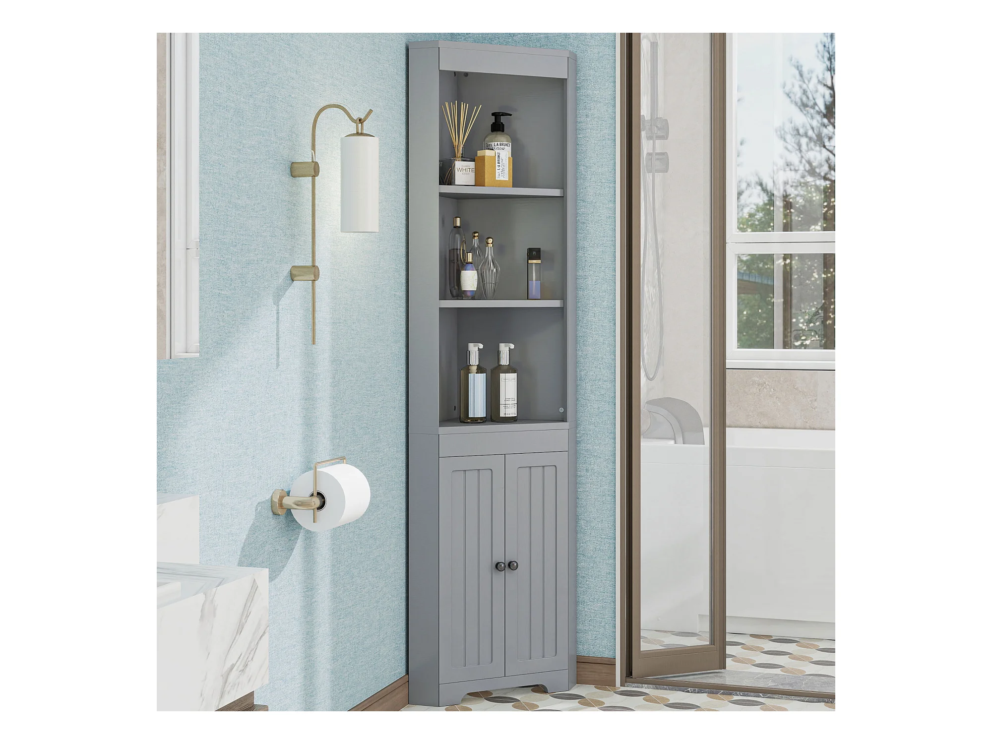 Meuble de salle de bain triangulaire 36.5x24.5x170 cm - 3 compartiments ouverts - 2 portes - gris