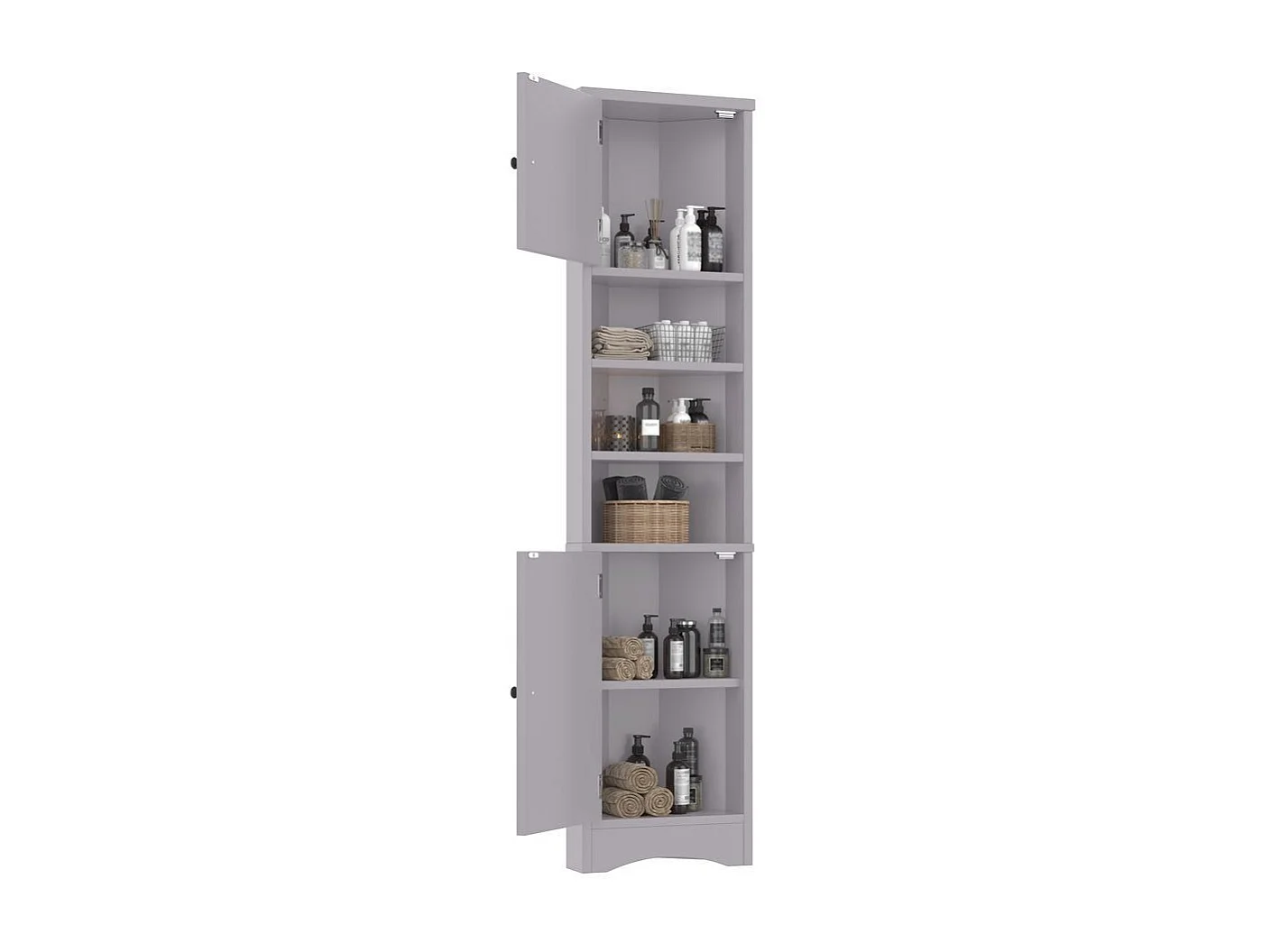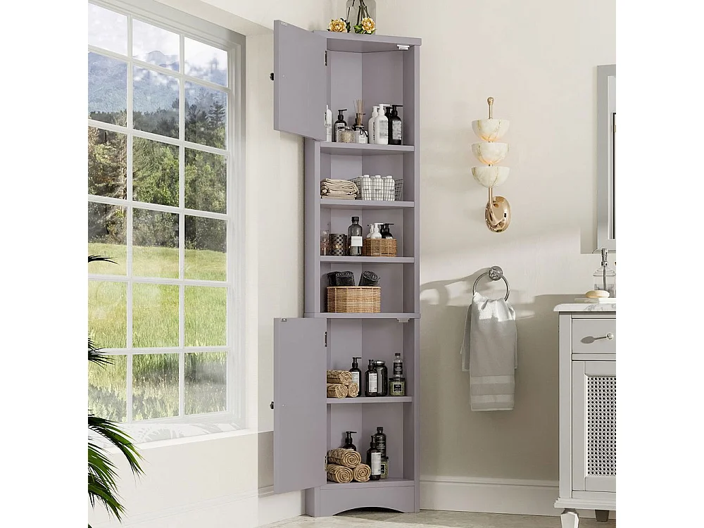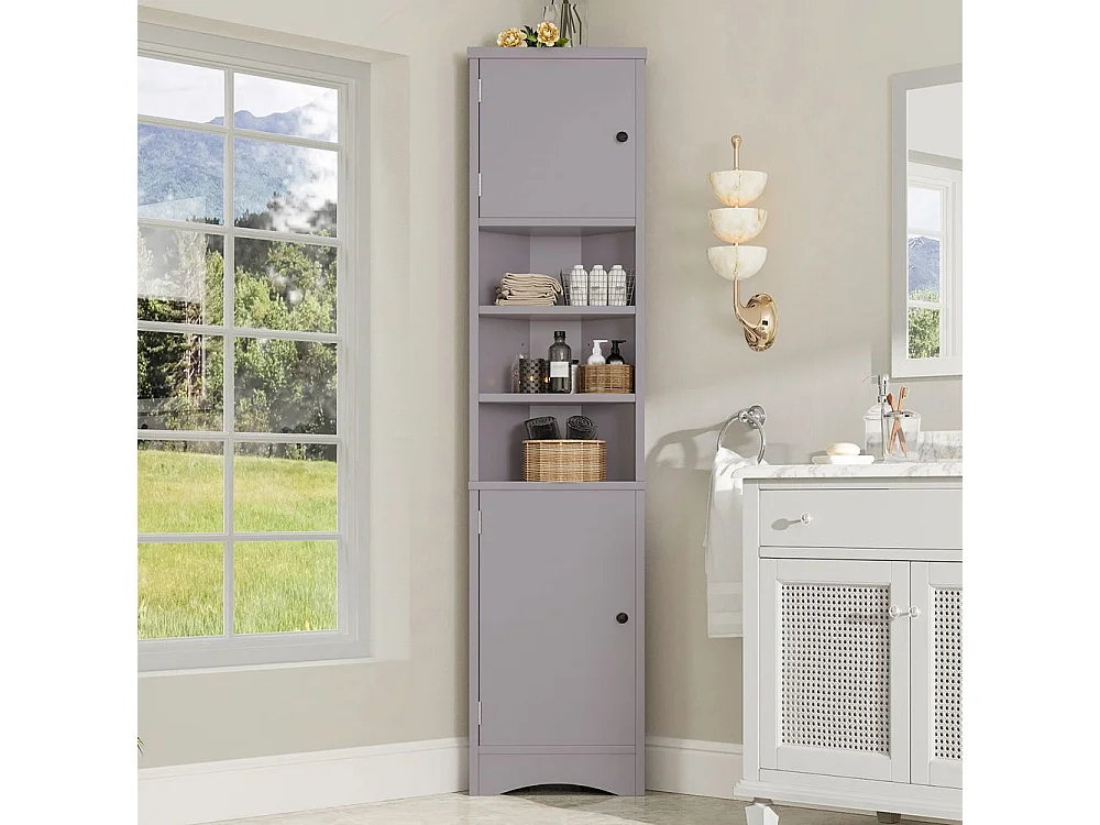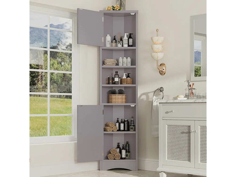 Meuble de salle de bain triangulaire 36.5x24.5x170 cm - 3 compartiments ouverts - 2 portes - gris