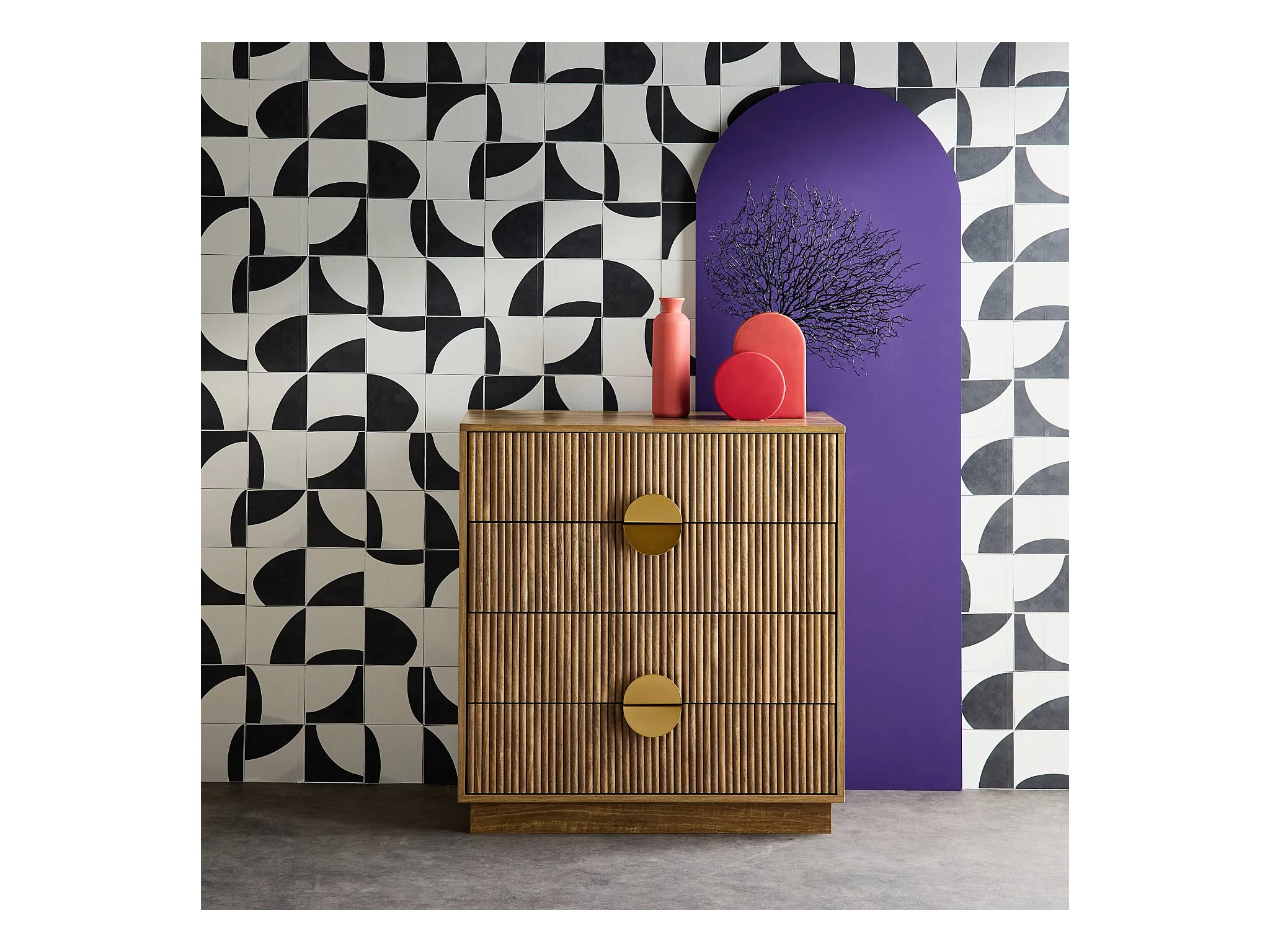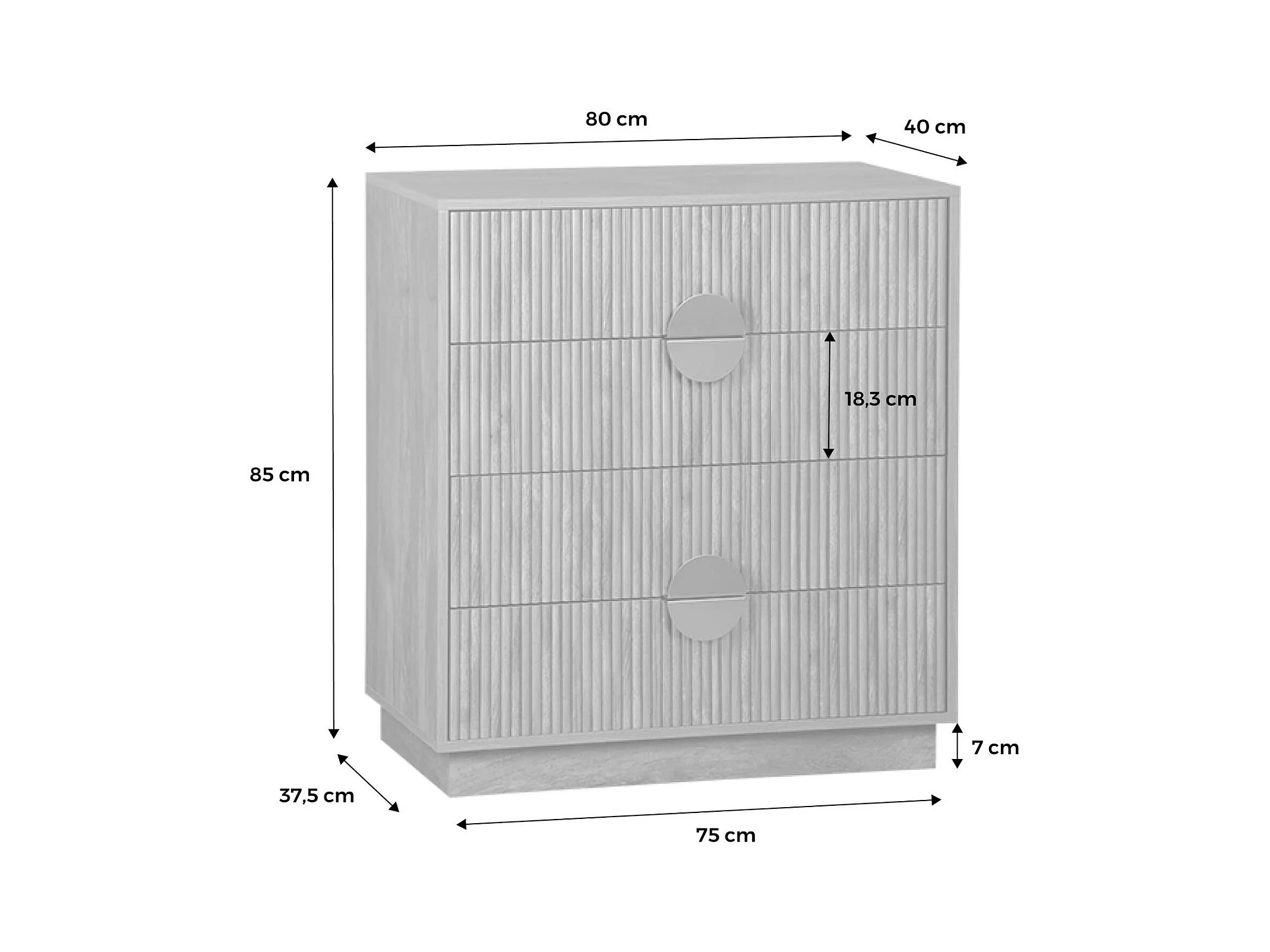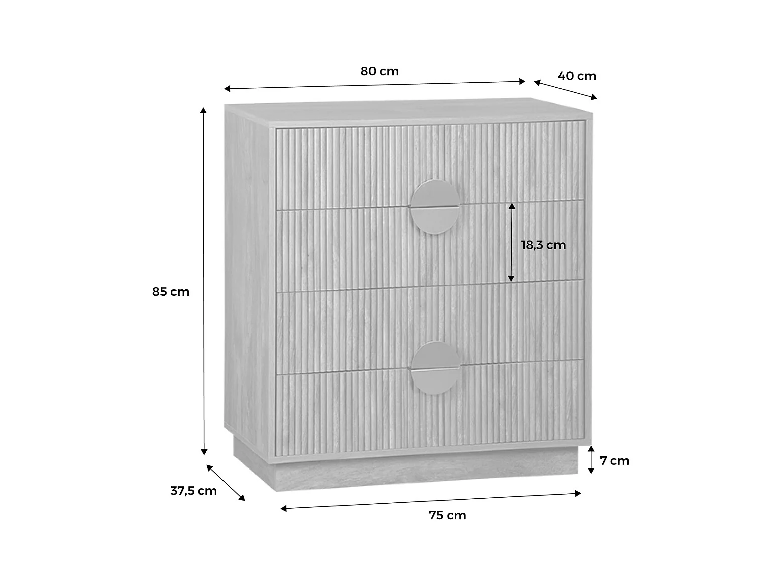 Commode 4 tiroirs décor bois de manguier rainuré. poignées en métal doré. L80 x P40 x H85cm