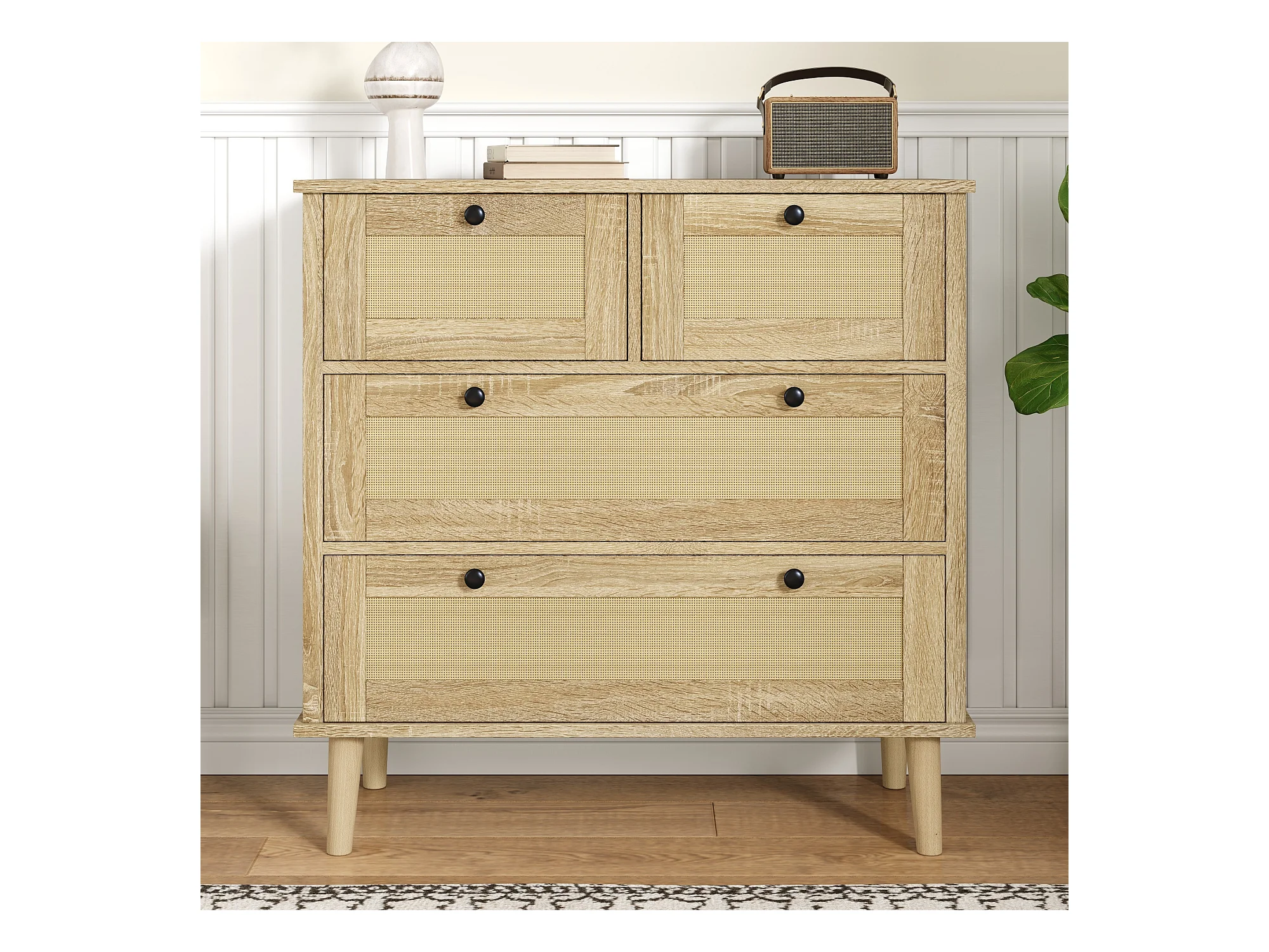Commode 4 tiroirs avec tiroirs rotin et pieds bois massif, pour chambre à coucher, salon, 80x80x40cm