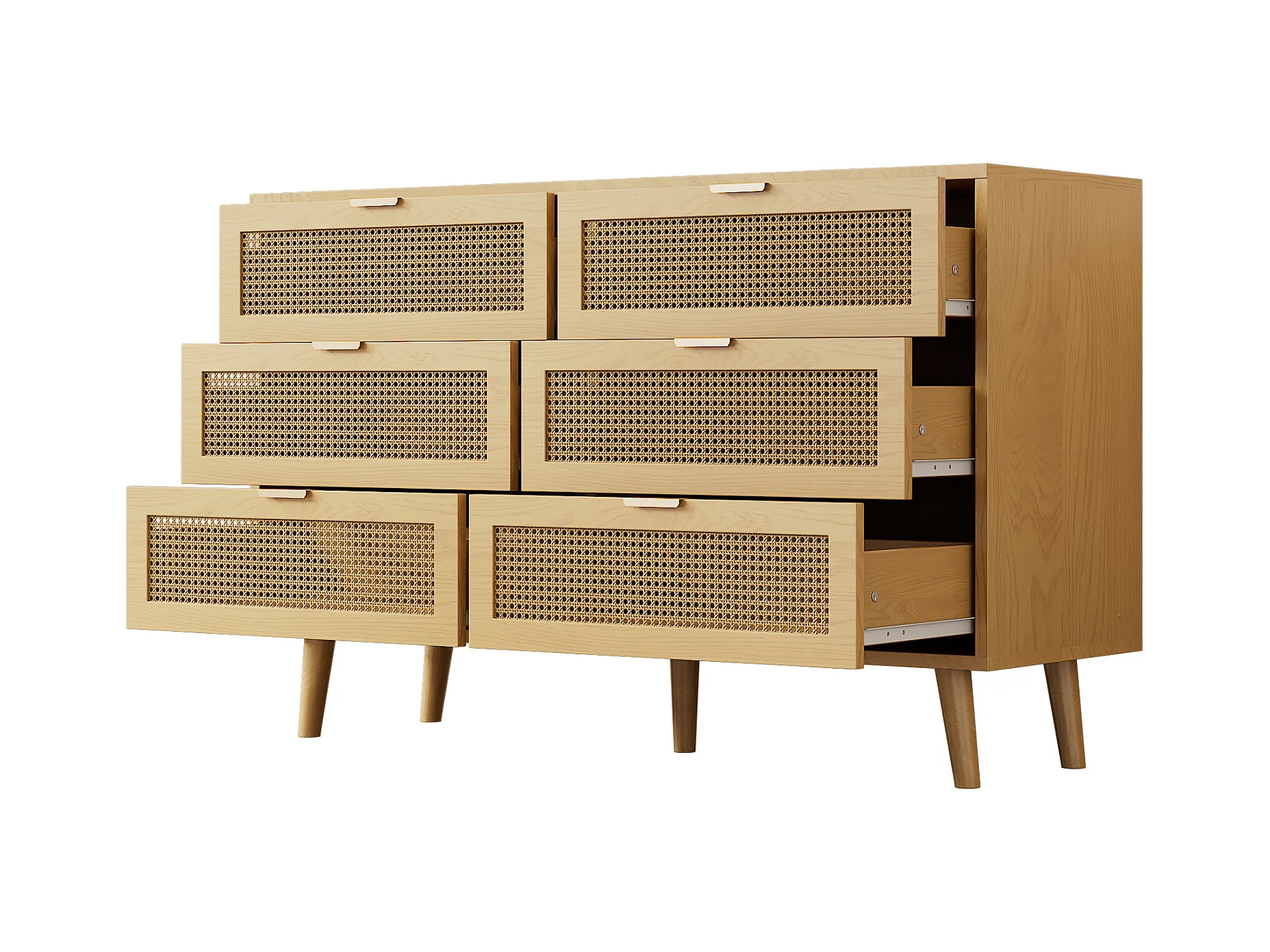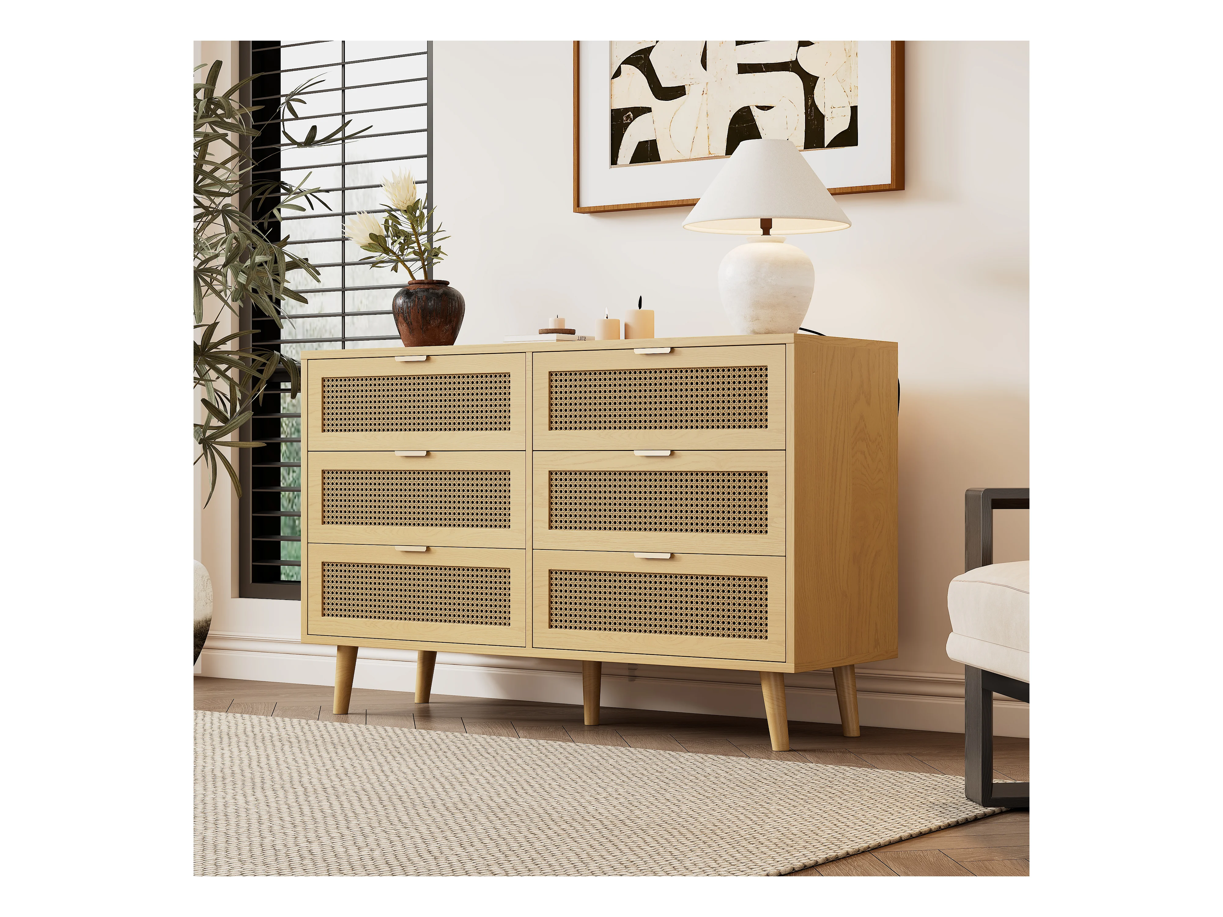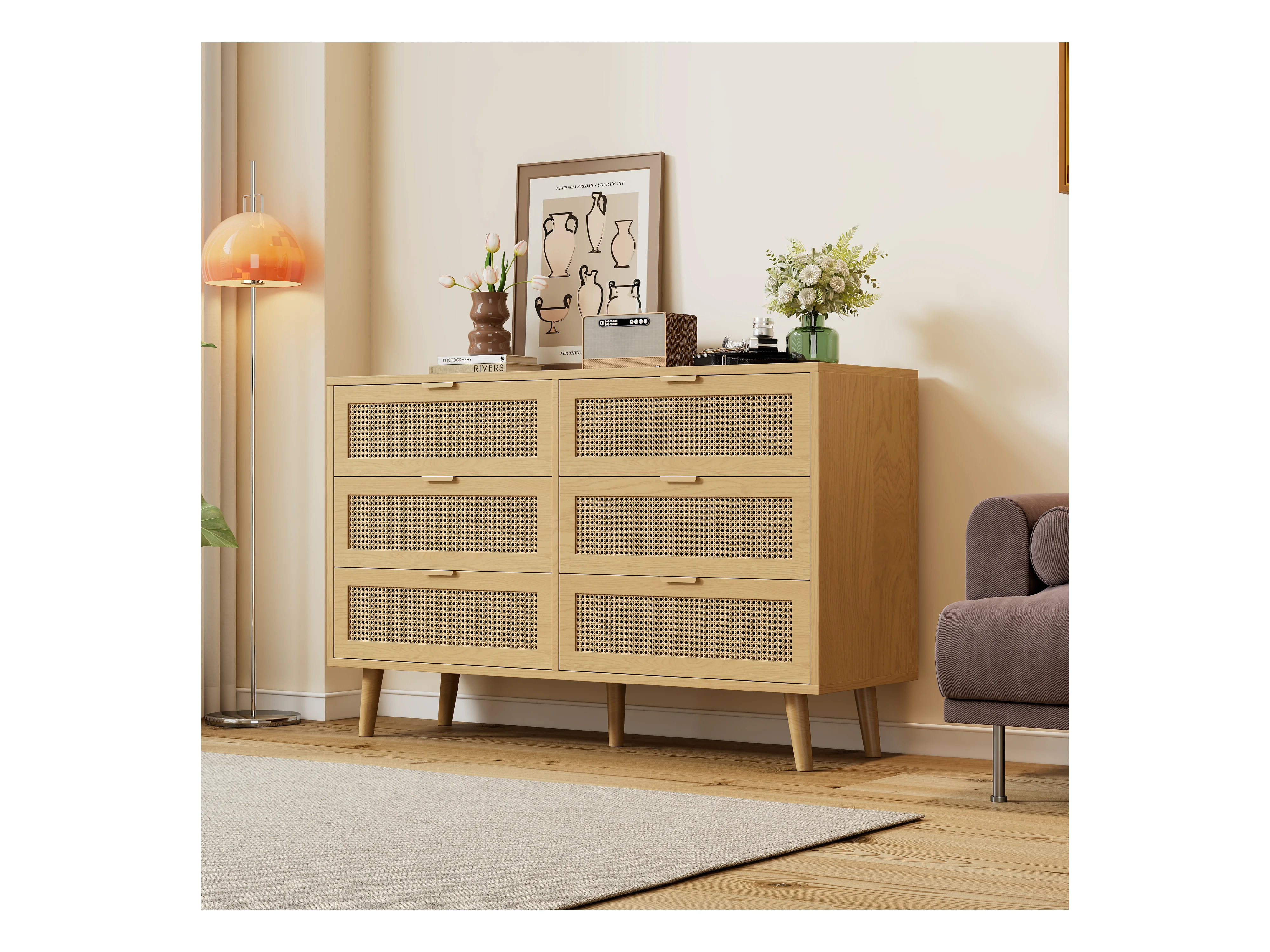 Commode avec 6 tiroirs en rotin - 120 x 40 x 76.5 cm - Panneau de particules + poignées en métal - Chêne