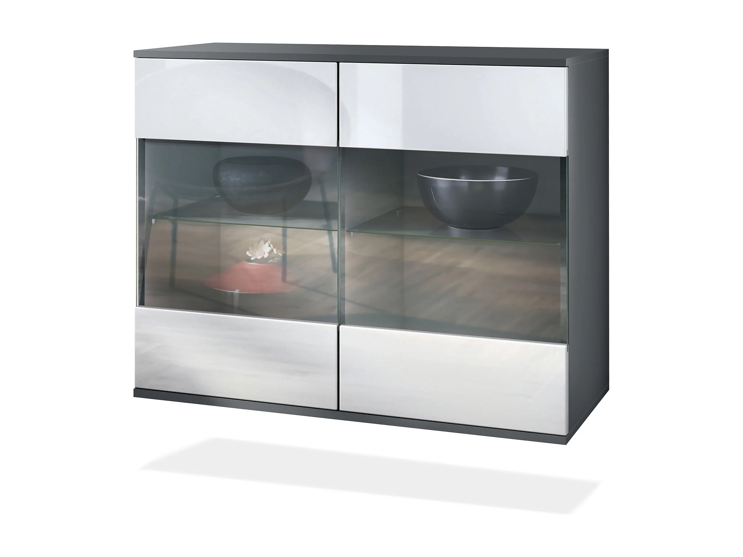 Commode Bari V3, Armoire de cuisine moderne avec 2 grandes portes vitrées anthracite mat / blanc haute brillance (92,5 x 73.5 x 35)