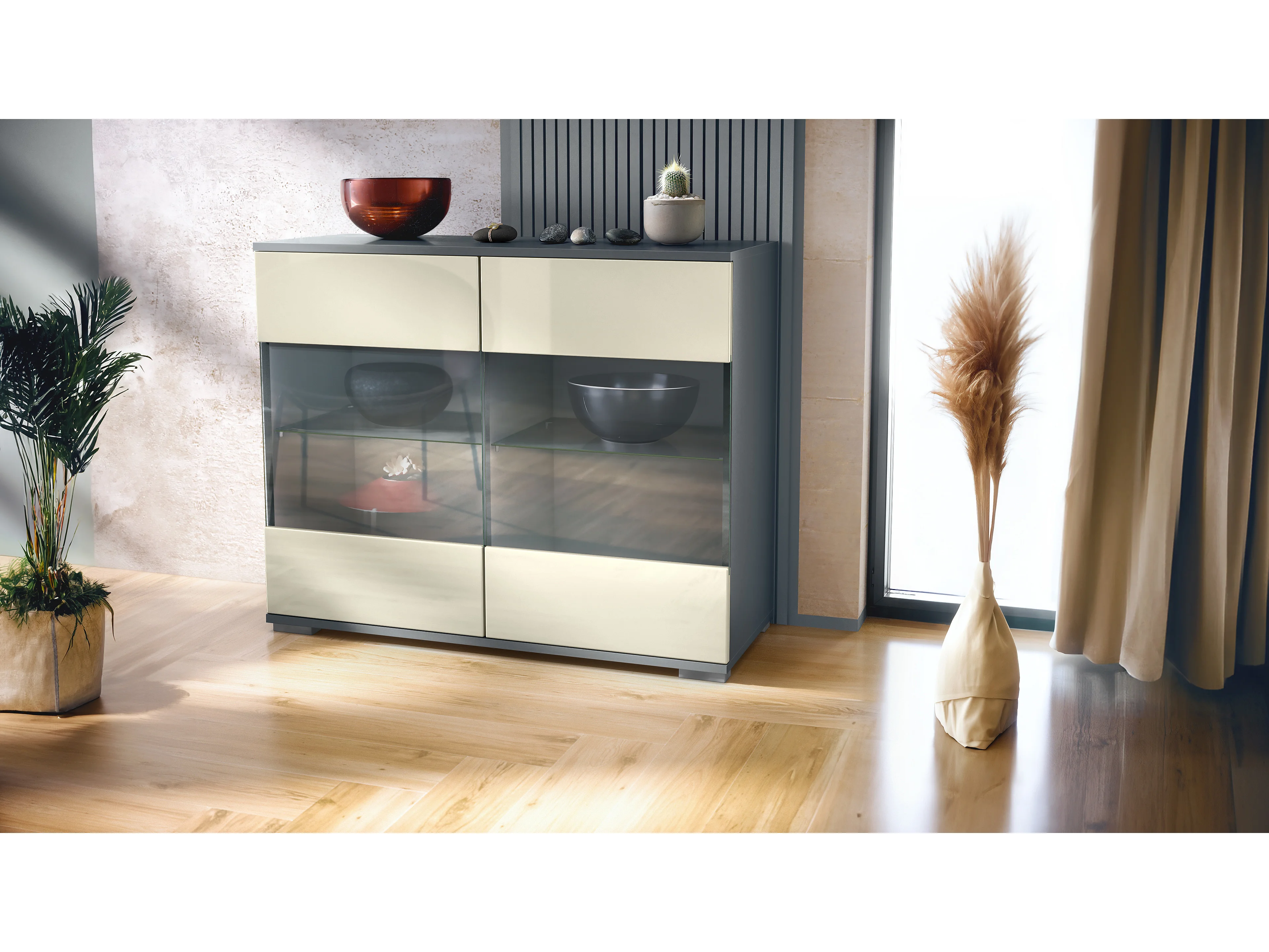 Commode Bari V3, Armoire de cuisine moderne avec 2 grandes portes vitrées anthracite mat / crème haute brillance (92,5 x 75.5 x 35)