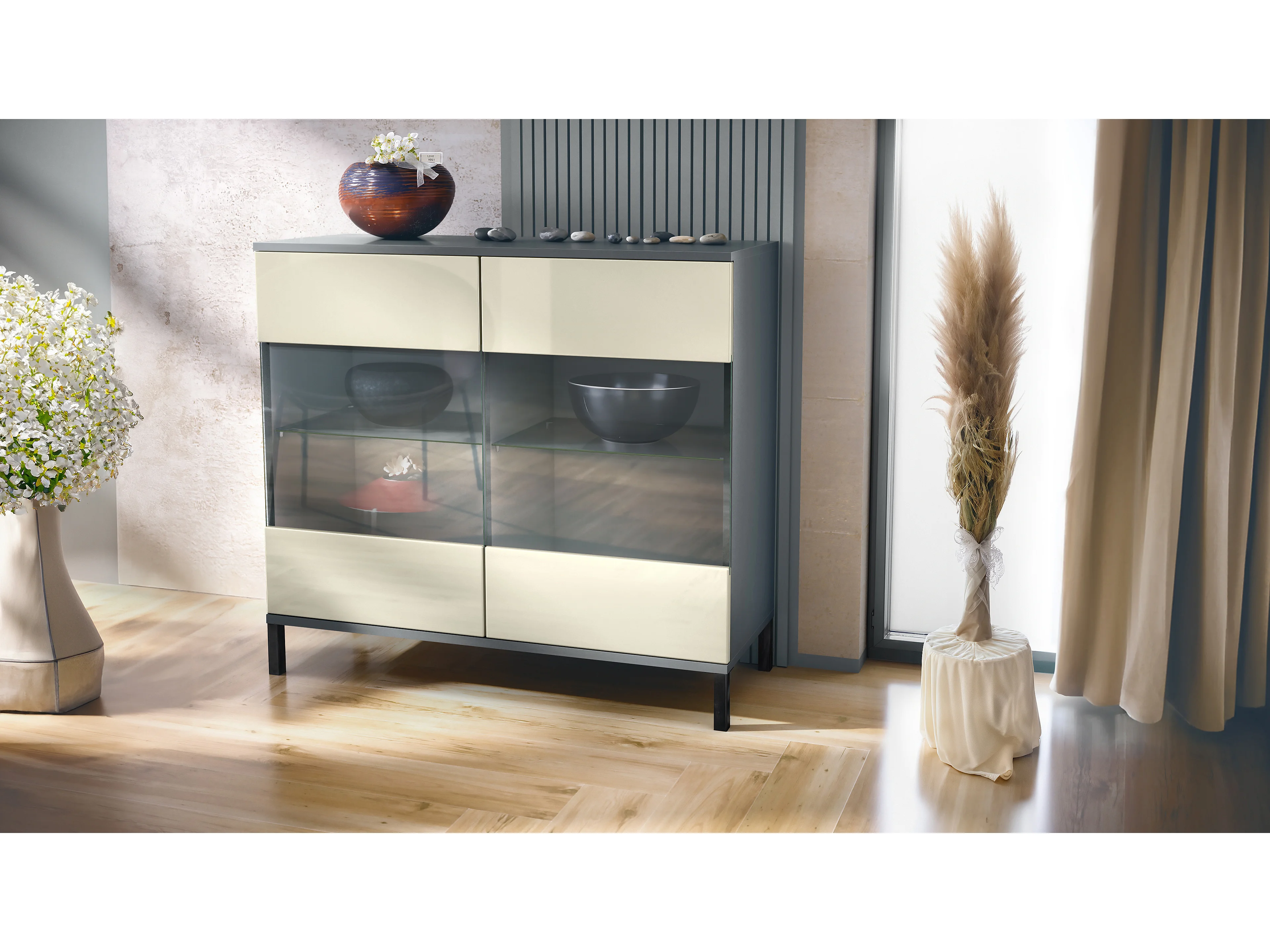 Commode Bari V3, Armoire de cuisine moderne avec 2 grandes portes vitrées anthracite mat / crème haute brillance (92,5 x 83.5 x 35)
