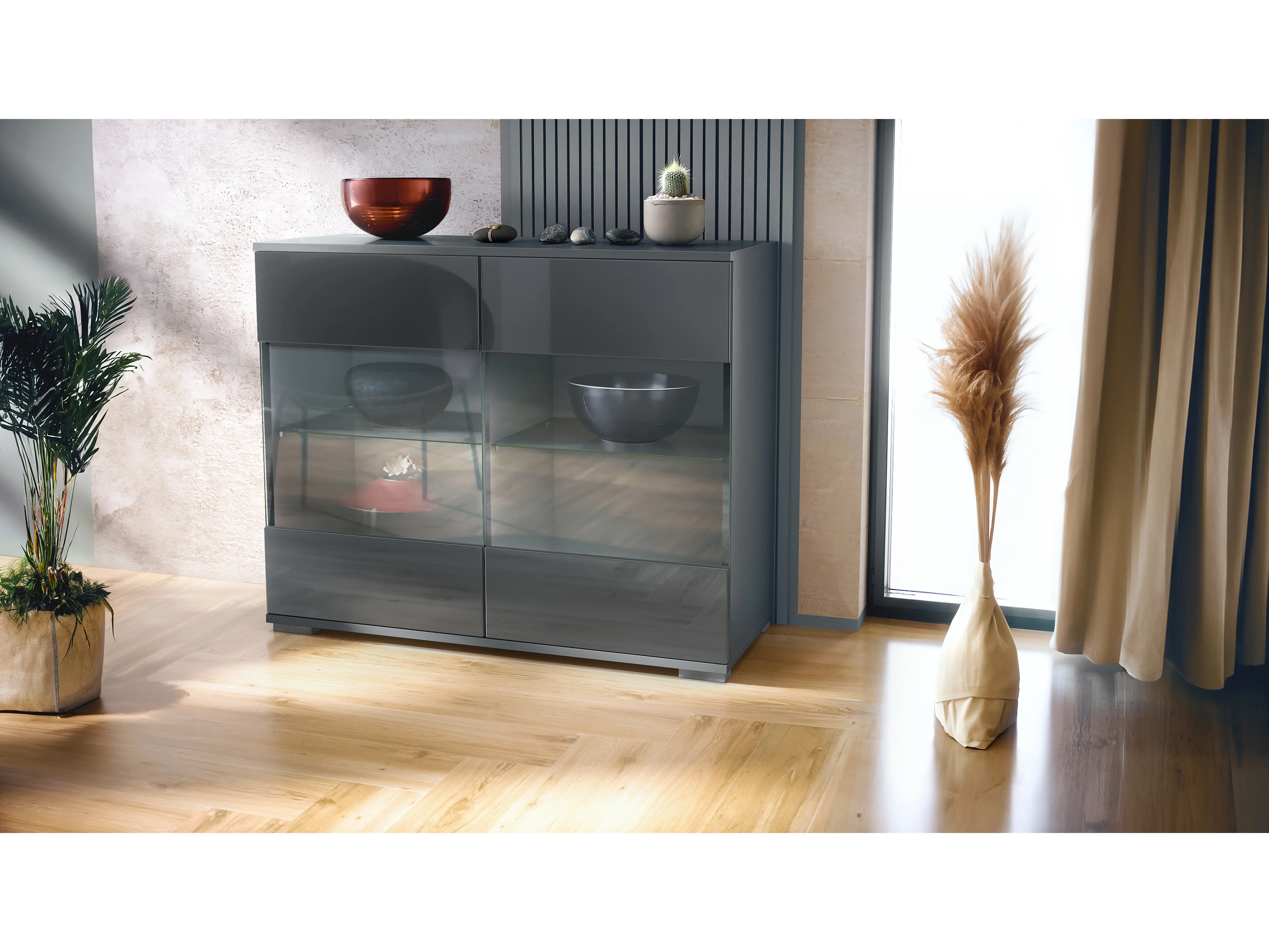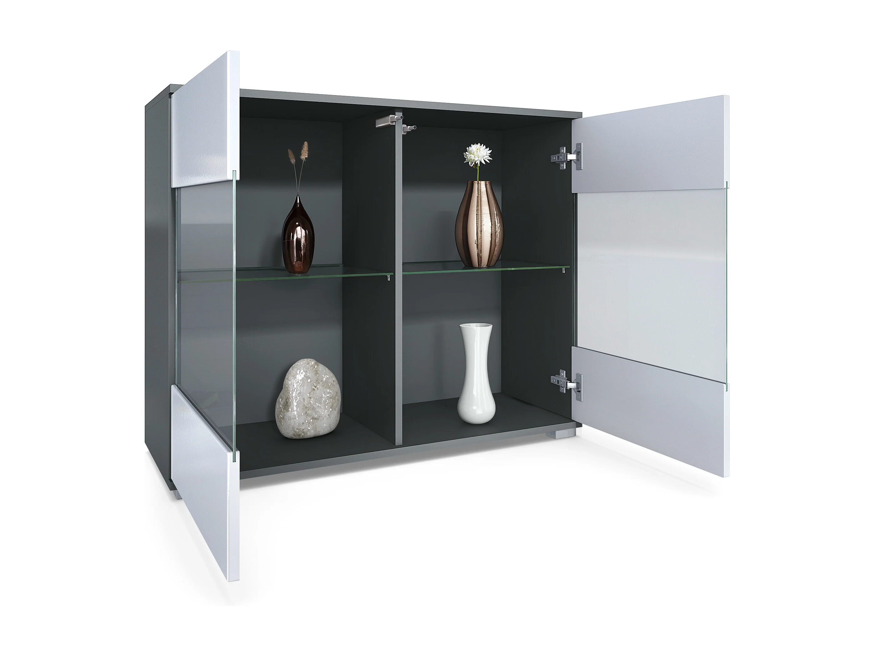Commode Bari V3, Armoire de cuisine moderne avec 2 grandes portes vitrées anthracite mat / gris haute brillance (92,5 x 75.5 x 35)