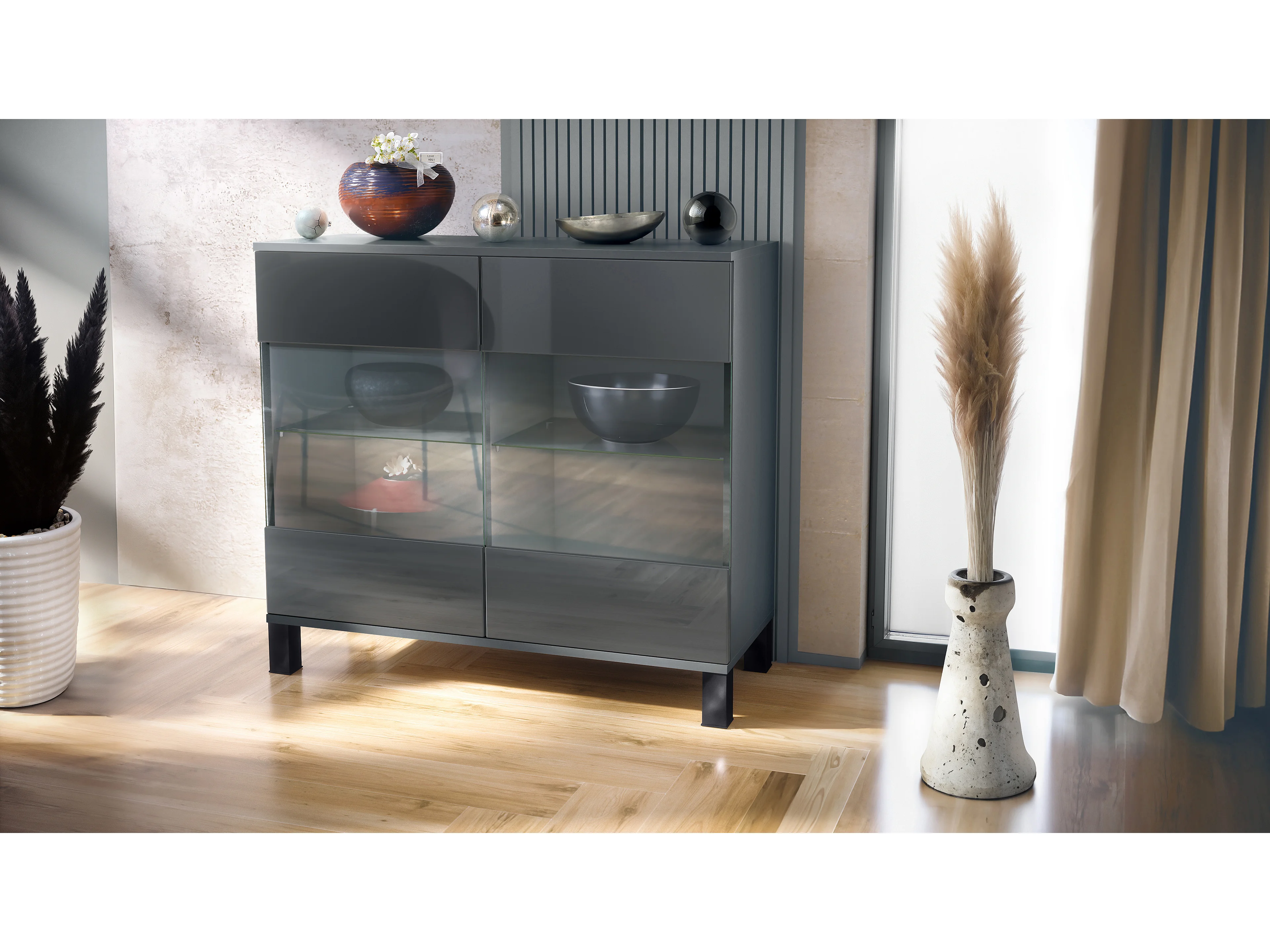 Commode Bari V3, Armoire de cuisine moderne avec 2 grandes portes vitrées anthracite mat / gris haute brillance (92,5 x 84.5 x 35)