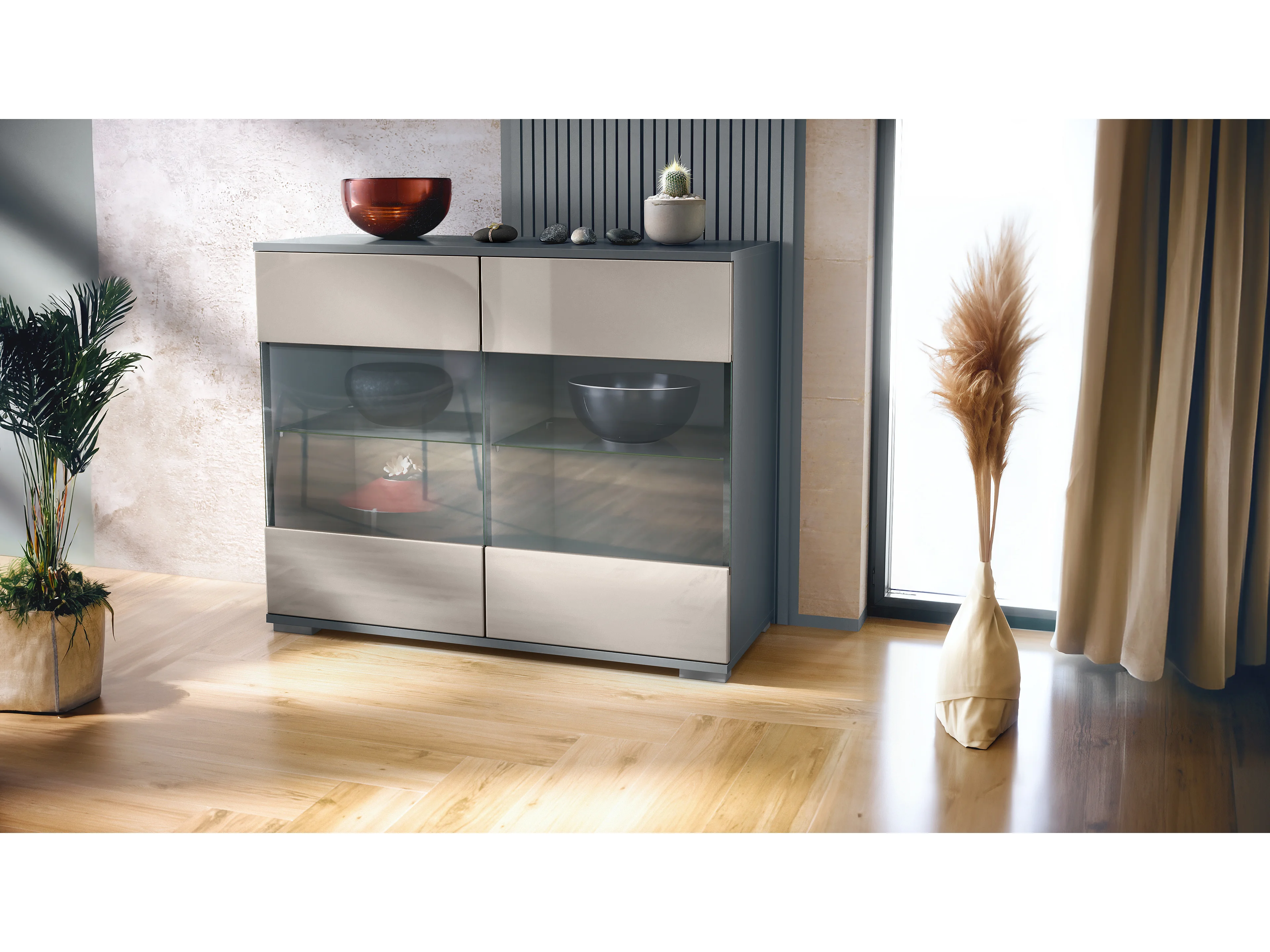 Commode Bari V3, Armoire de cuisine moderne avec 2 grandes portes vitrées anthracite mat / gris sable haute brillance (92,5 x 75.5 x 35)