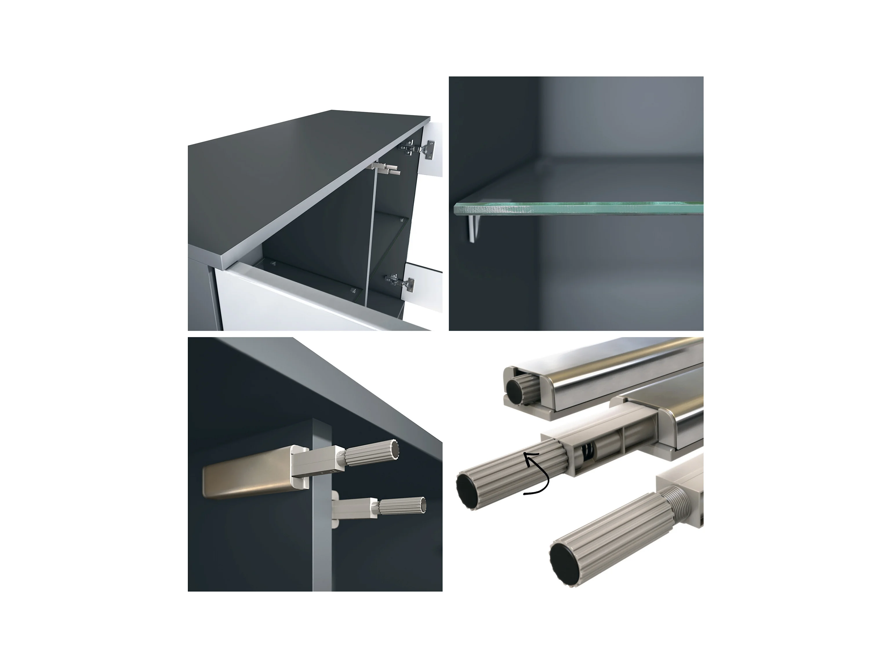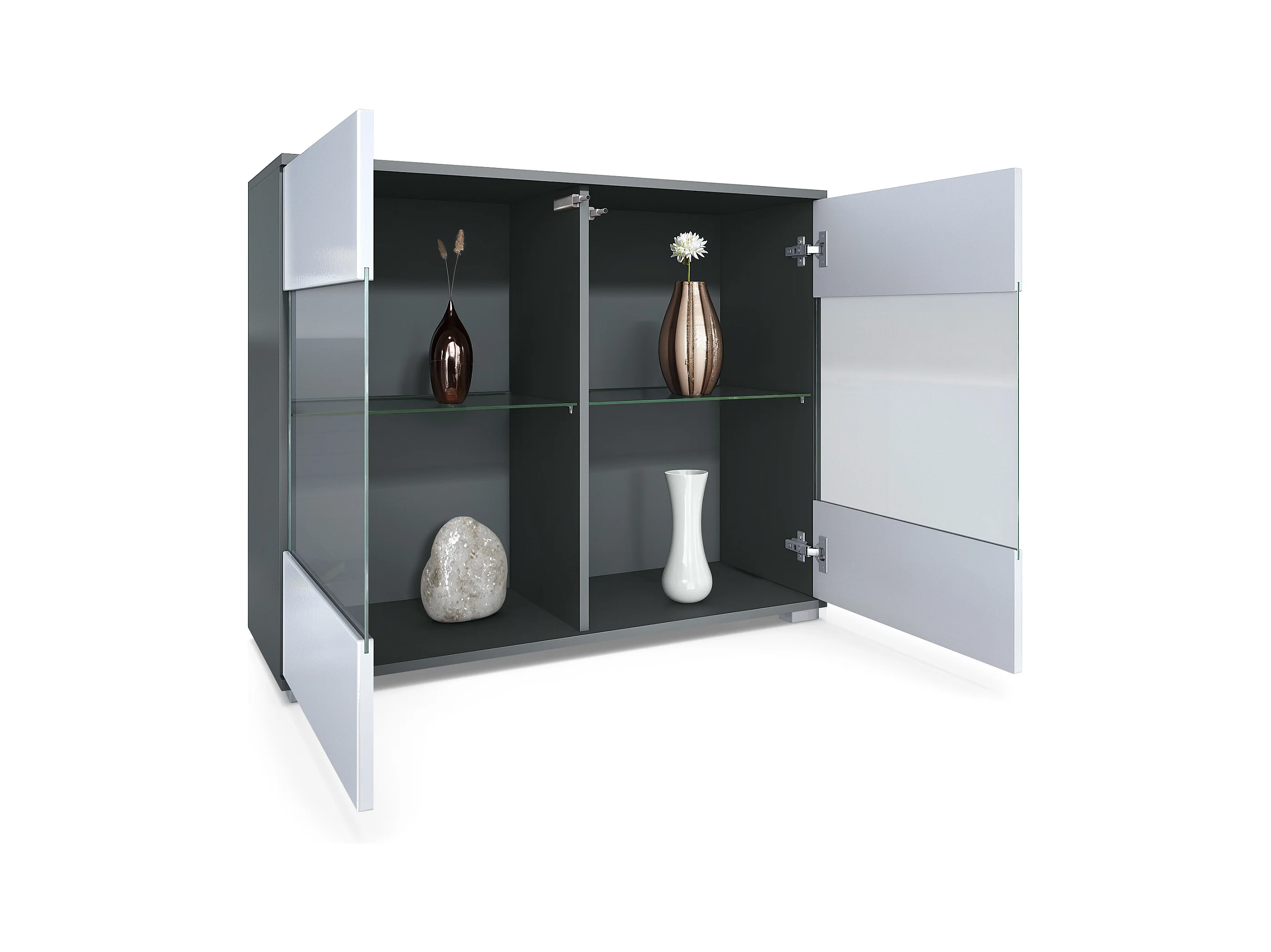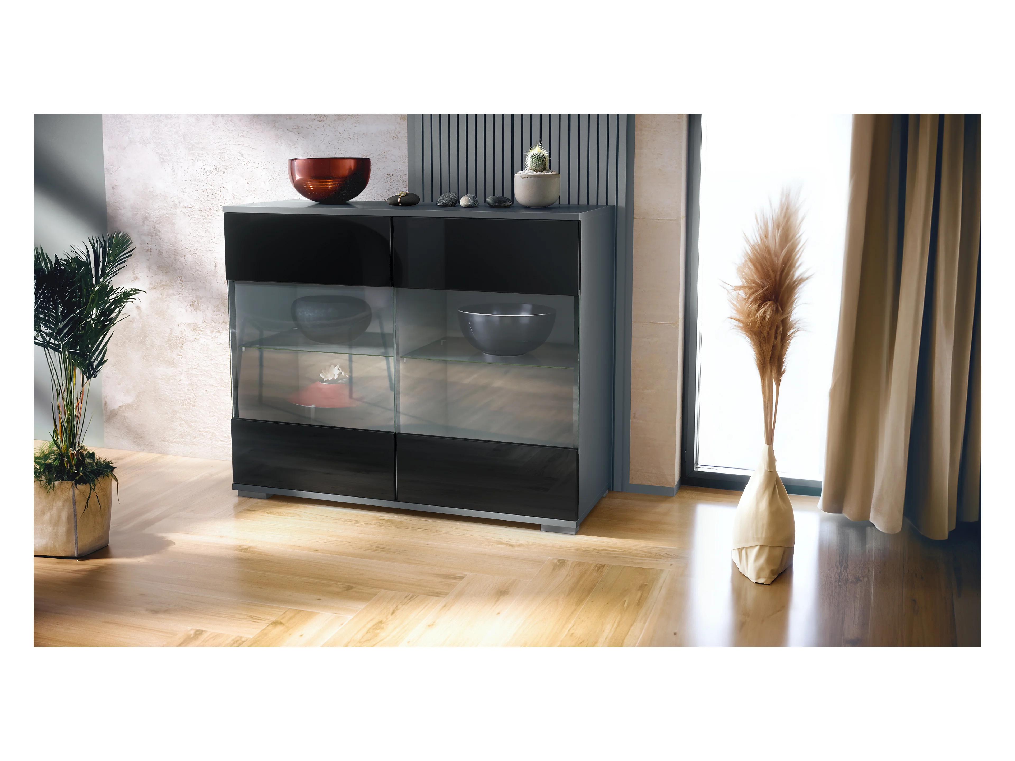 Commode Bari V3, Armoire de cuisine moderne avec 2 grandes portes vitrées anthracite mat / noir haute brillance (92,5 x 75.5 x 35)