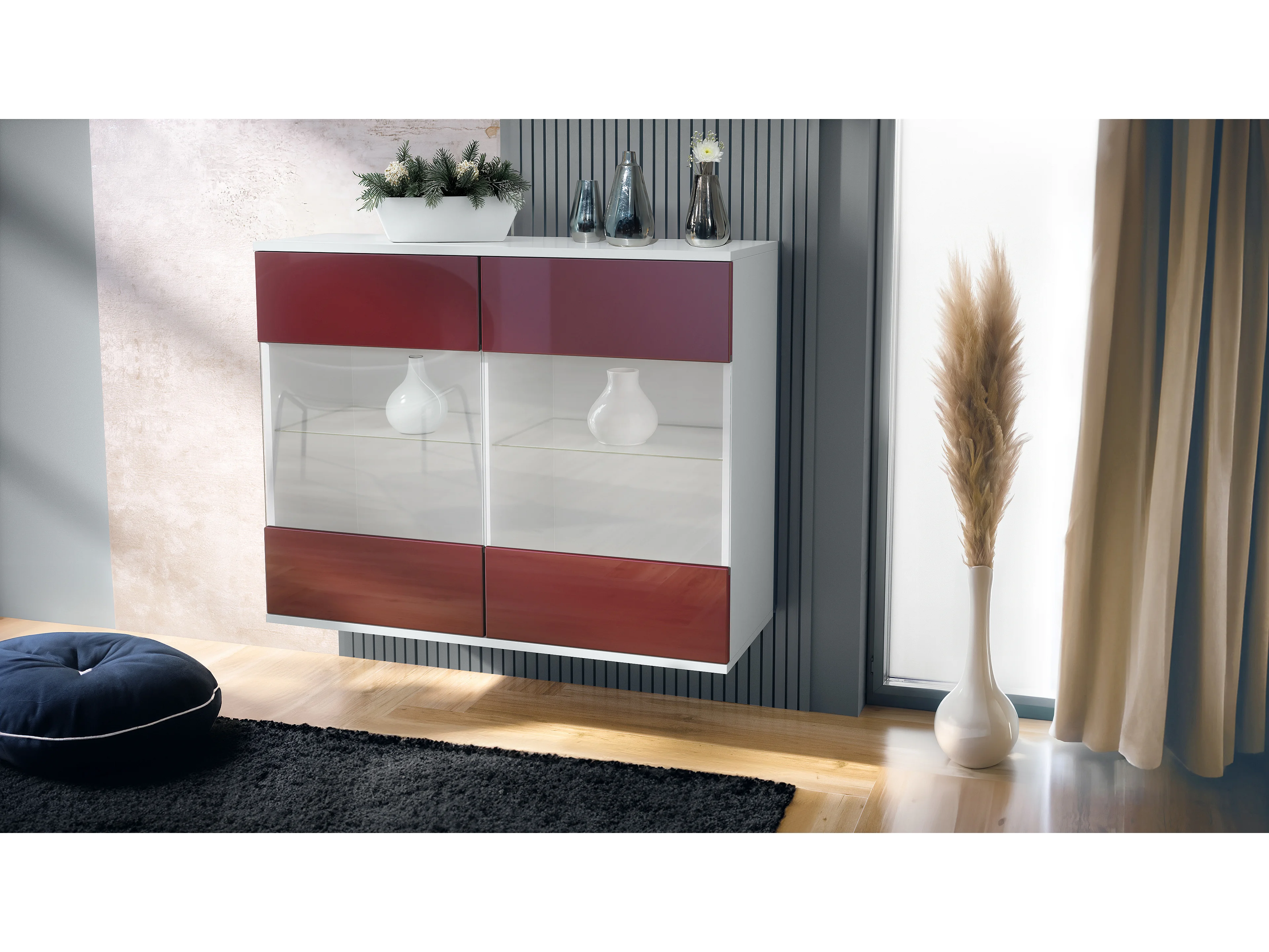 Commode Bari V3, Armoire de cuisine moderne avec 2 grandes portes vitrées blanc mat / bordeaux haute brillance (92,5 x 73.5 x 35)