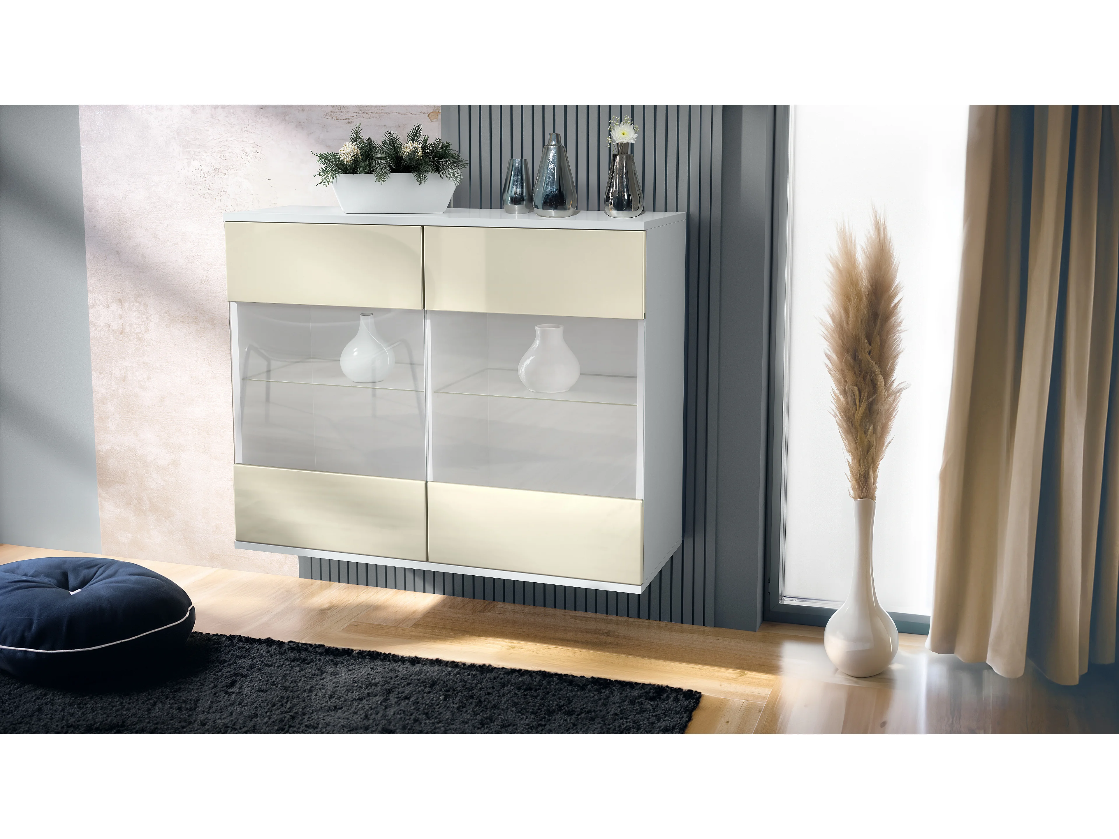 Commode Bari V3, Armoire de cuisine moderne avec 2 grandes portes vitrées blanc mat / crème haute brillance (92,5 x 73.5 x 35)