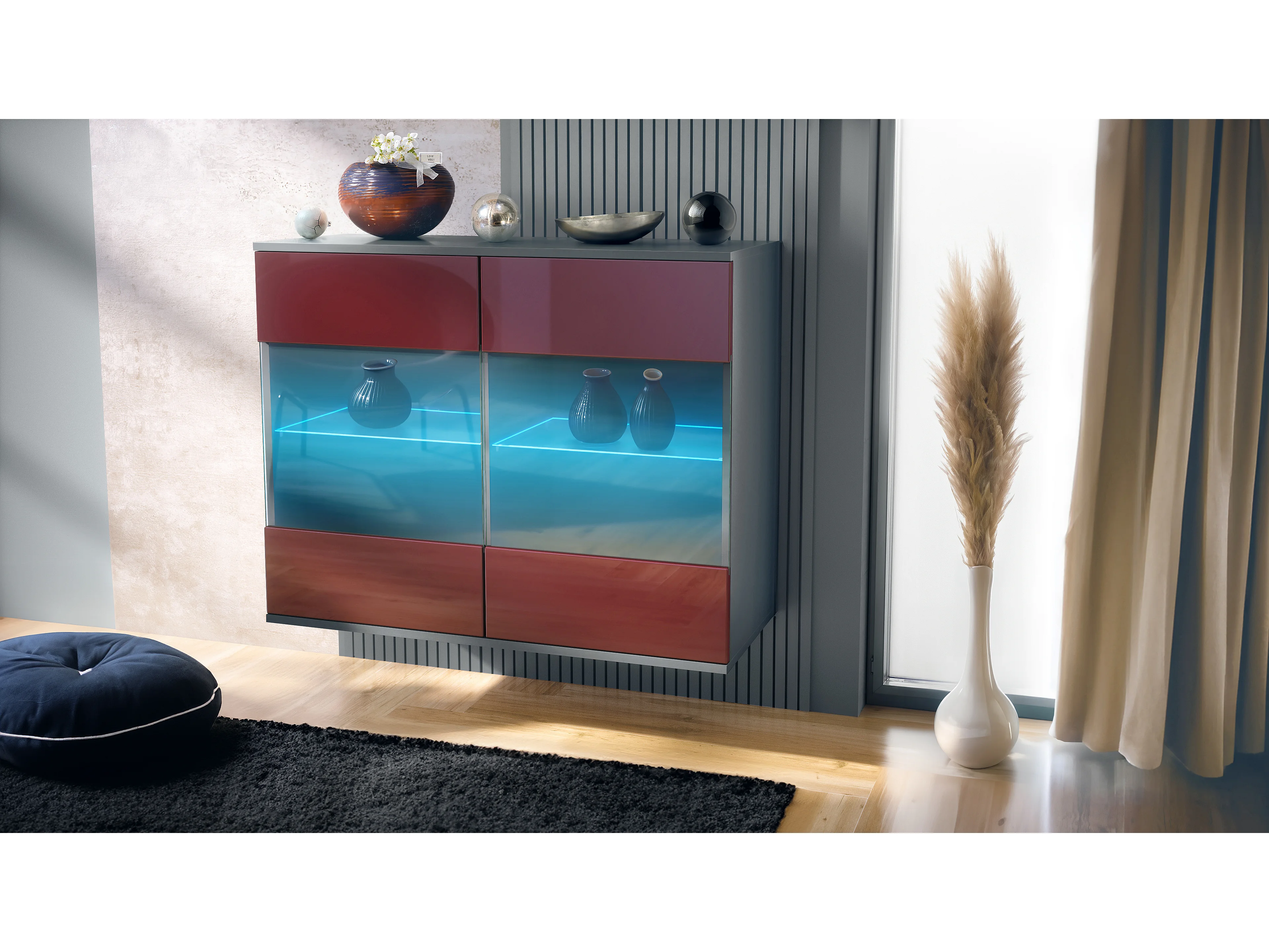 Commode Bari V3, Armoire de cuisine moderne avec 2 grandes portes vitrées incl. éclairage RGB anthracite mat / bordeaux haute brillance (92,5 x 73.5 x 35)
