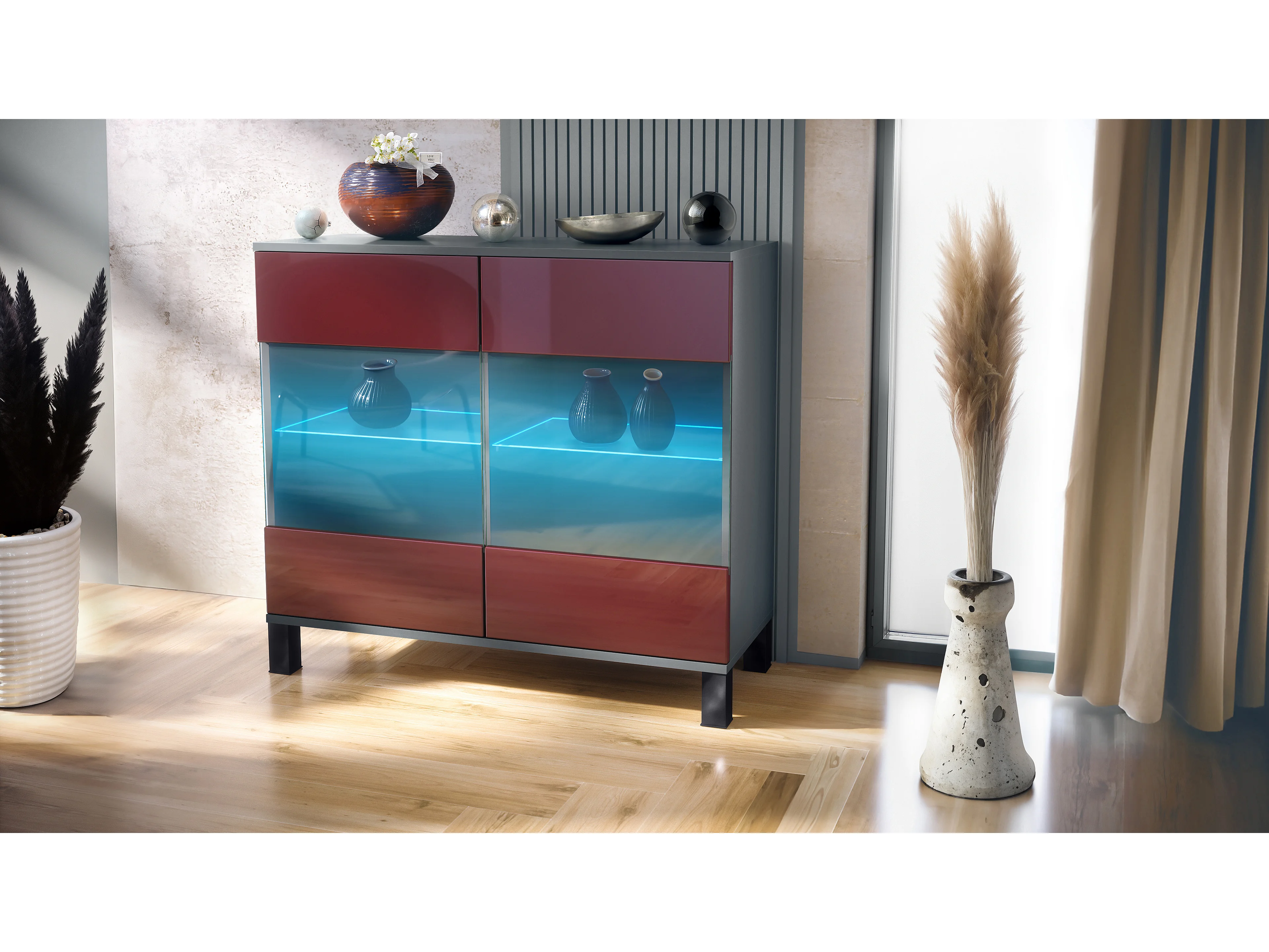 Commode Bari V3, Armoire de cuisine moderne avec 2 grandes portes vitrées incl. éclairage RGB anthracite mat / bordeaux haute brillance (92,5 x 84.5 x 35)