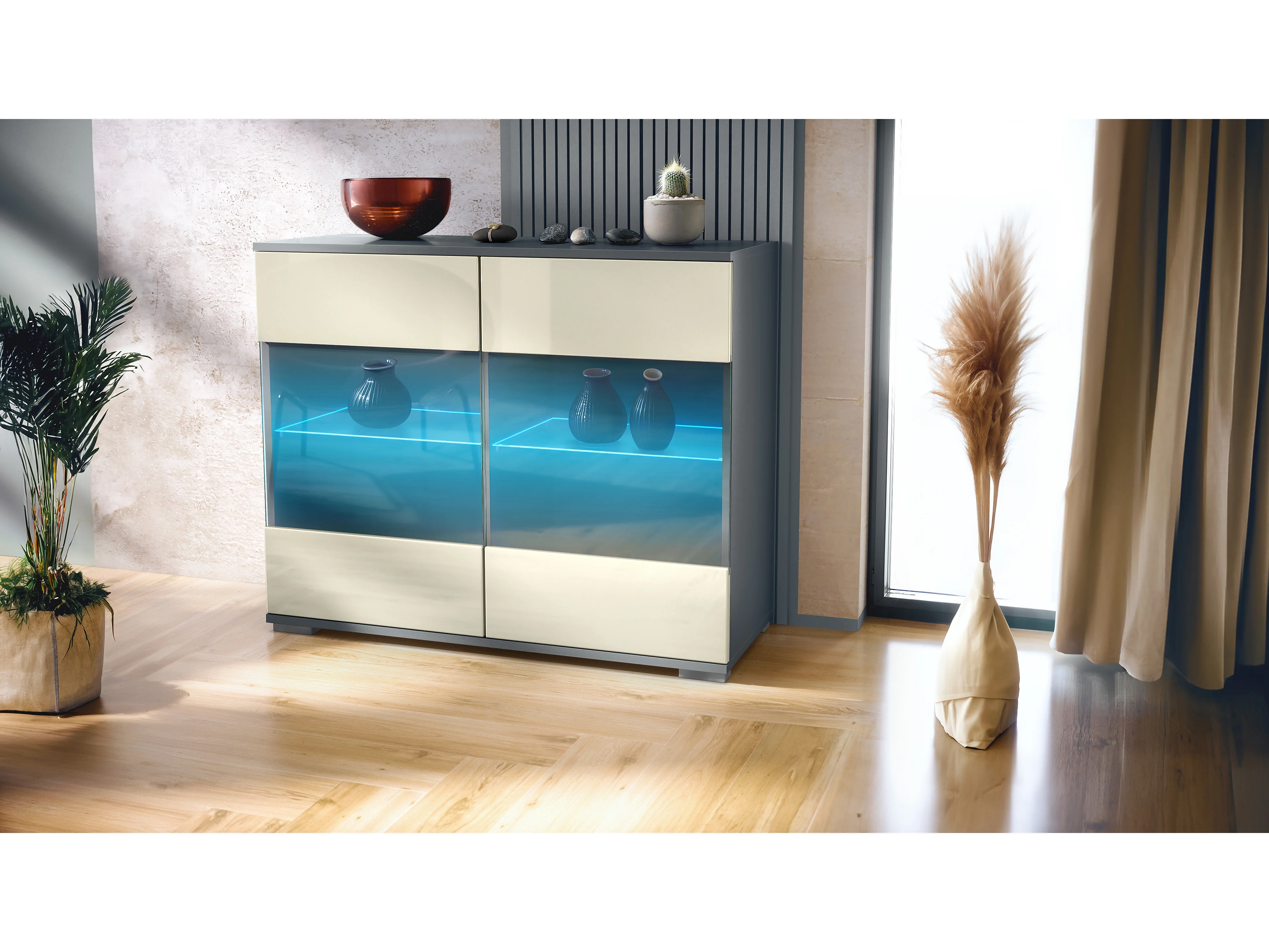Commode Bari V3, Armoire de cuisine moderne avec 2 grandes portes vitrées incl. éclairage RGB anthracite mat / crème haute brillance (92,5 x 75.5 x 35)