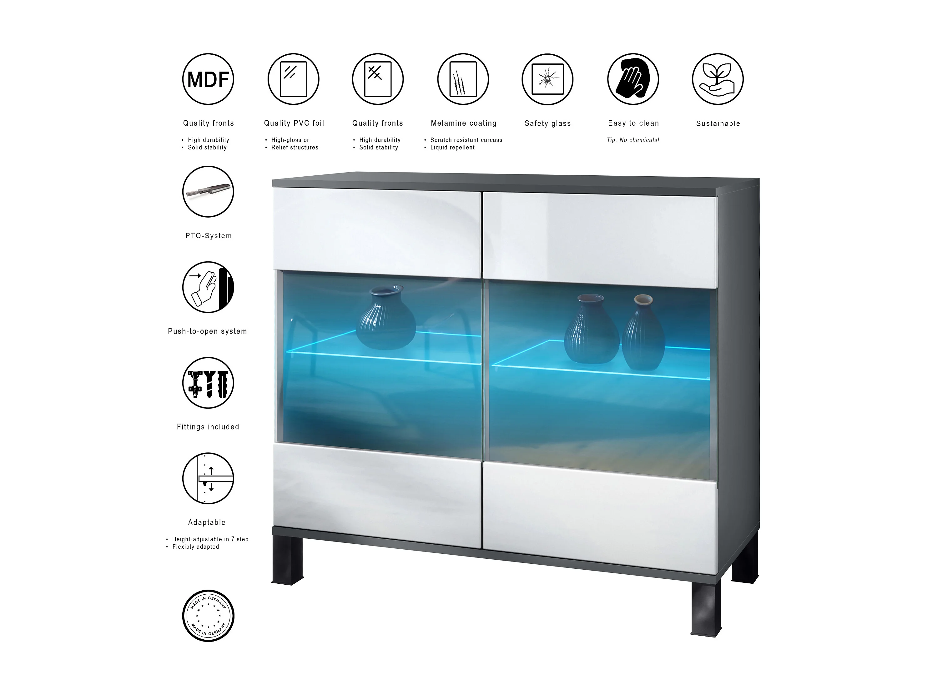 Commode Bari V3, Armoire de cuisine moderne avec 2 grandes portes vitrées incl. éclairage RGB anthracite mat / gris haute brillance (92,5 x 84.5 x 35)