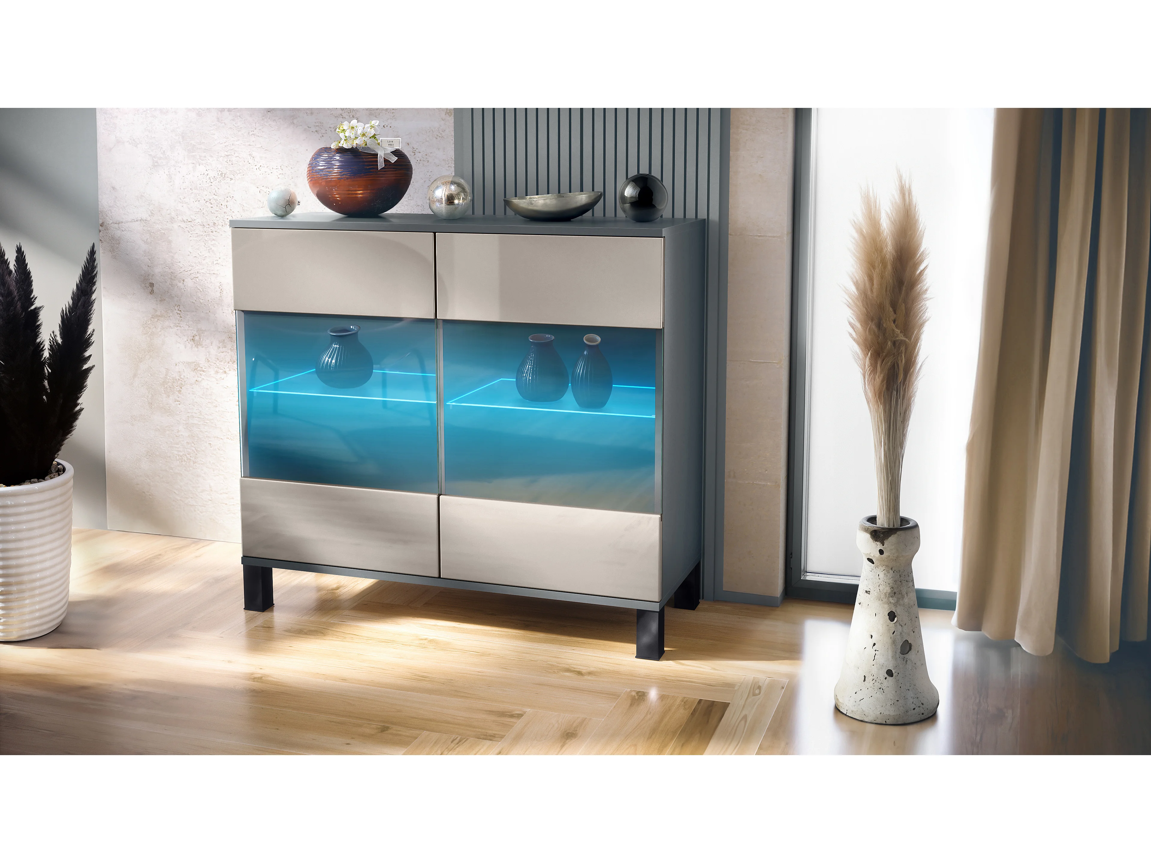 Commode Bari V3, Armoire de cuisine moderne avec 2 grandes portes vitrées incl. éclairage RGB anthracite mat / gris sable haute brillance (92,5 x 84.5 x 35)
