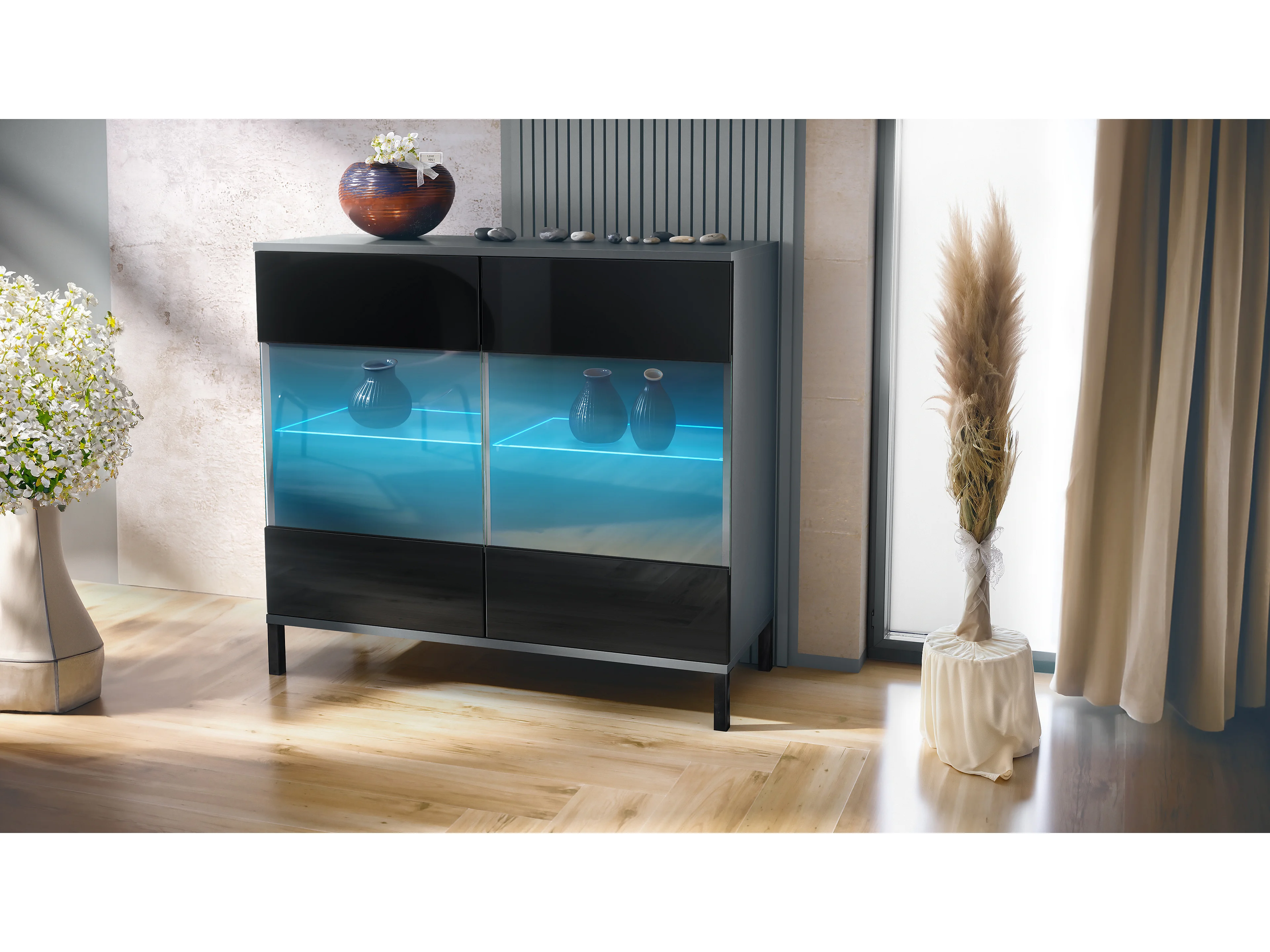 Commode Bari V3, Armoire de cuisine moderne avec 2 grandes portes vitrées incl. éclairage RGB anthracite mat / noir haute brillance (92,5 x 83.5 x 35)