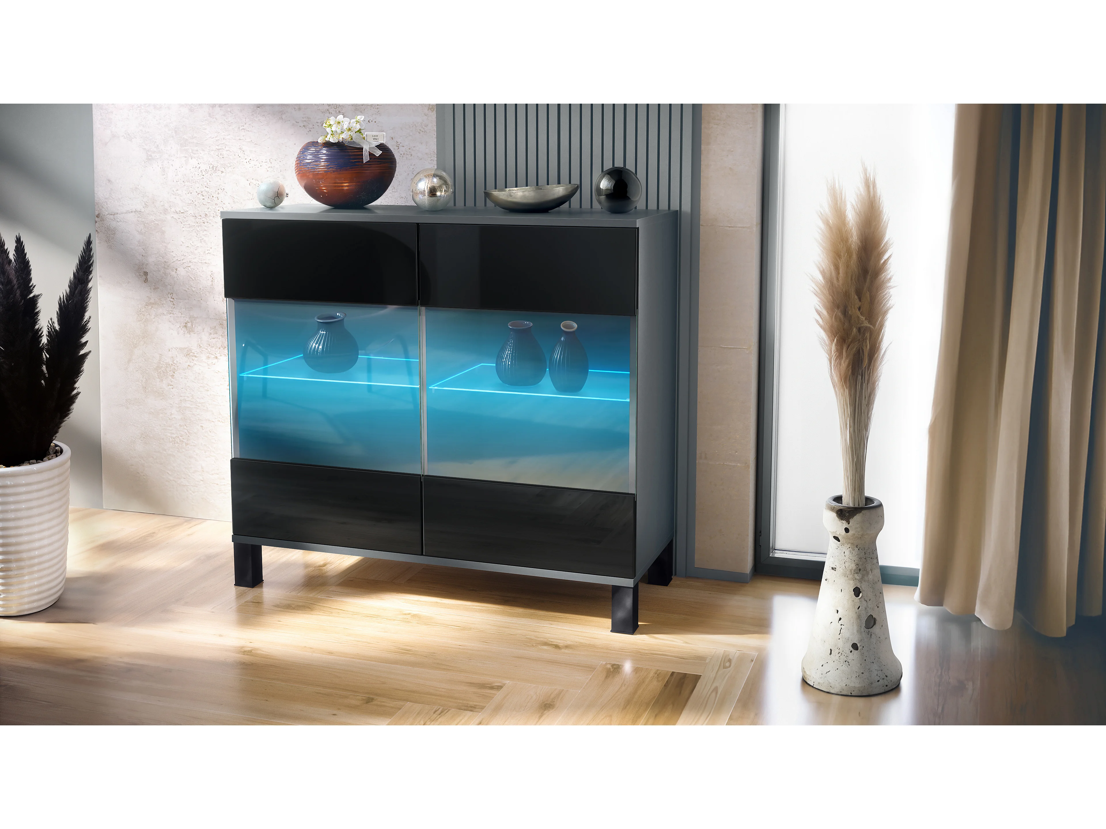 Commode Bari V3, Armoire de cuisine moderne avec 2 grandes portes vitrées incl. éclairage RGB anthracite mat / noir haute brillance (92,5 x 84.5 x 35)
