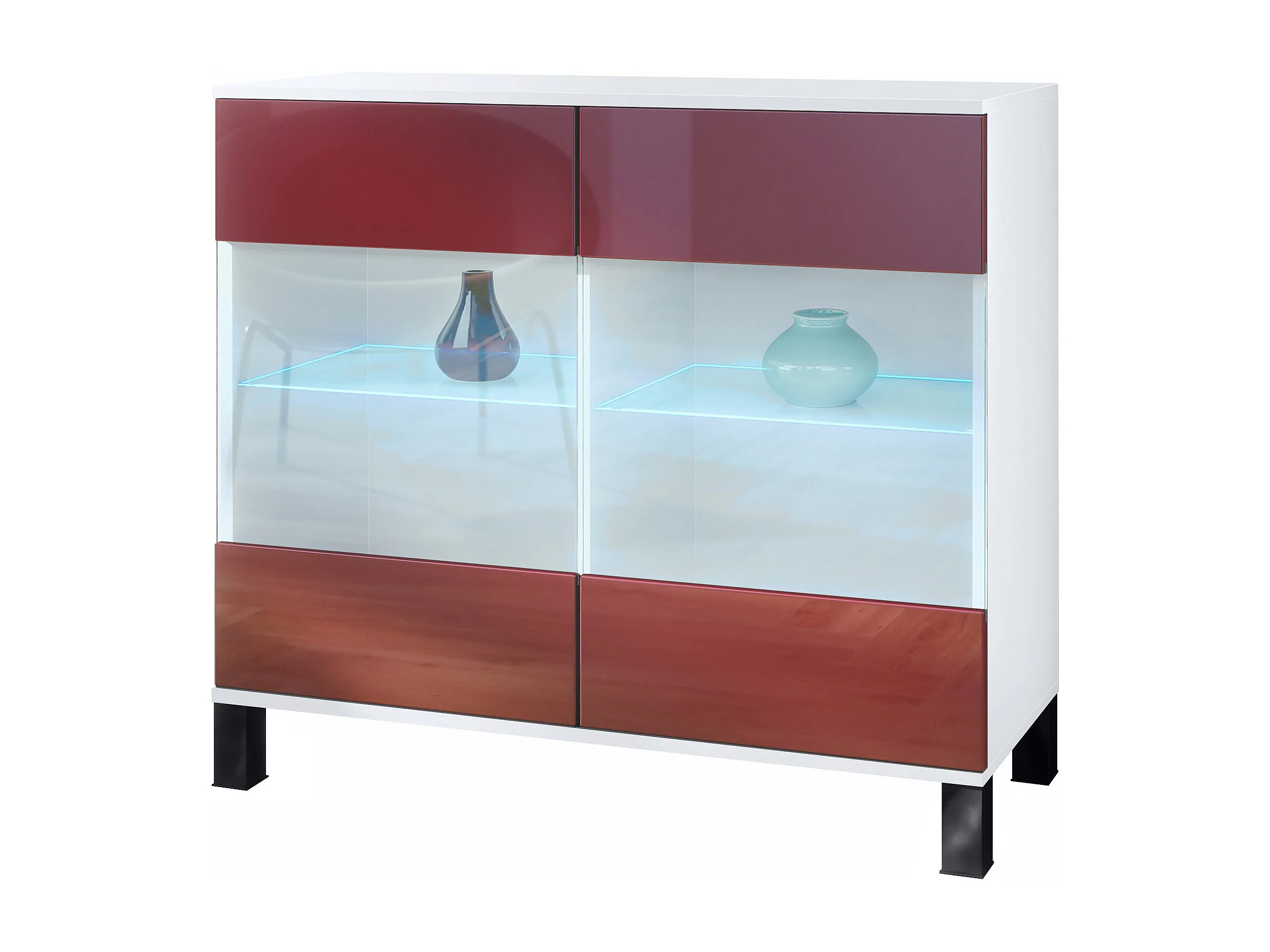 Commode Bari V3, Armoire de cuisine moderne avec 2 grandes portes vitrées incl. éclairage RGB blanc mat / bordeaux haute brillance (92,5 x 84.5 x 35)
