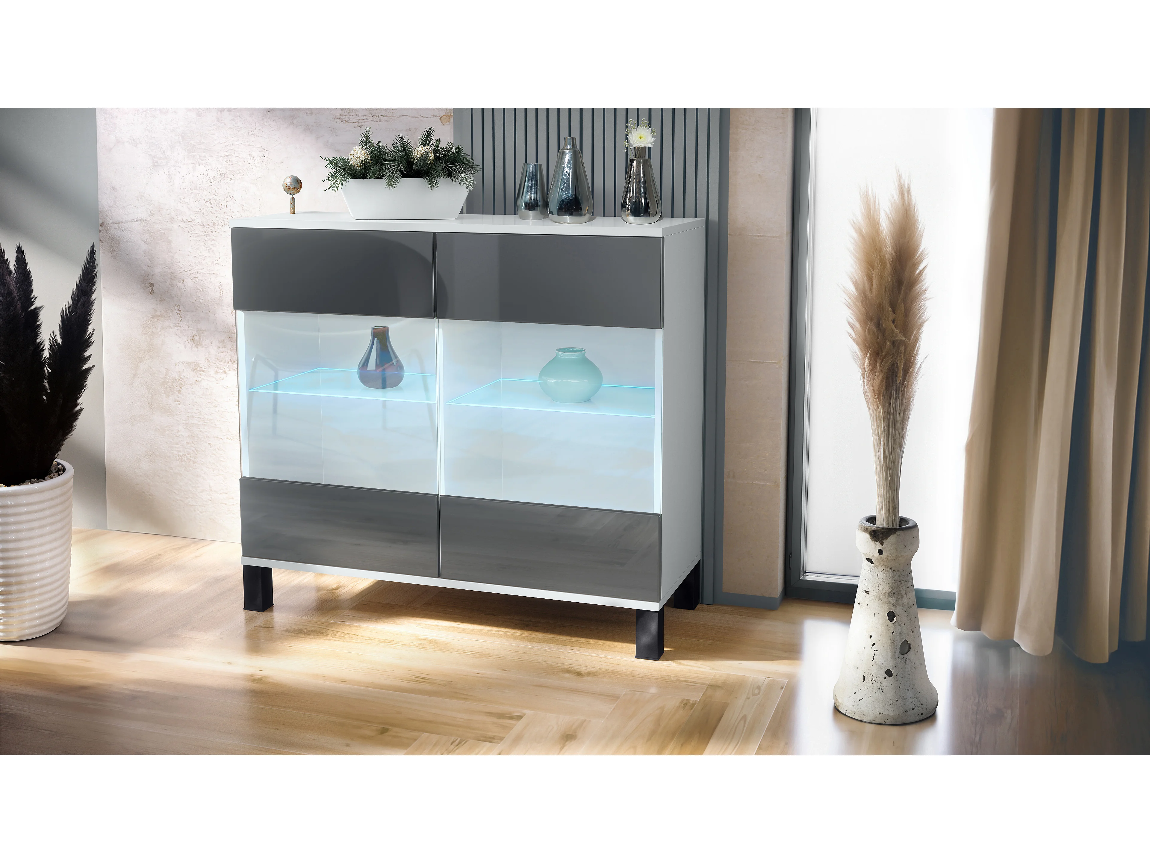Commode Bari V3, Armoire de cuisine moderne avec 2 grandes portes vitrées incl. éclairage RGB blanc mat / gris haute brillance (92,5 x 84.5 x 35)