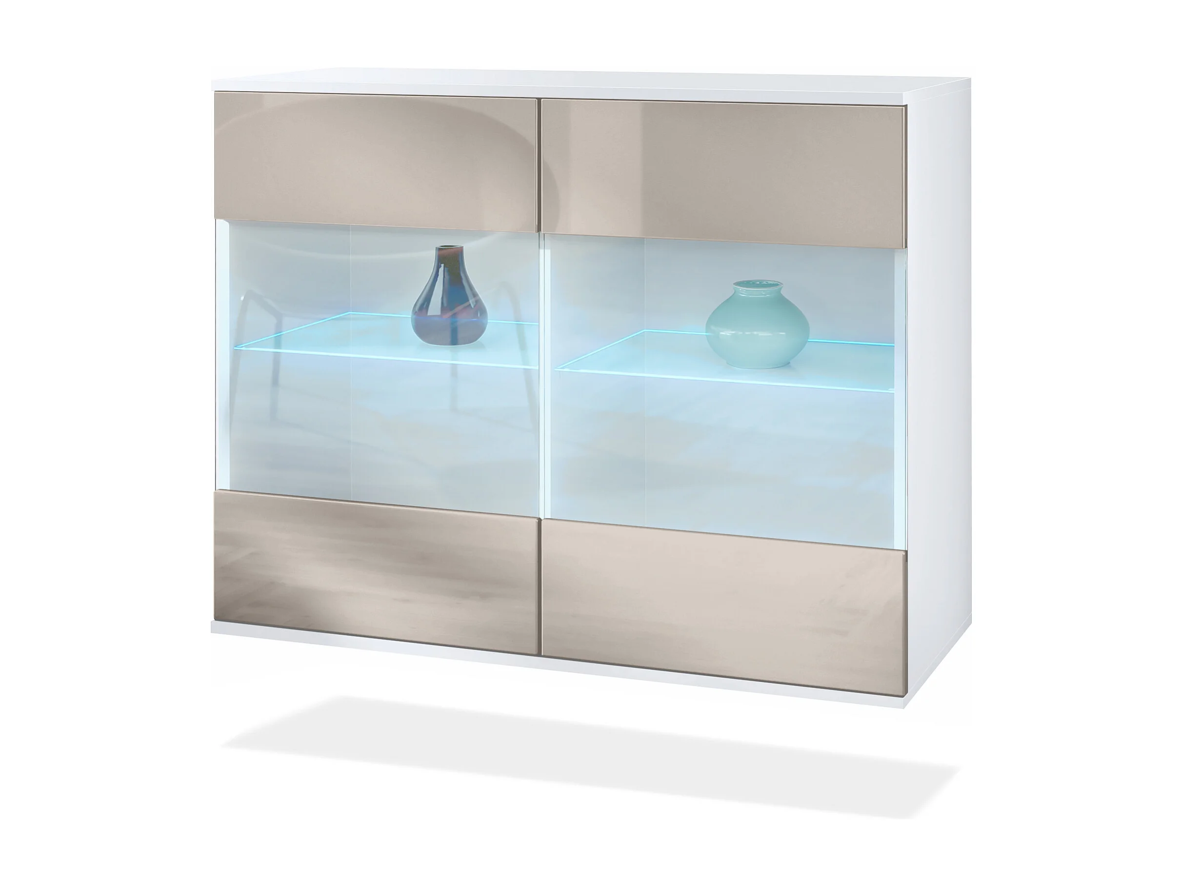 Commode Bari V3, Armoire de cuisine moderne avec 2 grandes portes vitrées incl. éclairage RGB blanc mat / gris sable haute brillance (92,5 x 73.5 x 35)