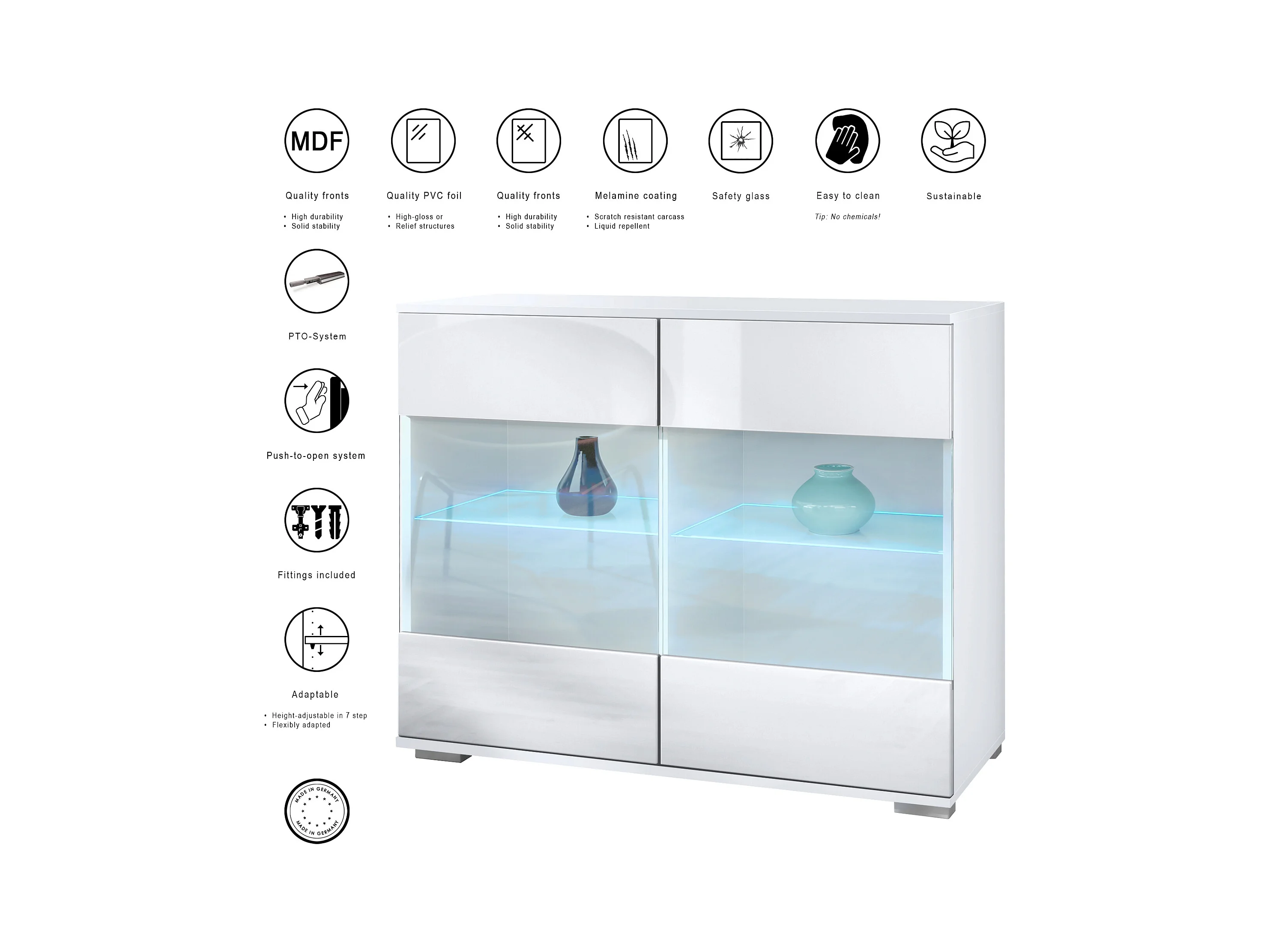 Commode Bari V3, Armoire de cuisine moderne avec 2 grandes portes vitrées incl. éclairage RGB blanc mat / noir haute brillance (92,5 x 75.5 x 35)