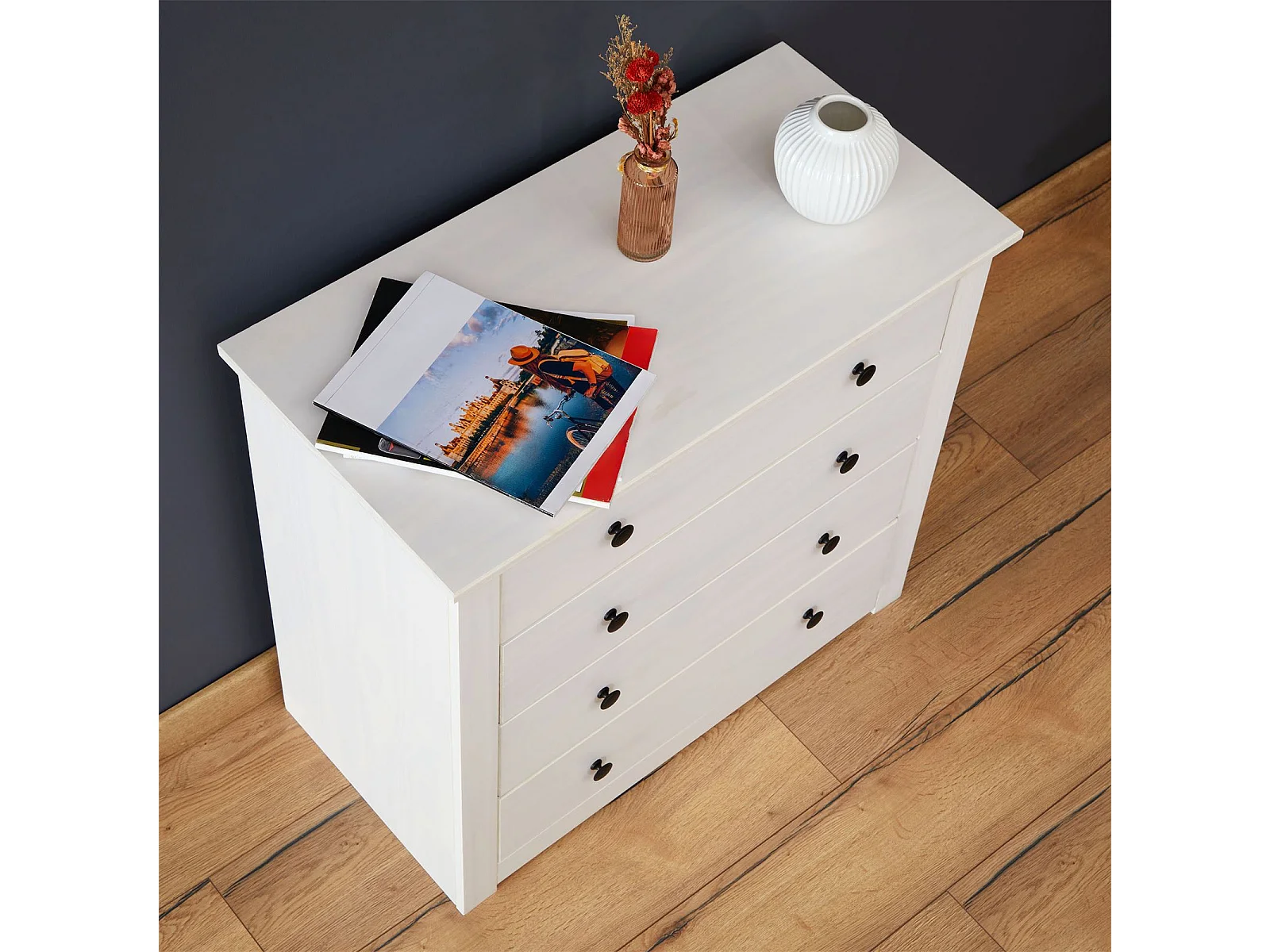 Commode chambre PAULO L 73 cm en bois massif blanc avec 4 tiroirs, meuble de rangement à vêtement