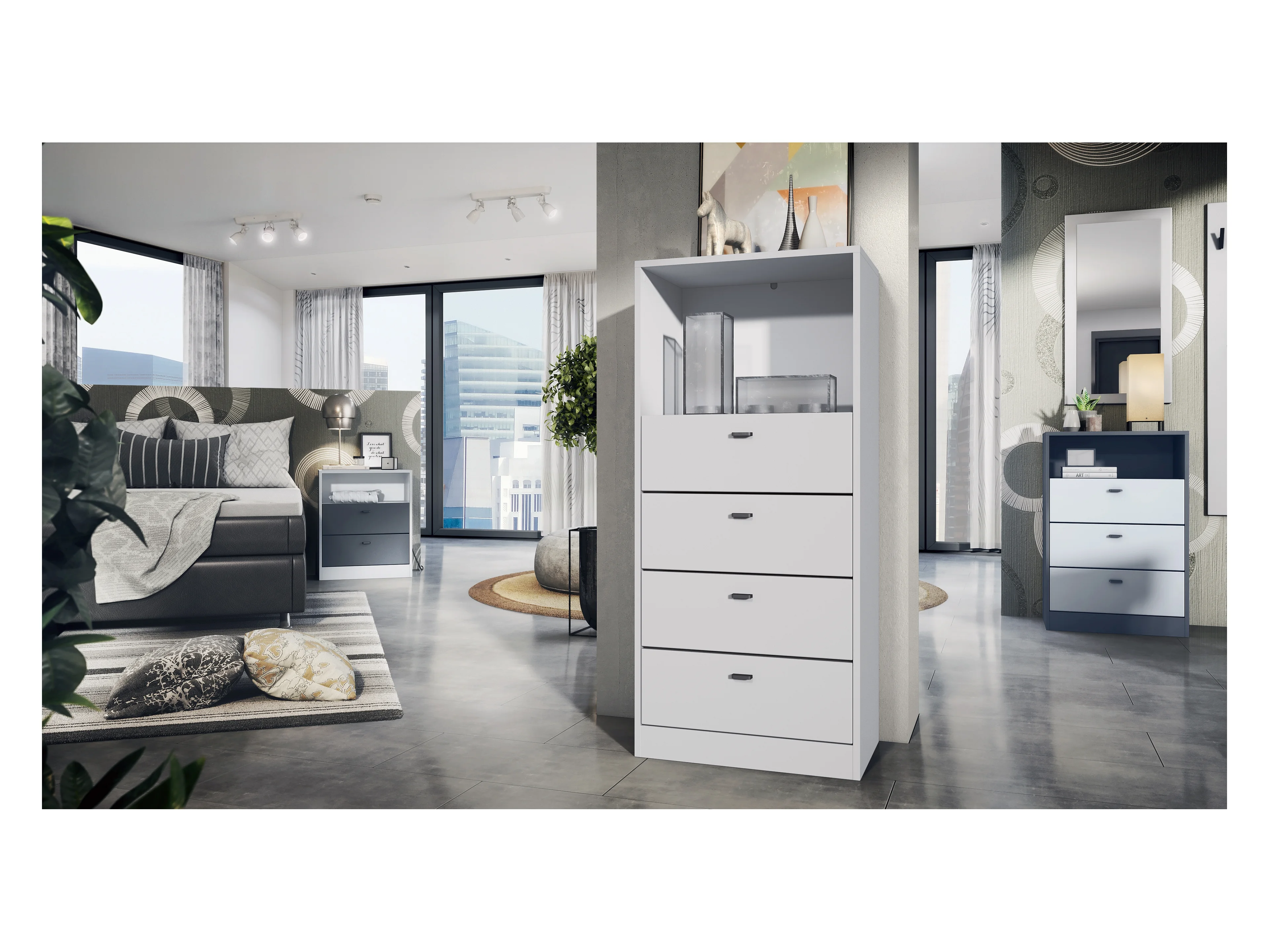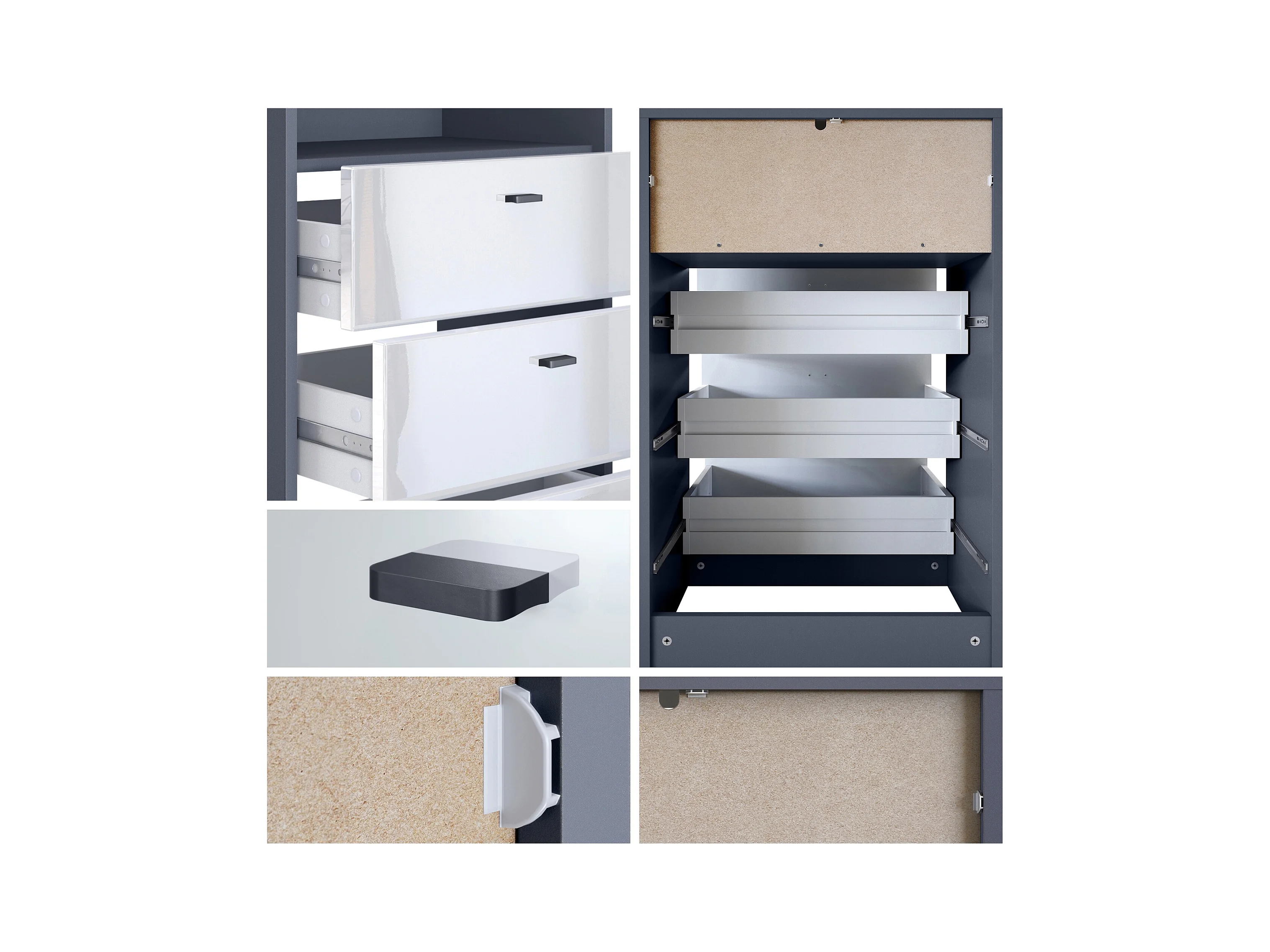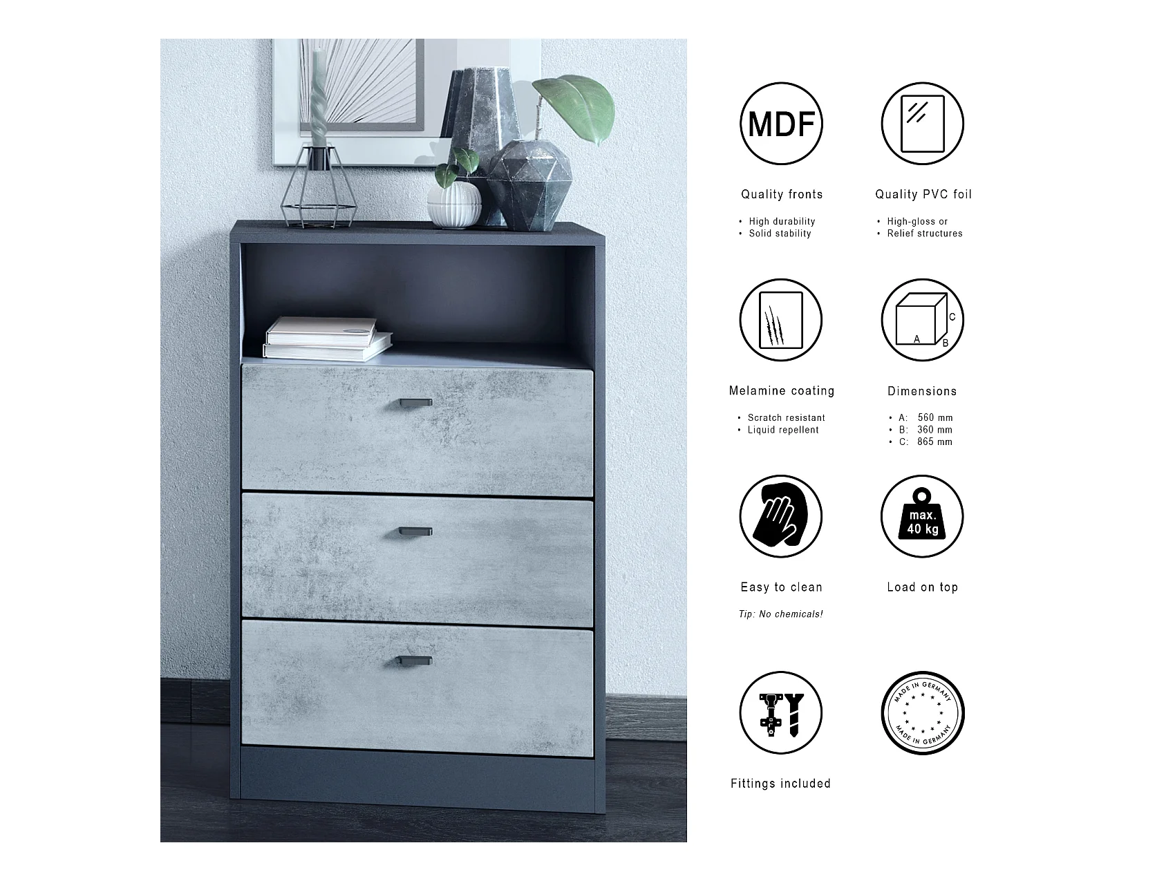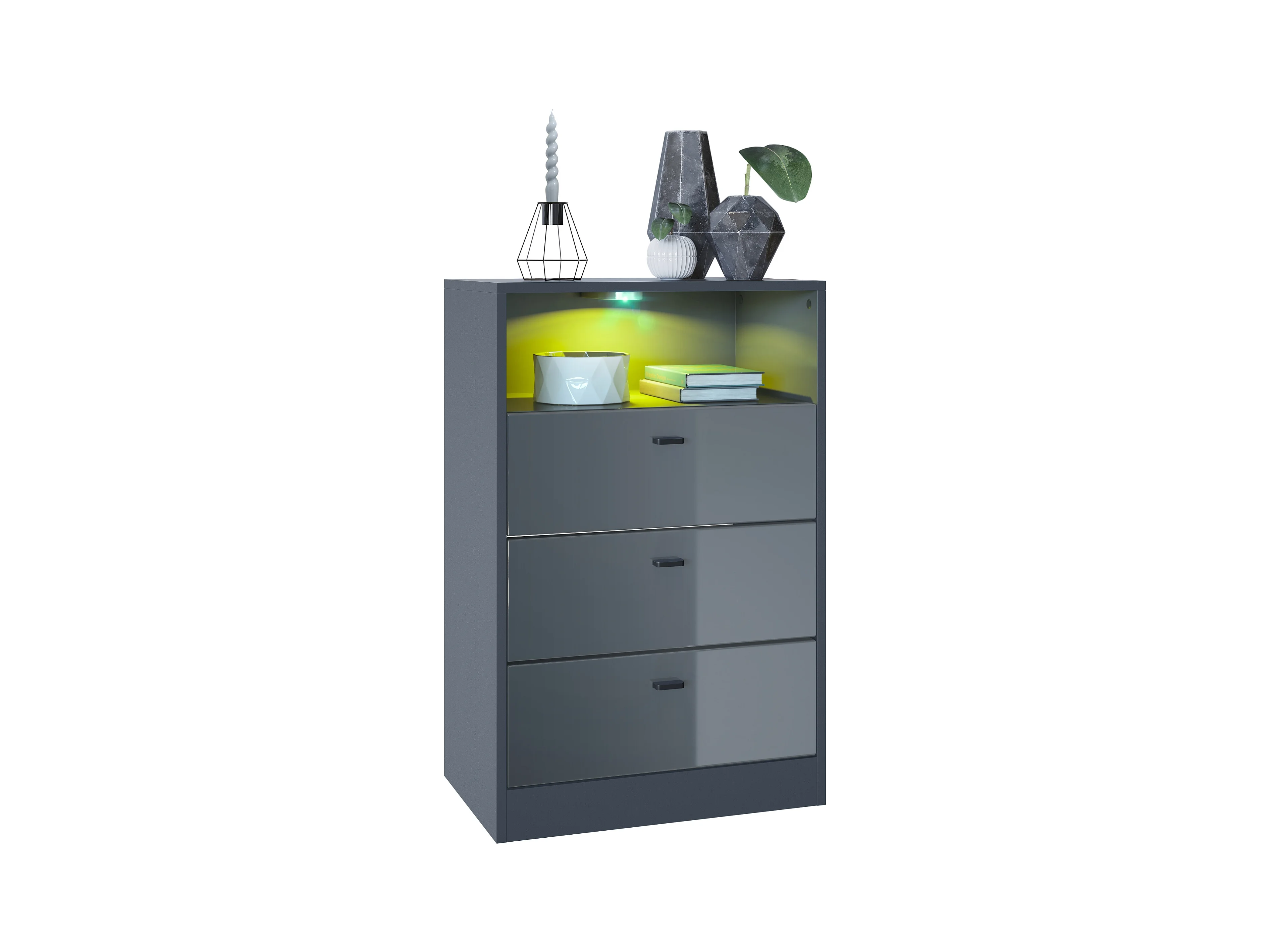 Commode Buffet Pino V2, avec 3 tiroirs & 1 compartiment ouvert, Anthracite mat /Gris haute brillance avec éclairage LED RVB (56 x 86,5 x 36 cm)