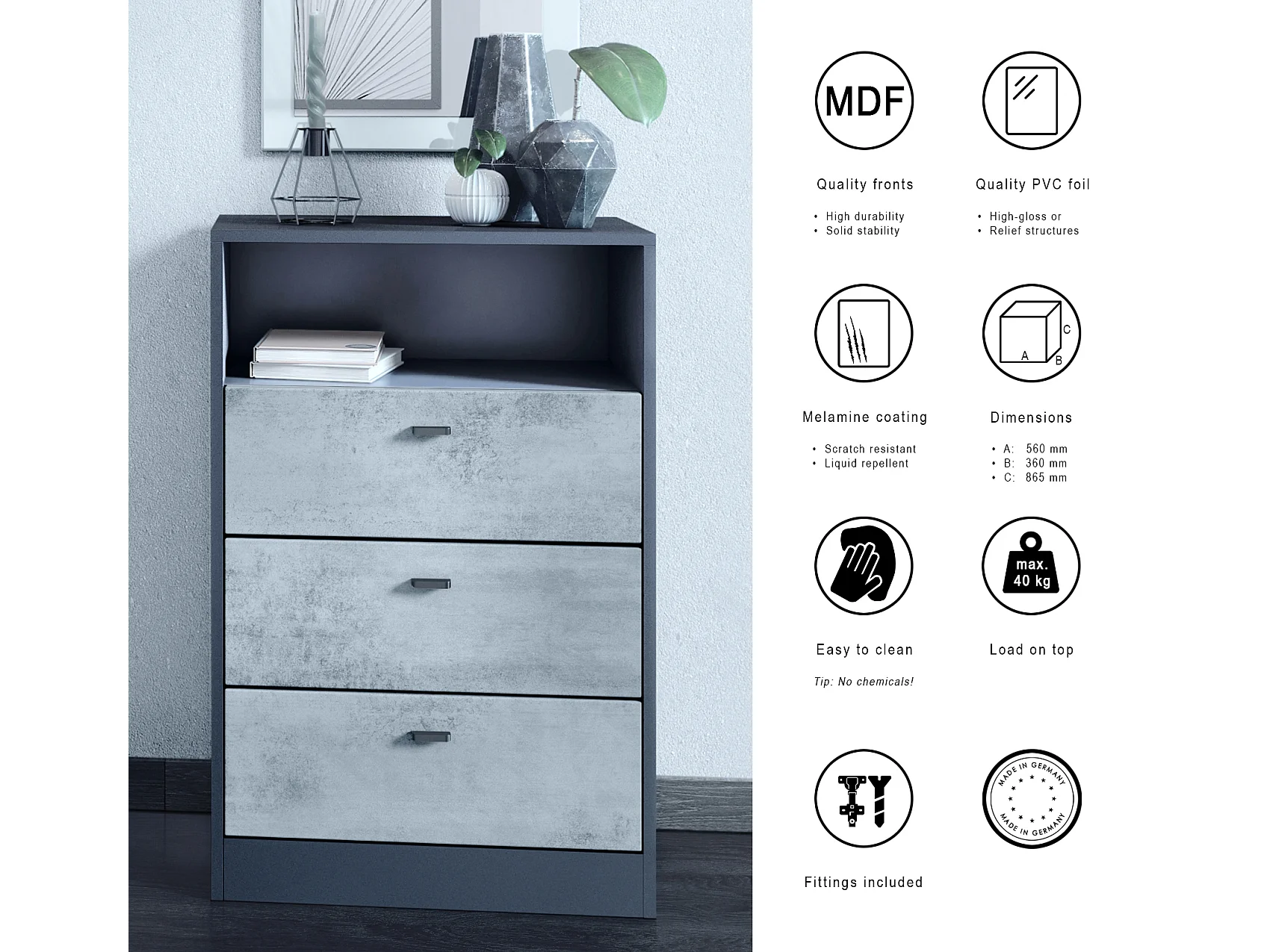 Commode Buffet Pino V2, avec 3 tiroirs & 1 compartiment ouvert, Anthracite mat /Noir haute brillance avec éclairage LED RVB (56 x 86,5 x 36 cm)