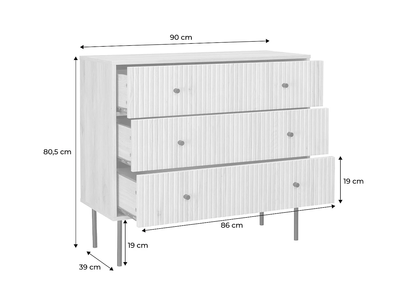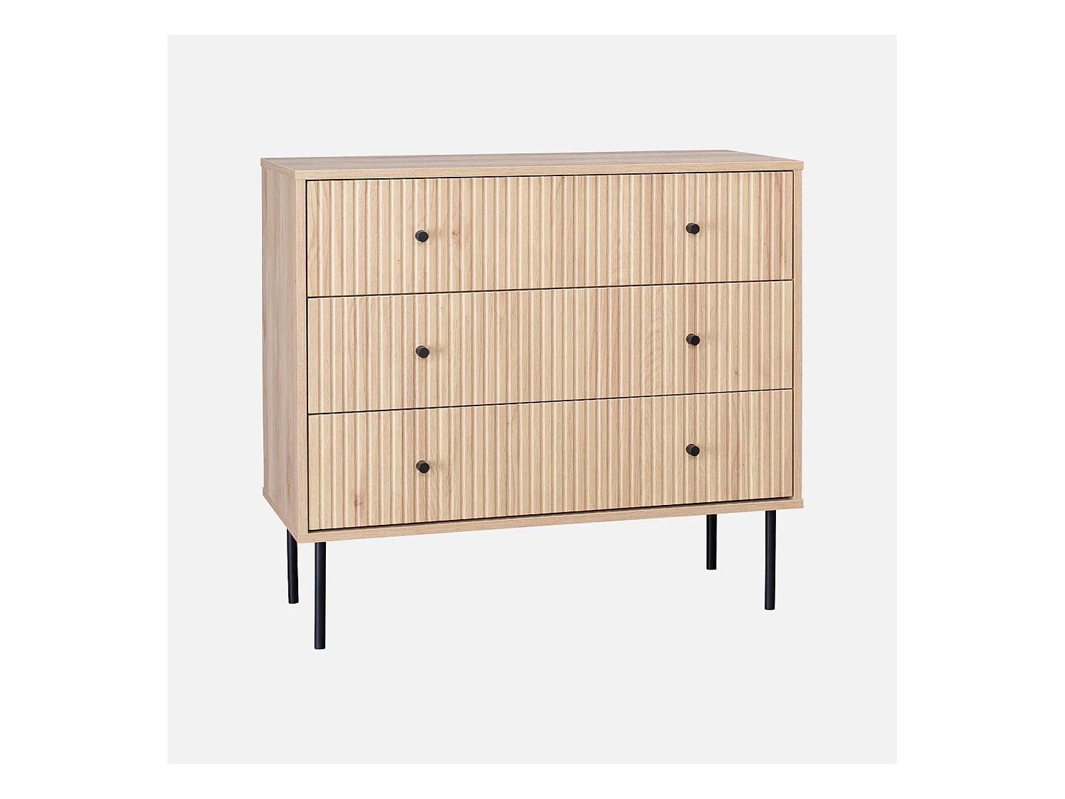 Commode contemporaine décor bois rainuré 3 tiroirs poignées métal noir
