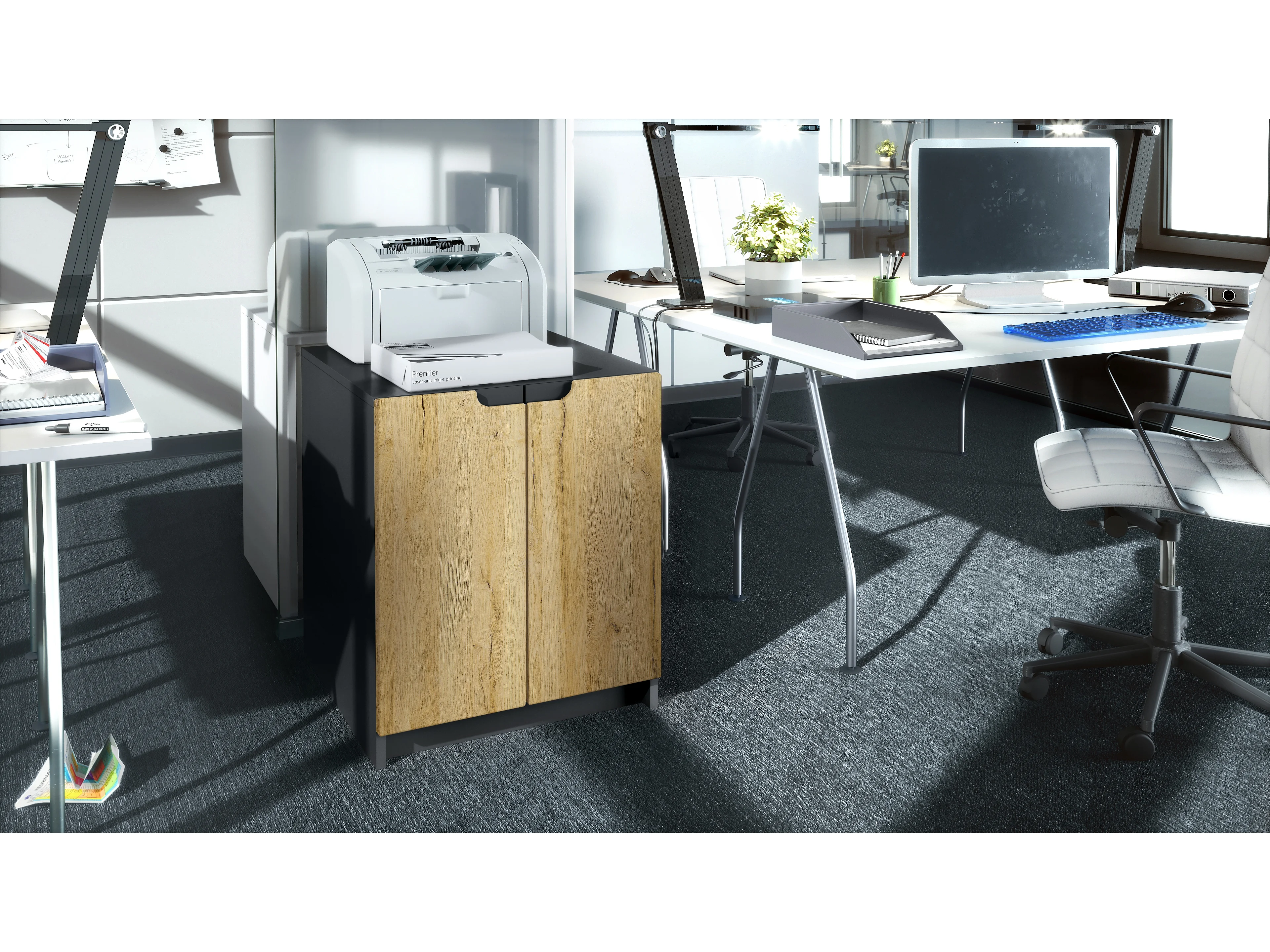 commode d'imprimante Logan, armoire à dossiers avec 2 compartiments et 2 portes, corps noir mat, façades chêne nature, (51 x 60,5 x 54 cm)