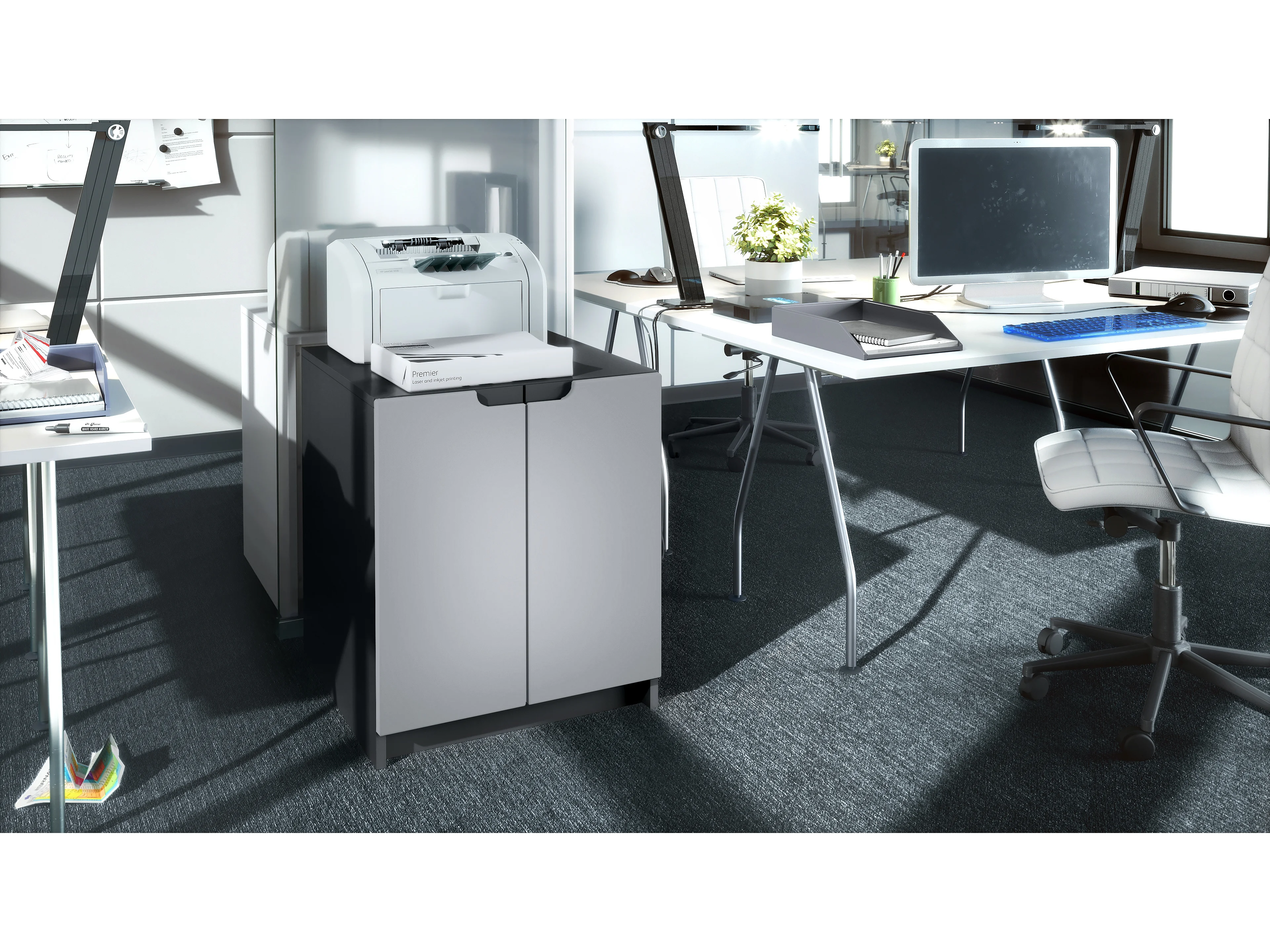 commode d'imprimante Logan, armoire à dossiers avec 2 compartiments et 2 portes, corps blanc mat, façades gris haute brillance, (51 x 60,5 x 54 cm)
