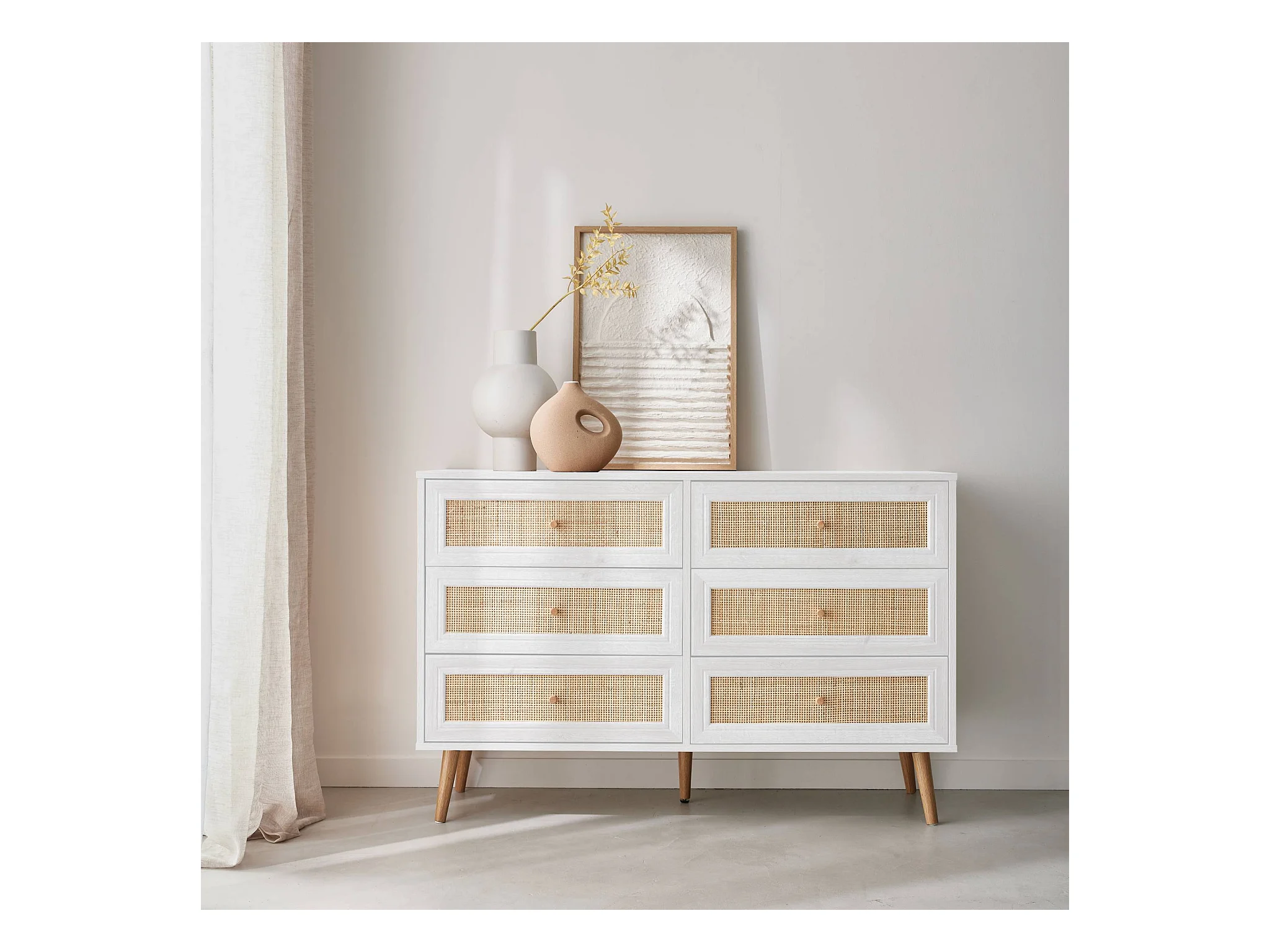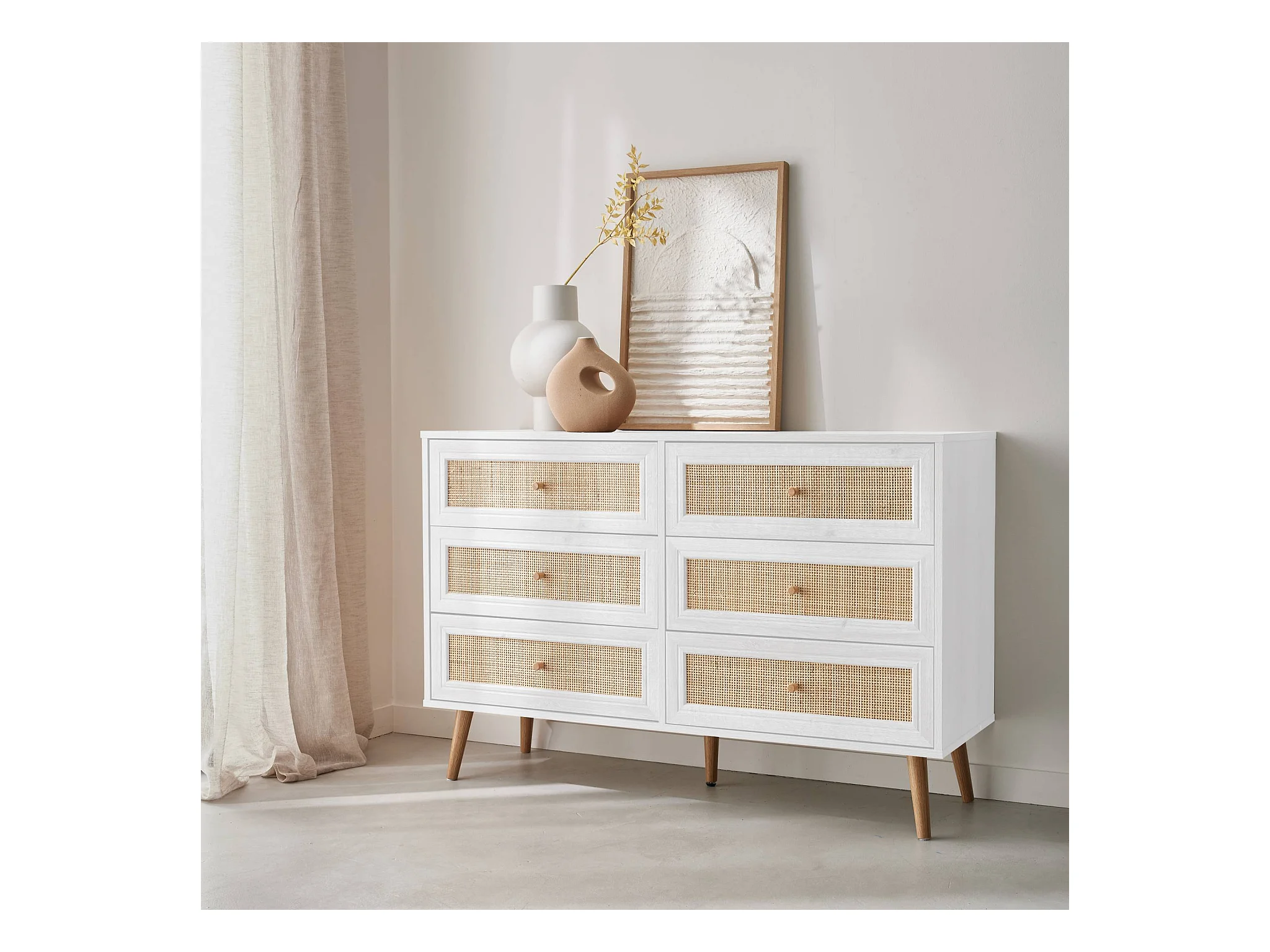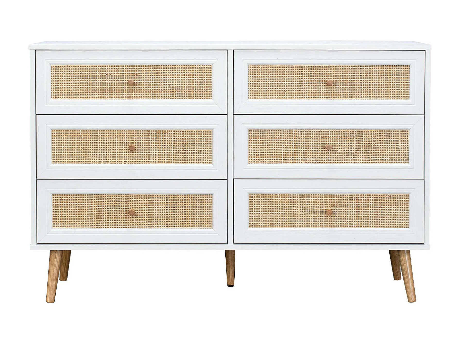 Commode décor bois et cannage 6 tiroirs Bohème. blanc - 120x39x79cm