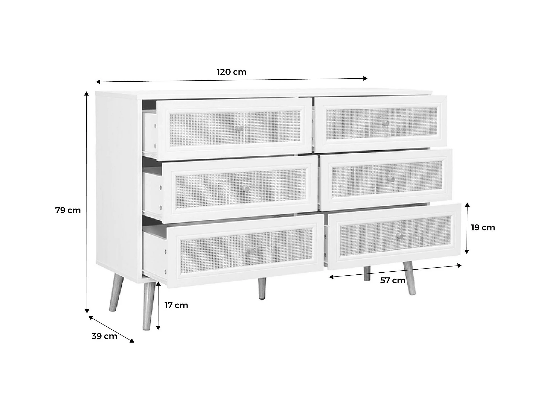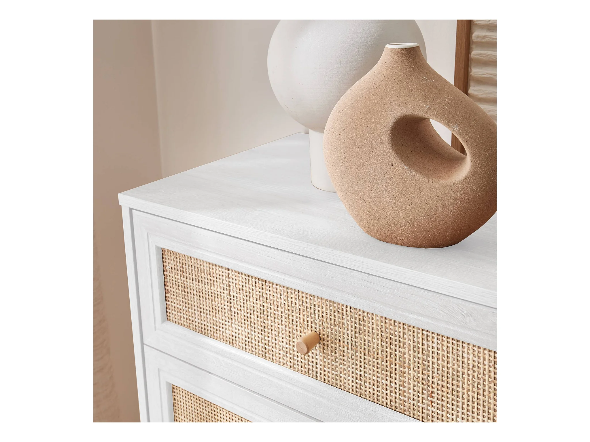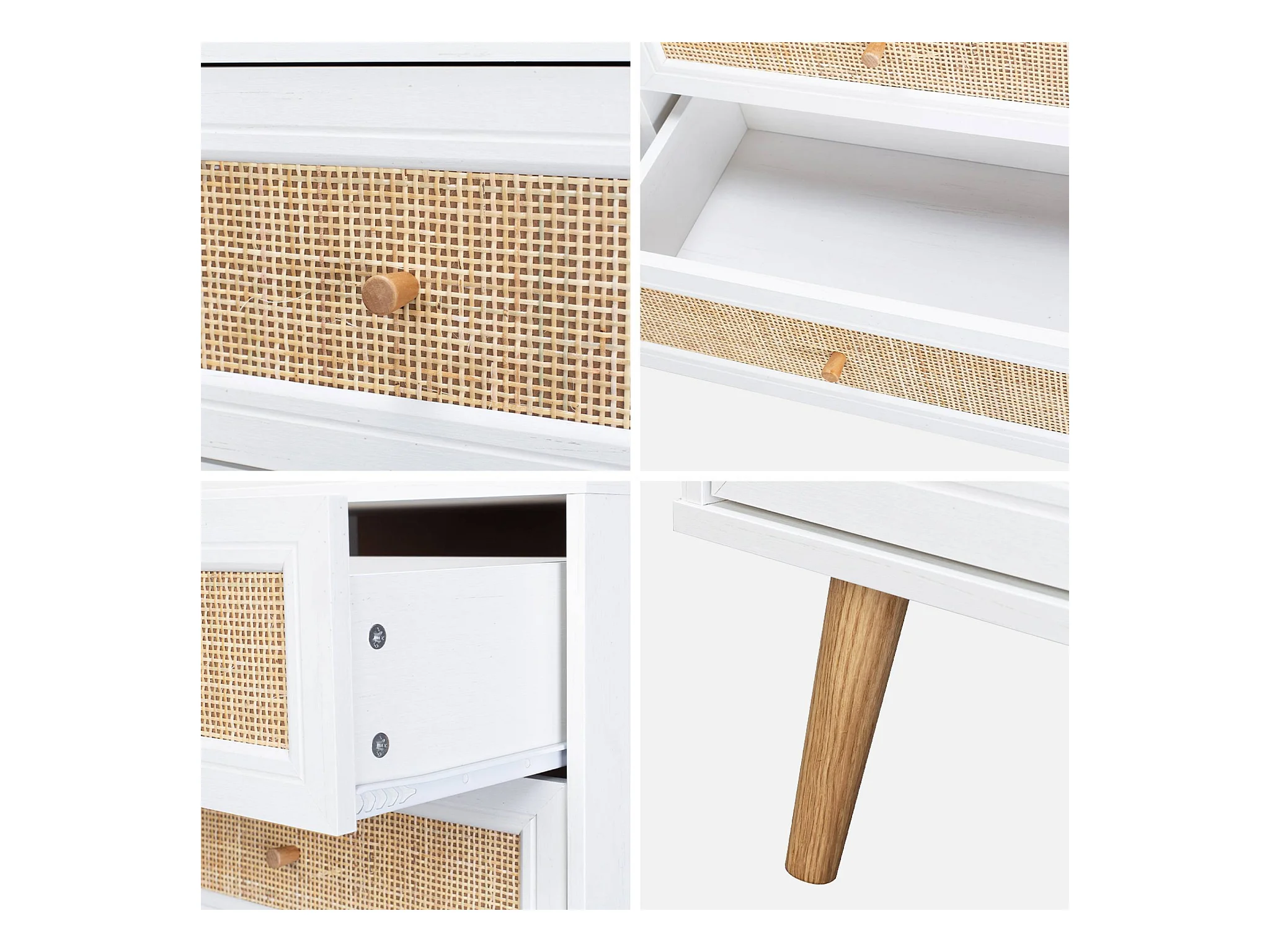 Commode décor bois et cannage 6 tiroirs Bohème. blanc - 120x39x79cm