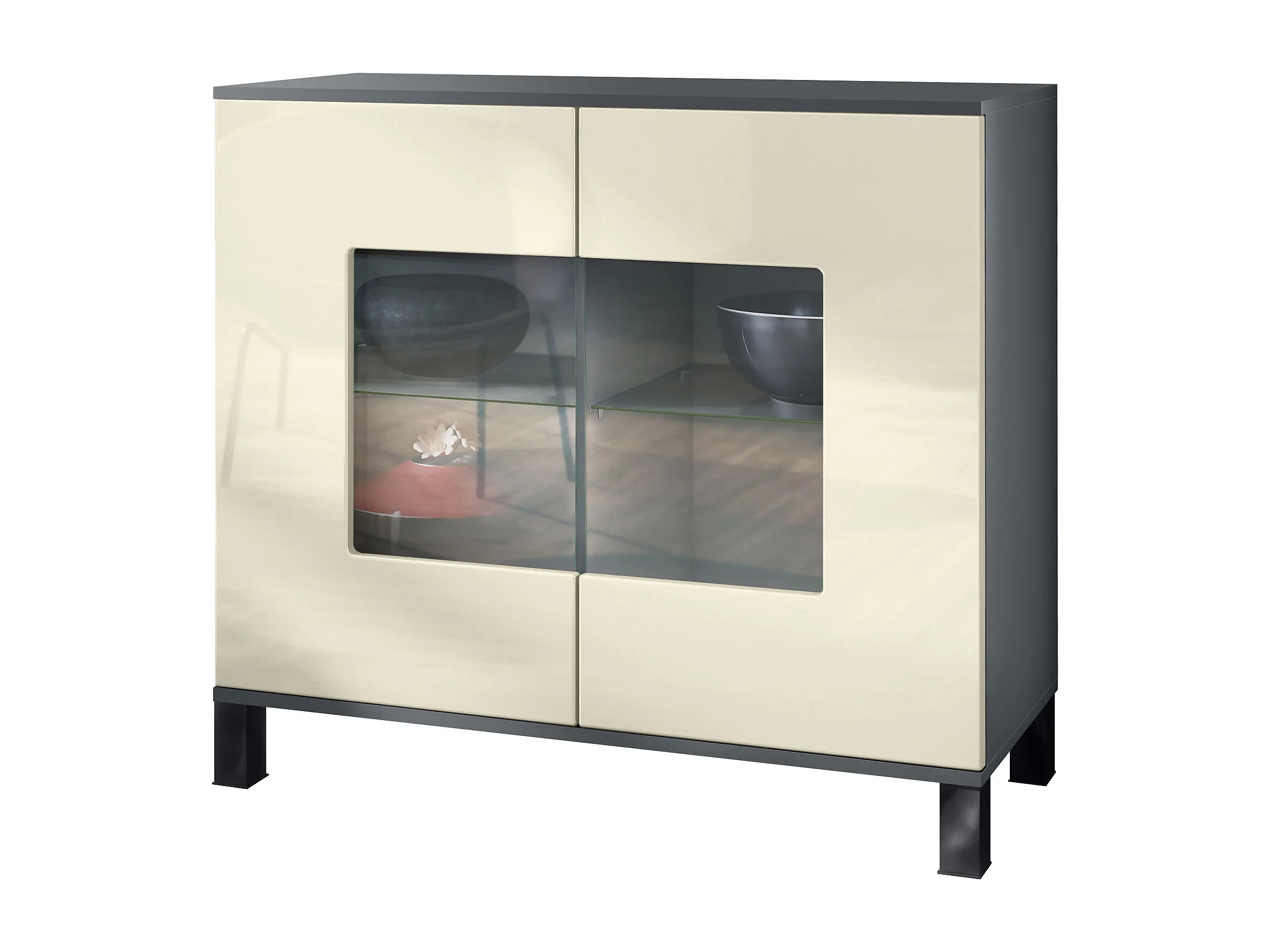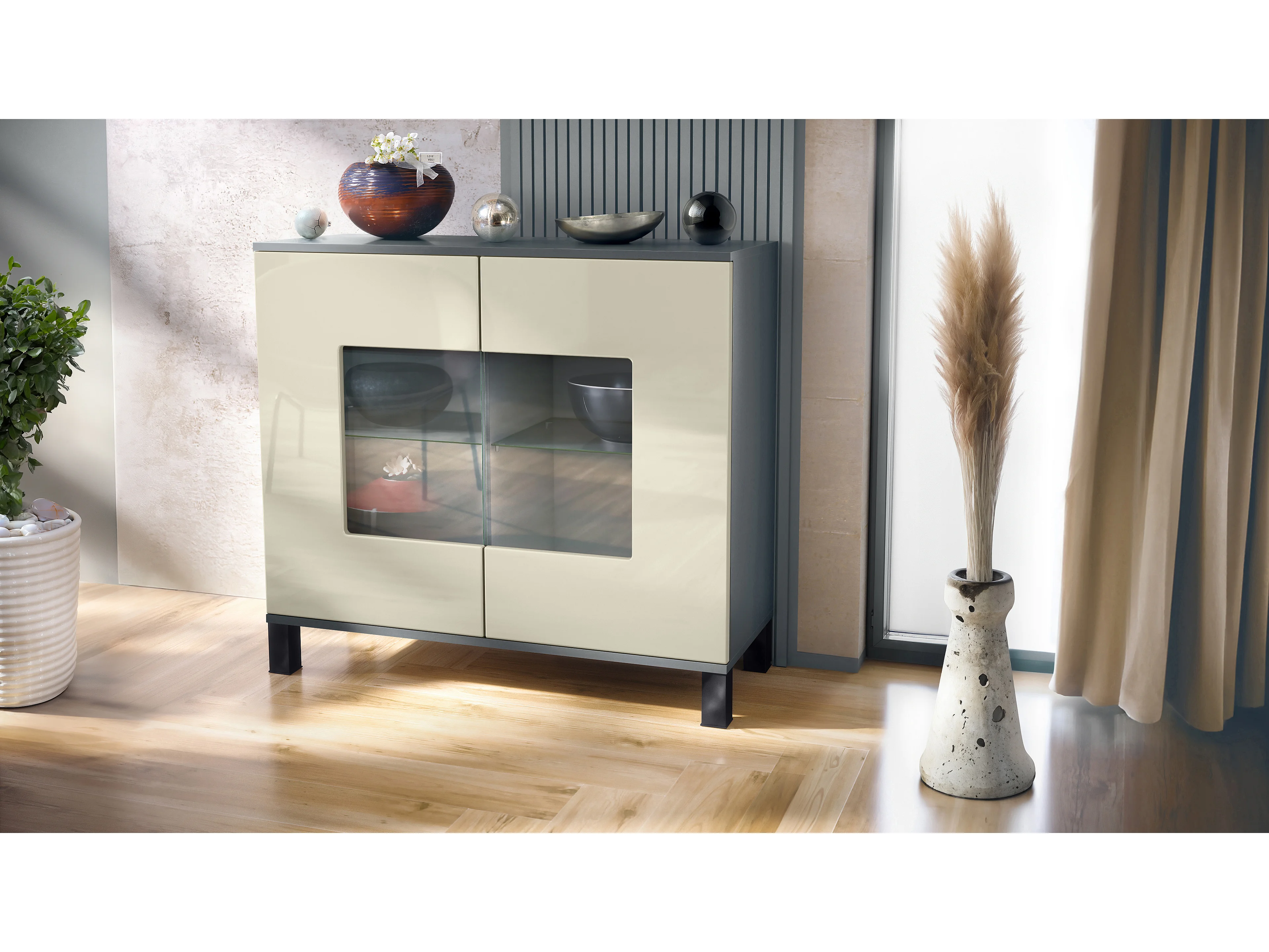 Commode Grömitz V3, Armoire de cuisine moderne avec 2 grandes portes vitrées anthracite mat / crème haute brillance (92,5 x 84.5 x 35)