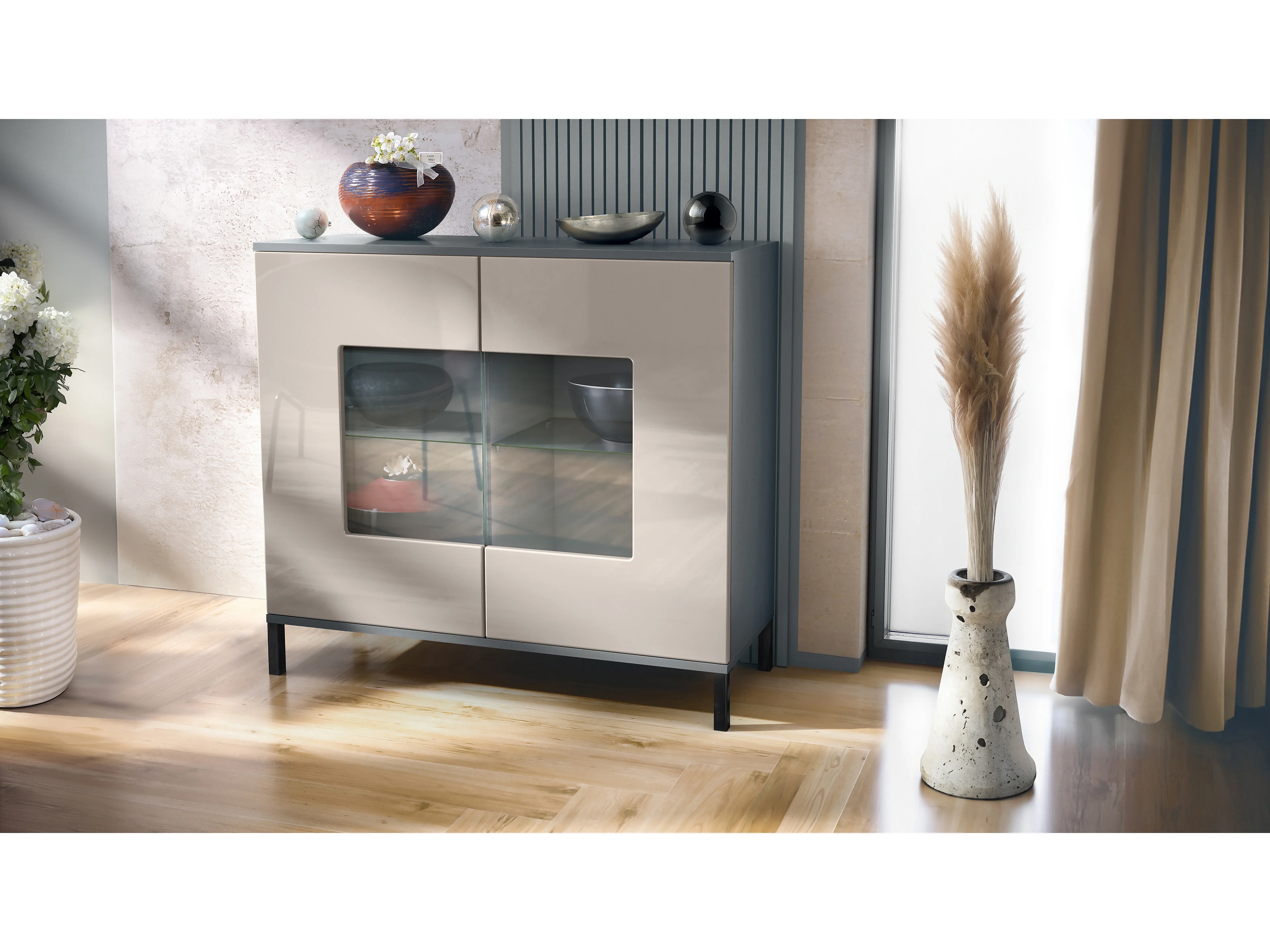 Commode Grömitz V3, Armoire de cuisine moderne avec 2 grandes portes vitrées anthracite mat / gris sable haute brillance (92,5 x 83.5 x 35)