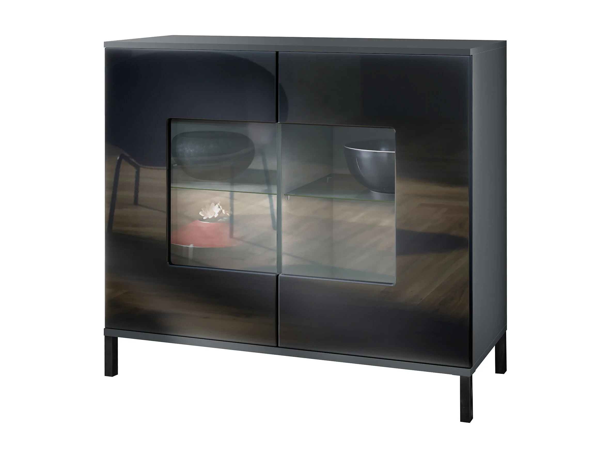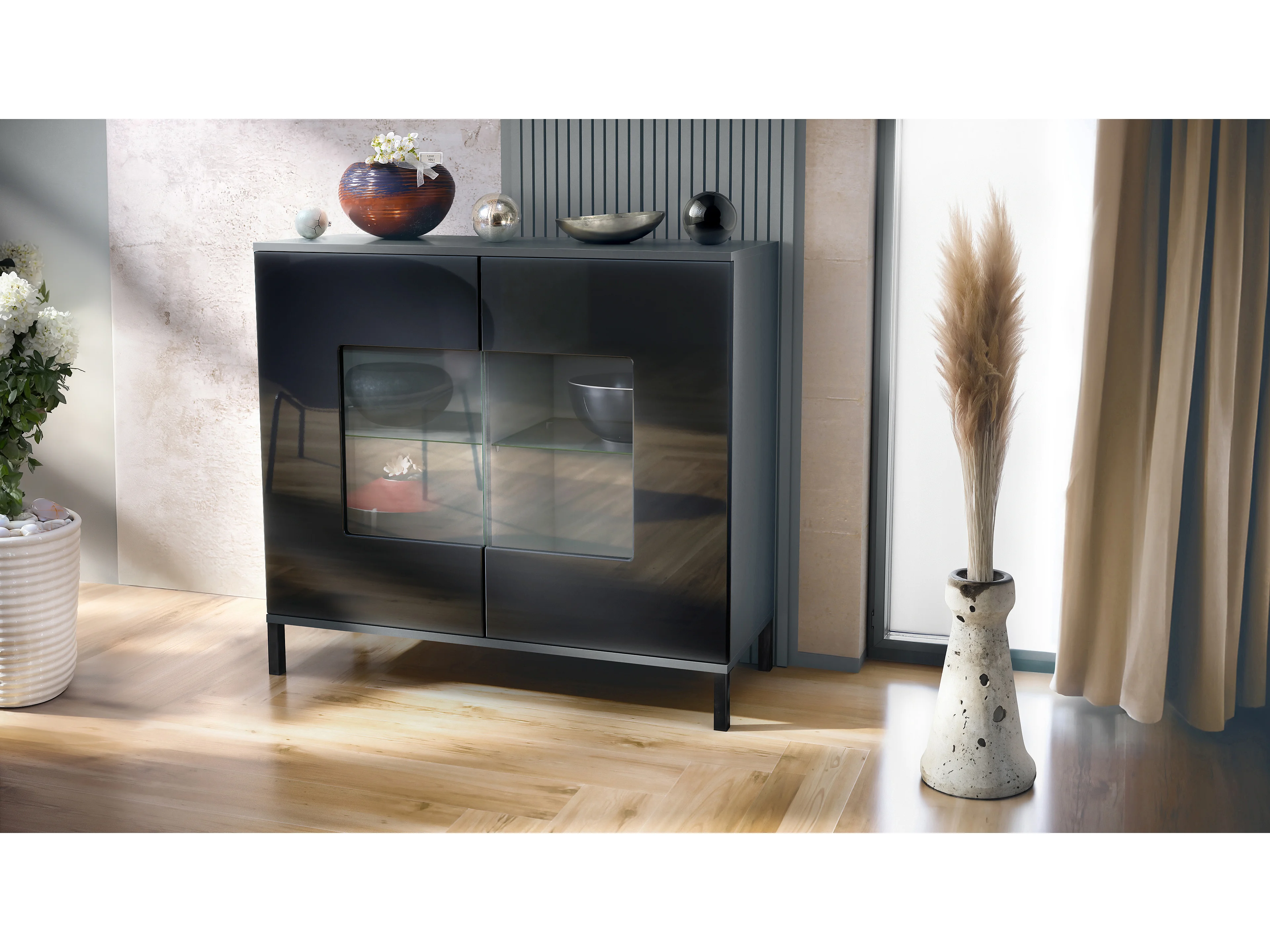 Commode Grömitz V3, Armoire de cuisine moderne avec 2 grandes portes vitrées anthracite mat / noir haute brillance (92,5 x 83.5 x 35)