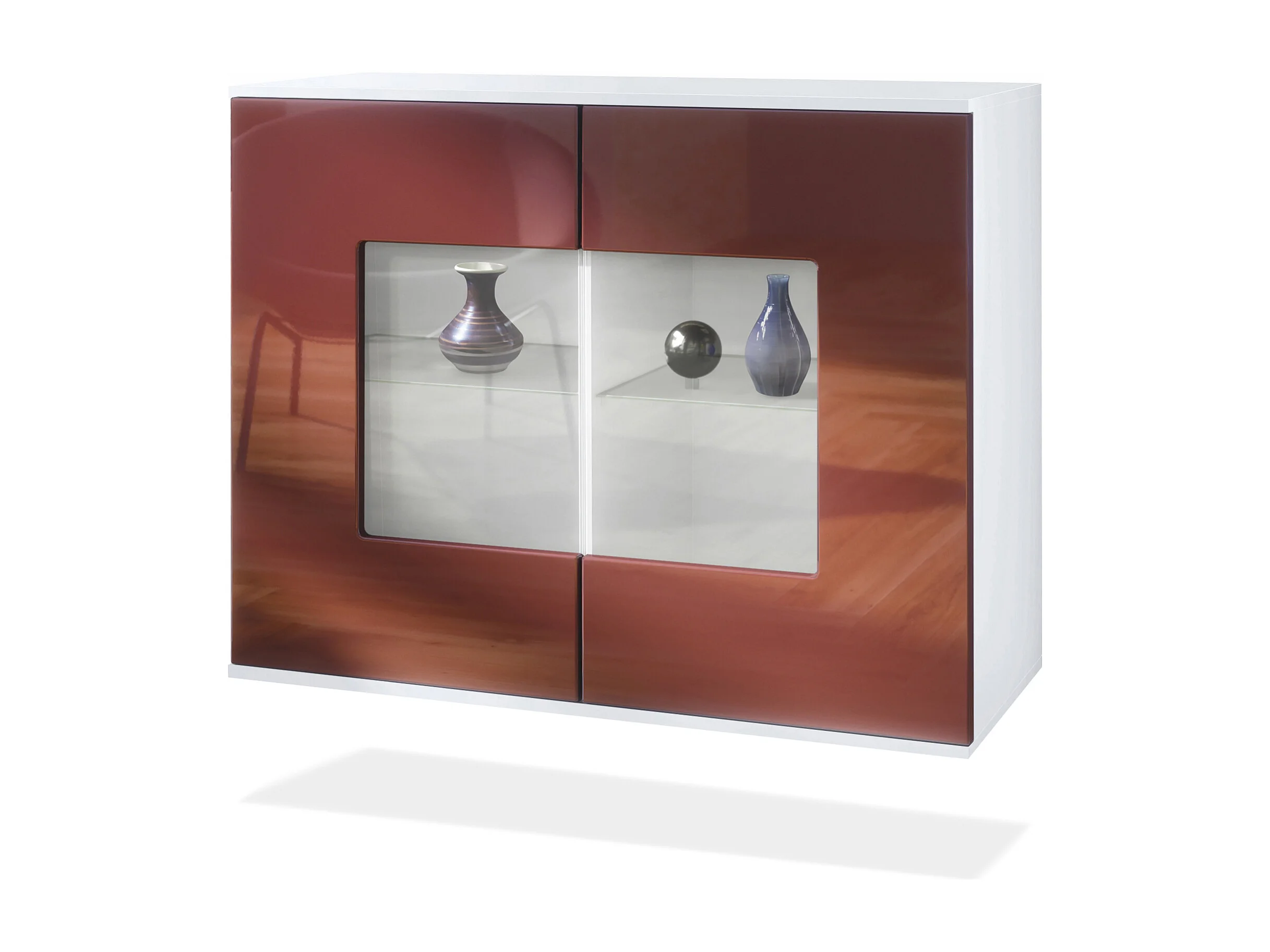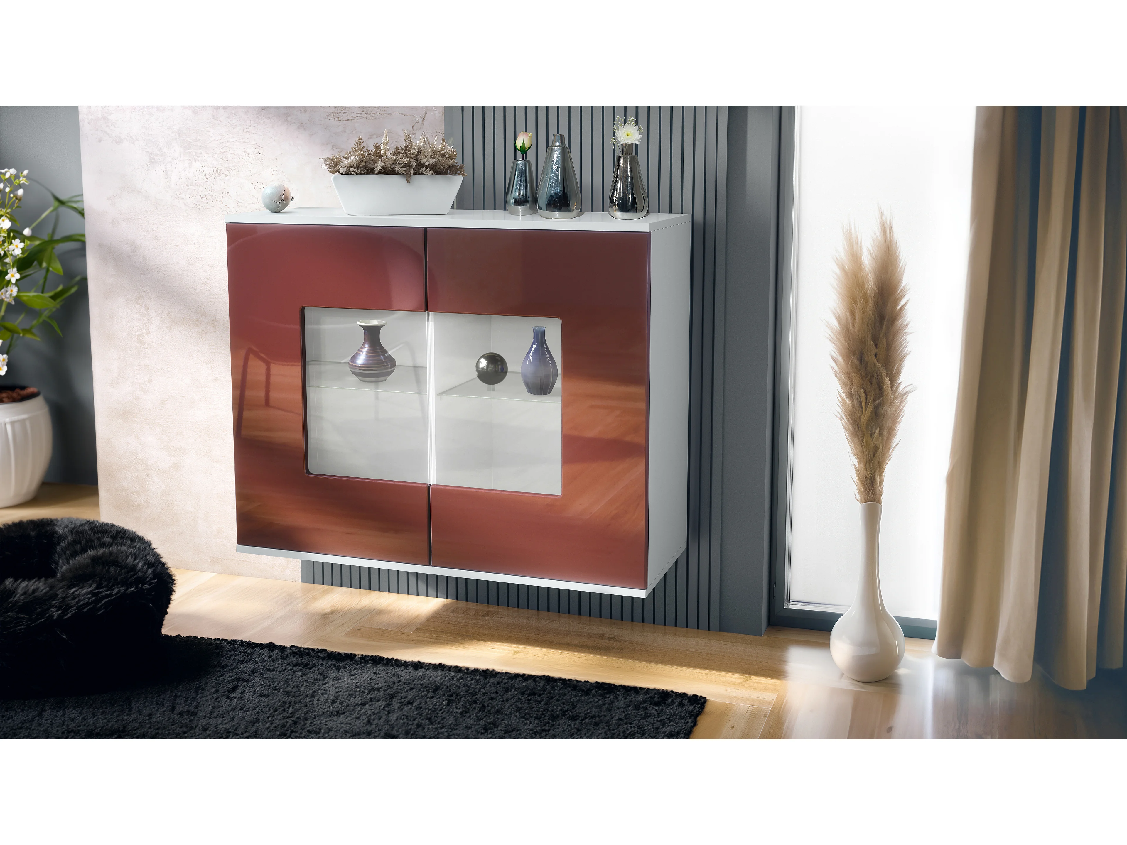 Commode Grömitz V3, Armoire de cuisine moderne avec 2 grandes portes vitrées blanc mat / bordeaux haute brillance (92,5 x 73.5 x 35)