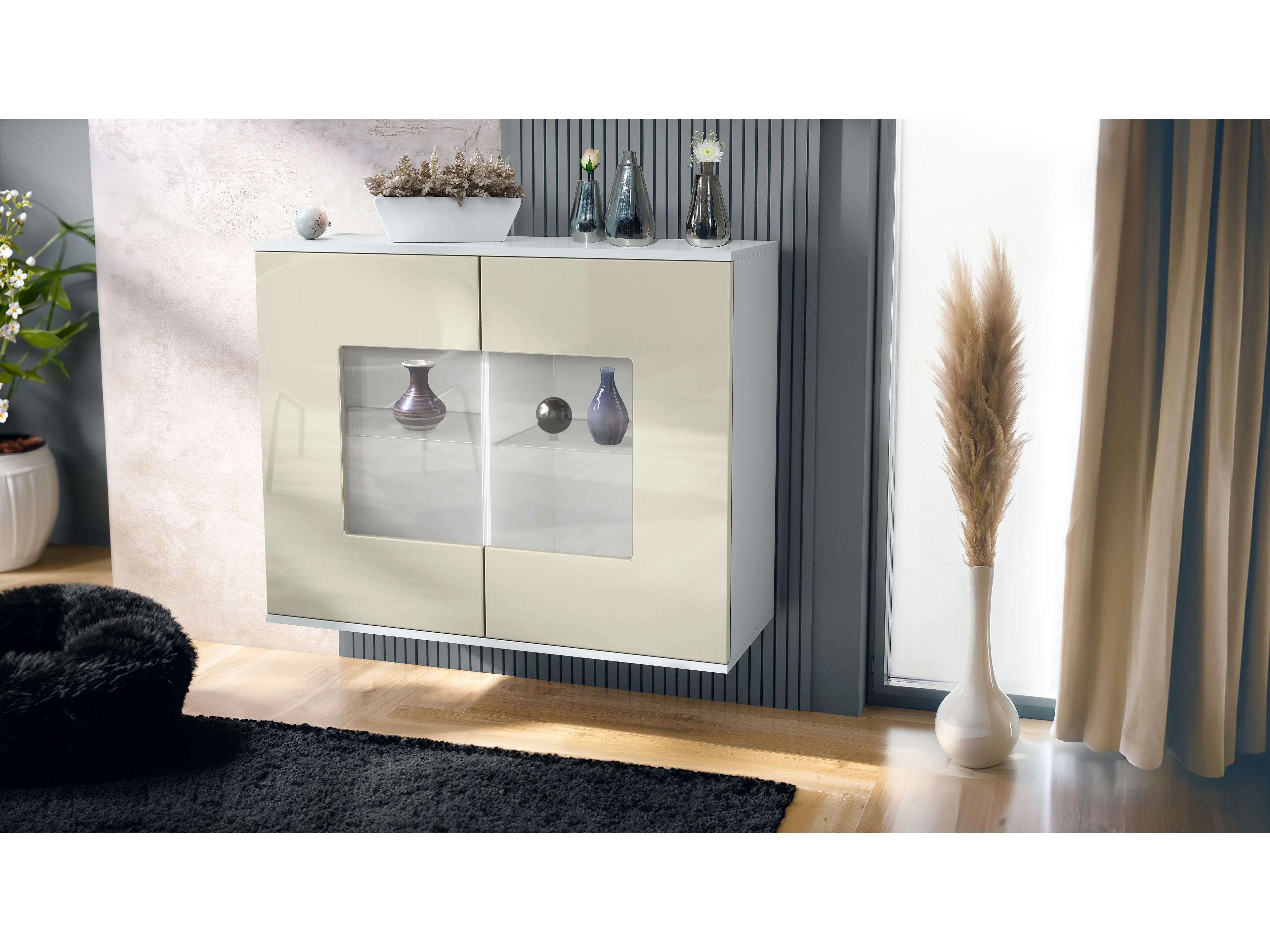 Commode Grömitz V3, Armoire de cuisine moderne avec 2 grandes portes vitrées blanc mat / crème haute brillance (92,5 x 73.5 x 35)
