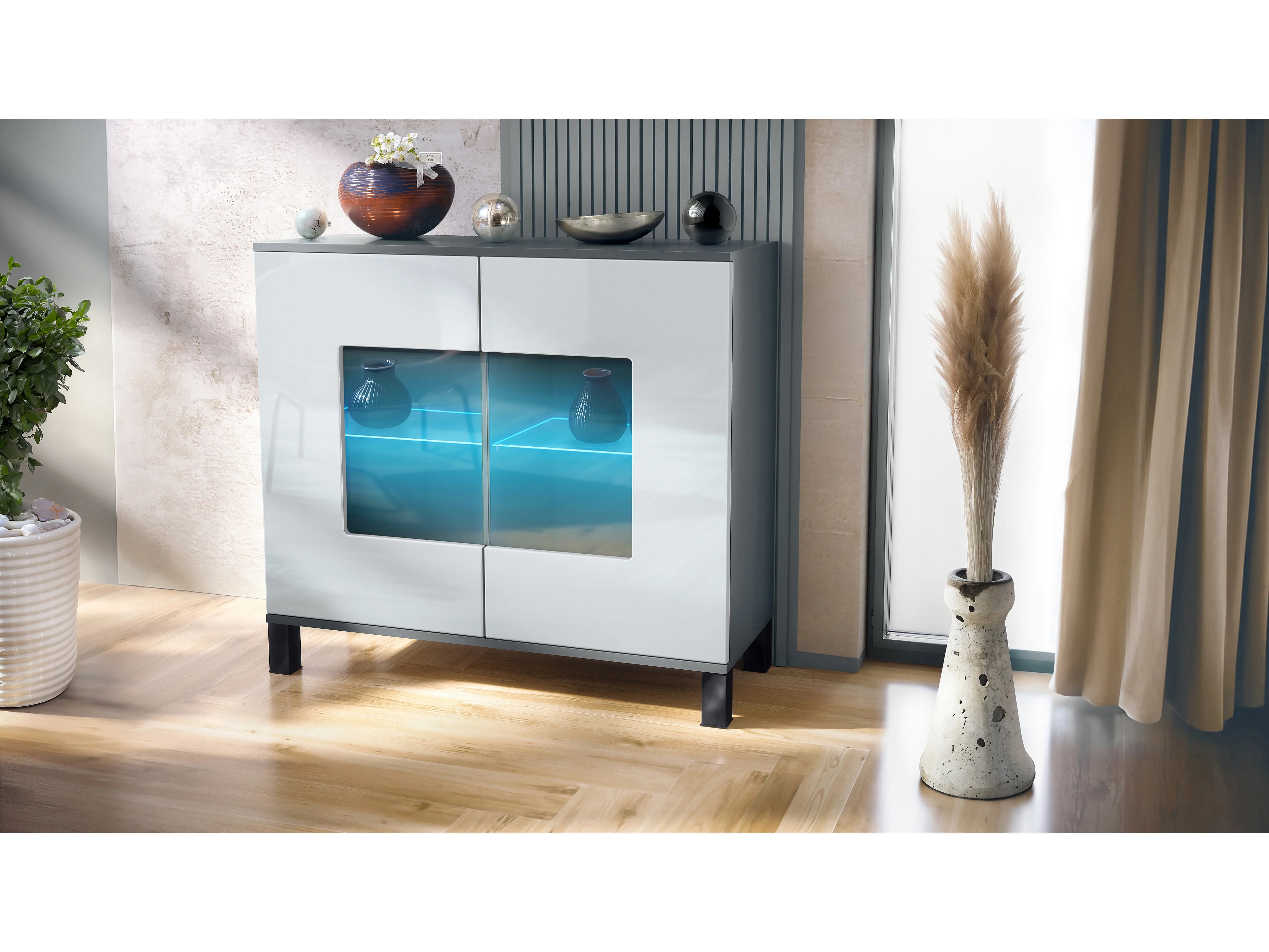 Commode Grömitz V3, Armoire de cuisine moderne avec 2 grandes portes vitrées incl. éclairage RGB anthracite mat / blanc haute brillance (92,5 x 84.5 x 35)