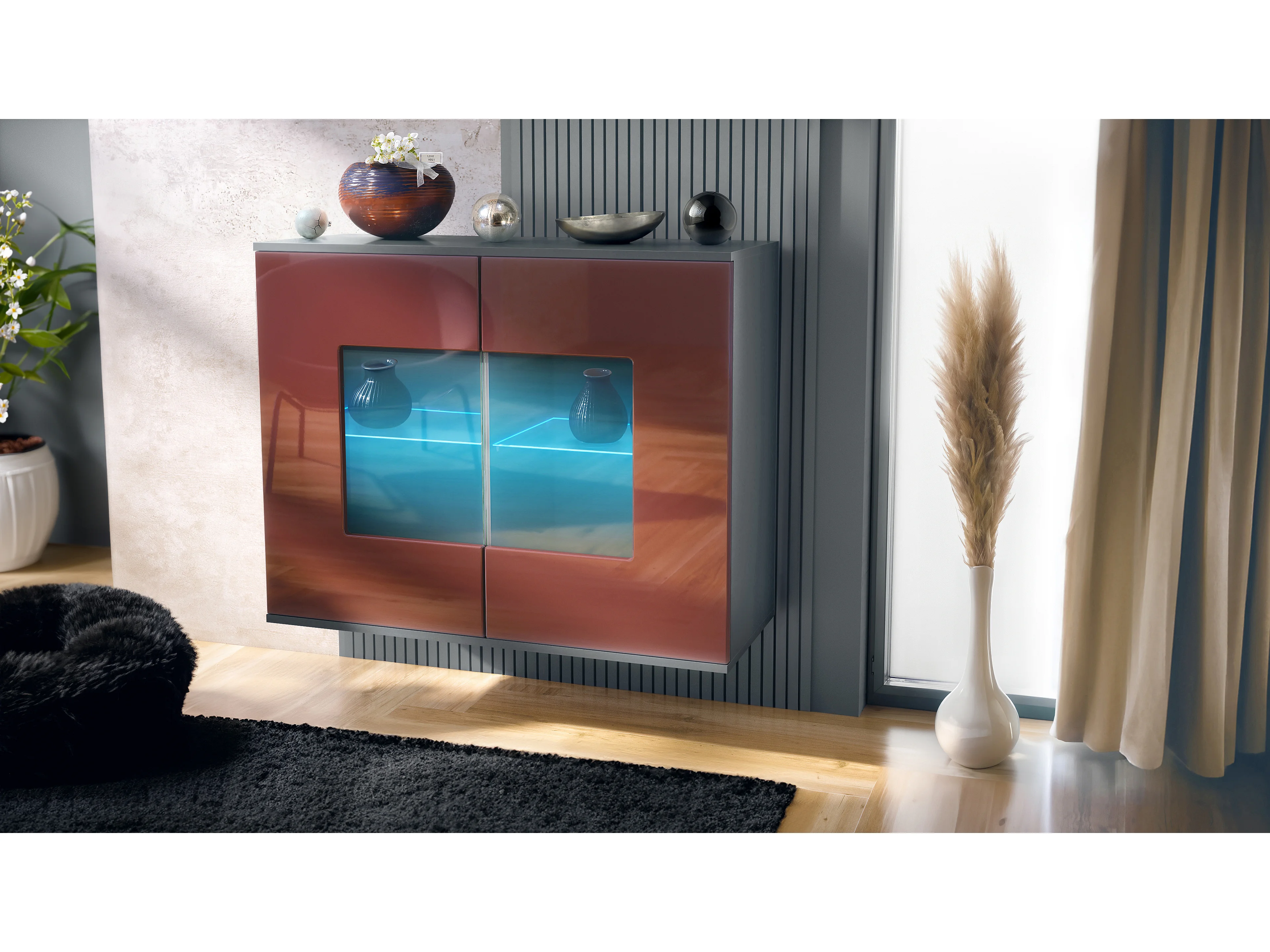 Commode Grömitz V3, Armoire de cuisine moderne avec 2 grandes portes vitrées incl. éclairage RGB anthracite mat / bordeaux haute brillance (92,5 x 73.5 x 35)