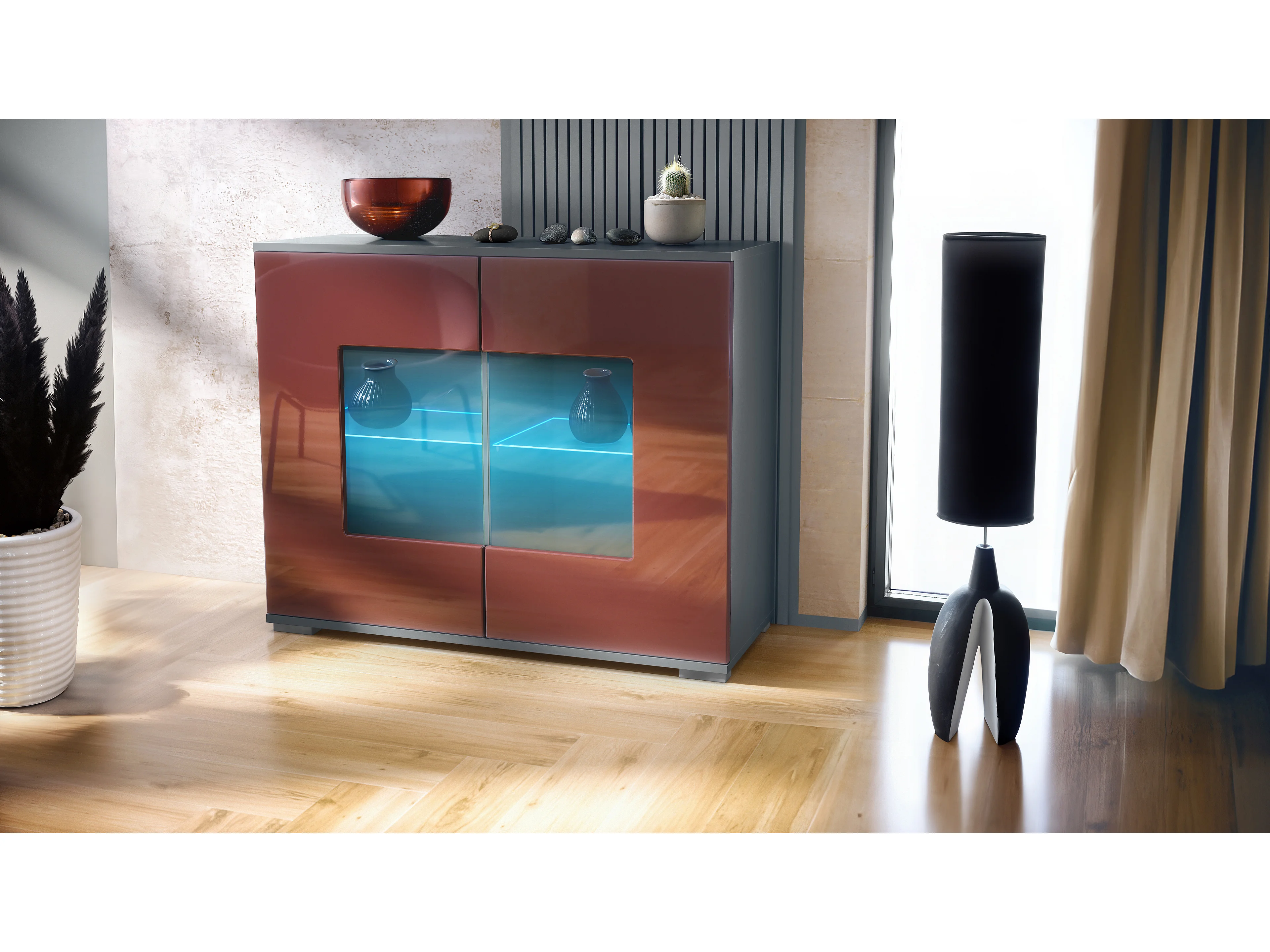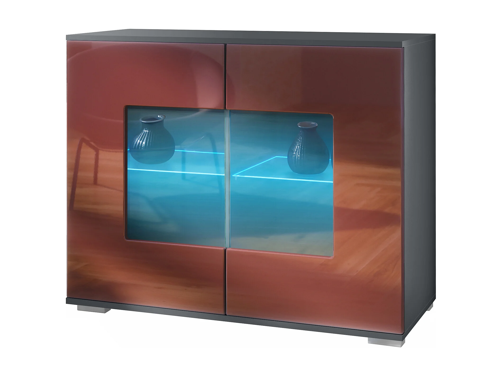 Commode Grömitz V3, Armoire de cuisine moderne avec 2 grandes portes vitrées incl. éclairage RGB anthracite mat / bordeaux haute brillance (92,5 x 75.5 x 35)