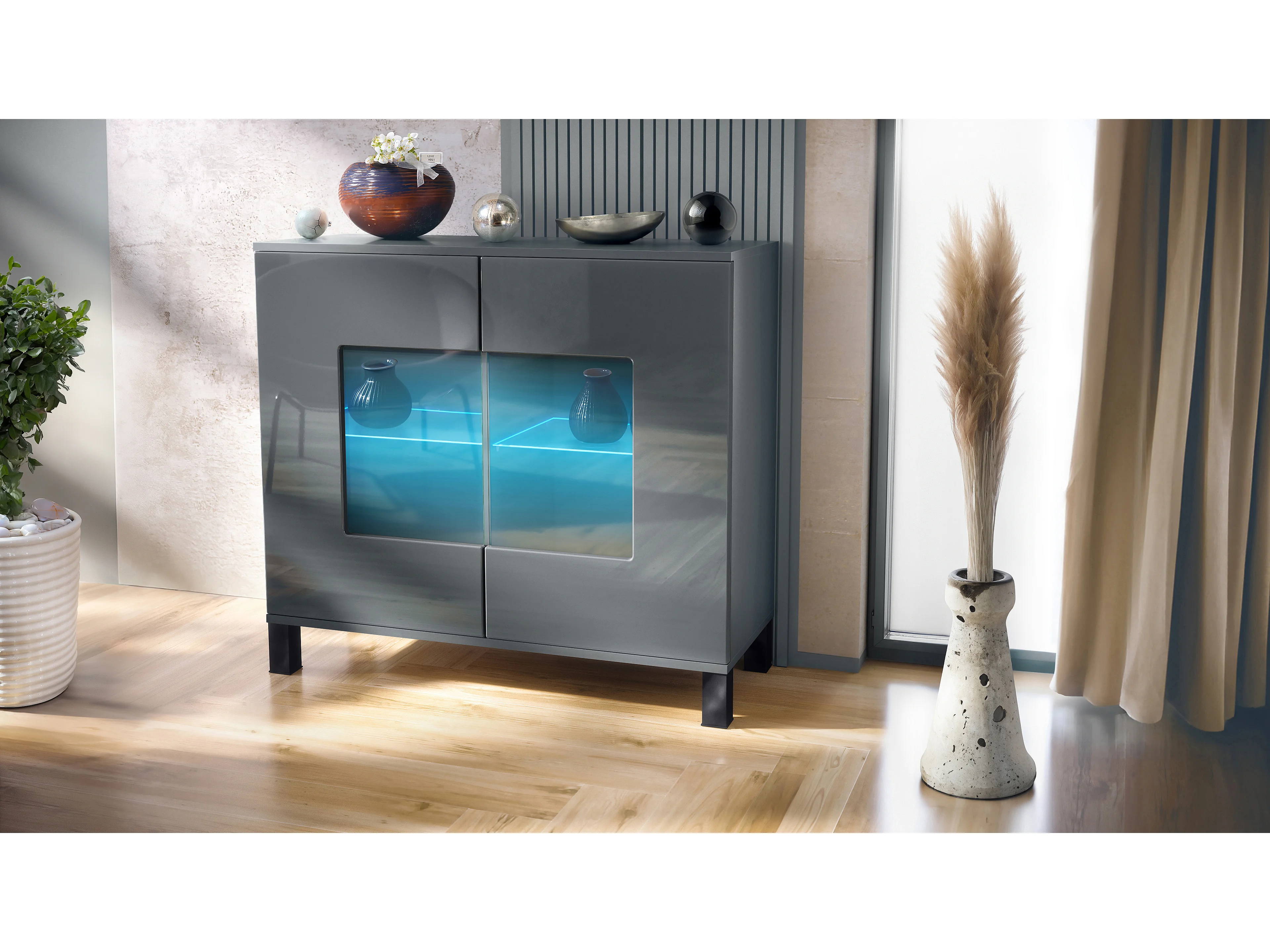 Commode Grömitz V3, Armoire de cuisine moderne avec 2 grandes portes vitrées incl. éclairage RGB anthracite mat / gris haute brillance (92,5 x 84.5 x 35)