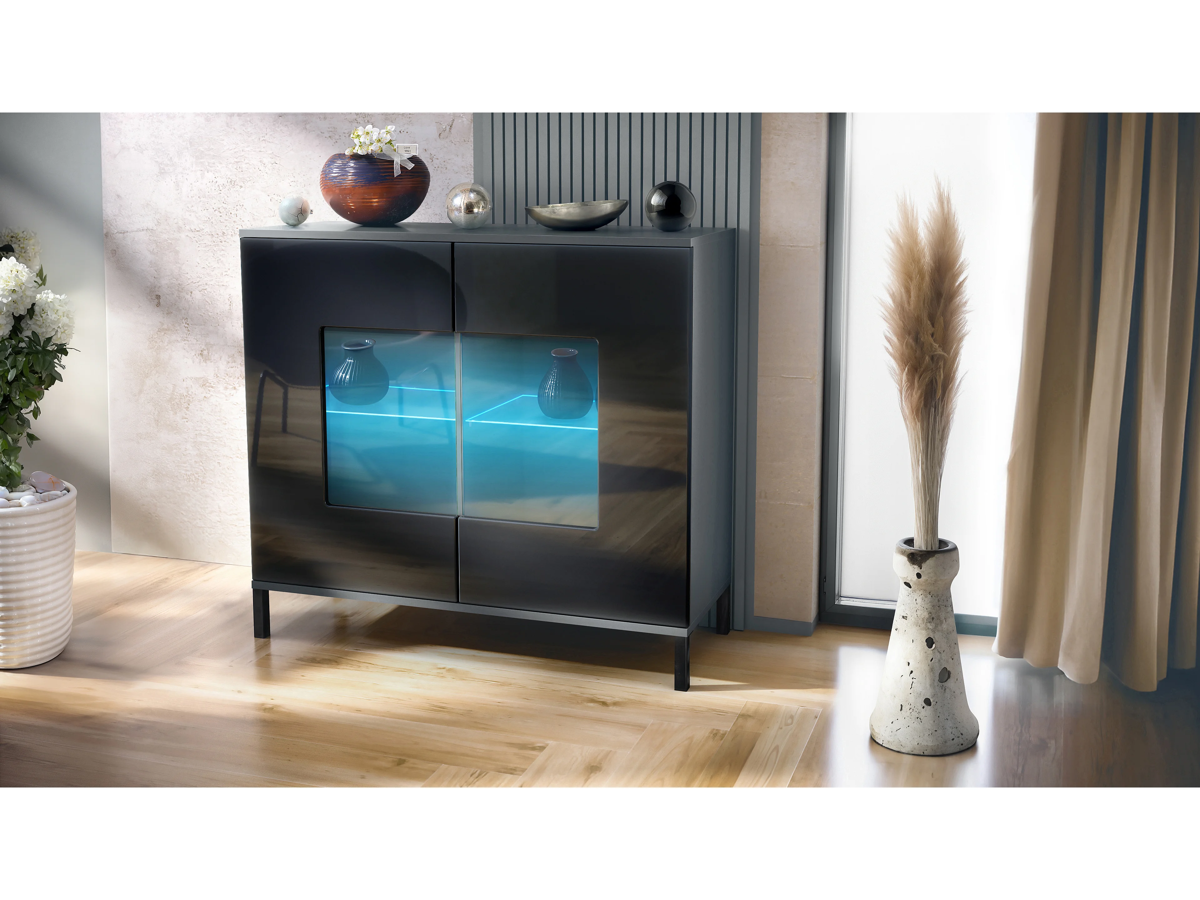 Commode Grömitz V3, Armoire de cuisine moderne avec 2 grandes portes vitrées incl. éclairage RGB anthracite mat / noir haute brillance (92,5 x 83.5 x 35)