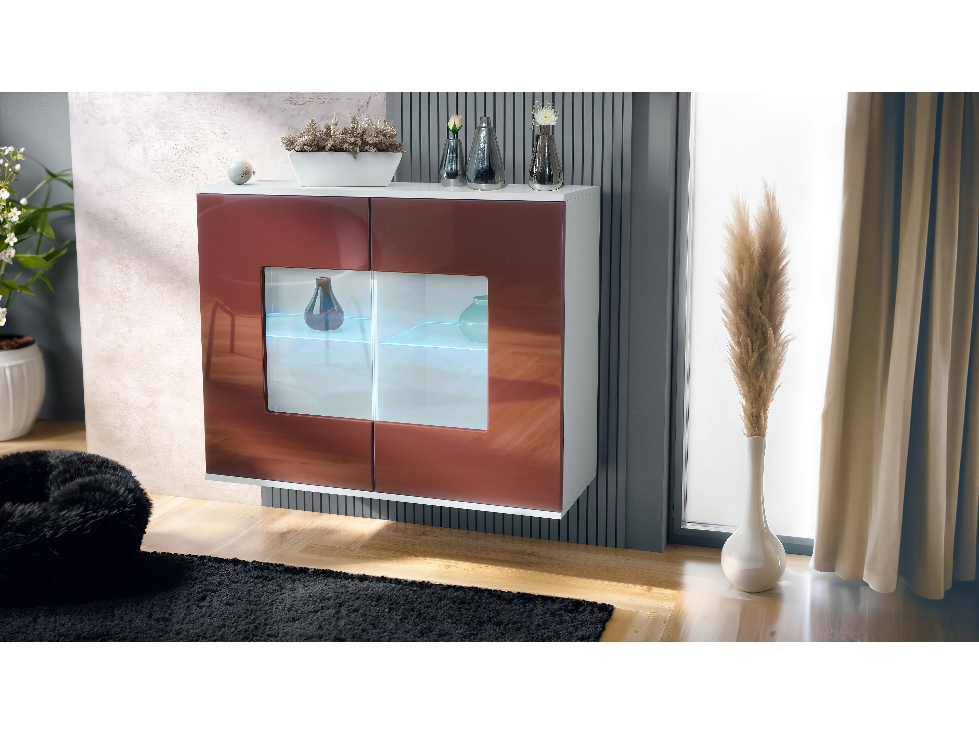 Commode Grömitz V3, Armoire de cuisine moderne avec 2 grandes portes vitrées incl. éclairage RGB blanc mat / bordeaux haute brillance (92,5 x 73.5 x 35)