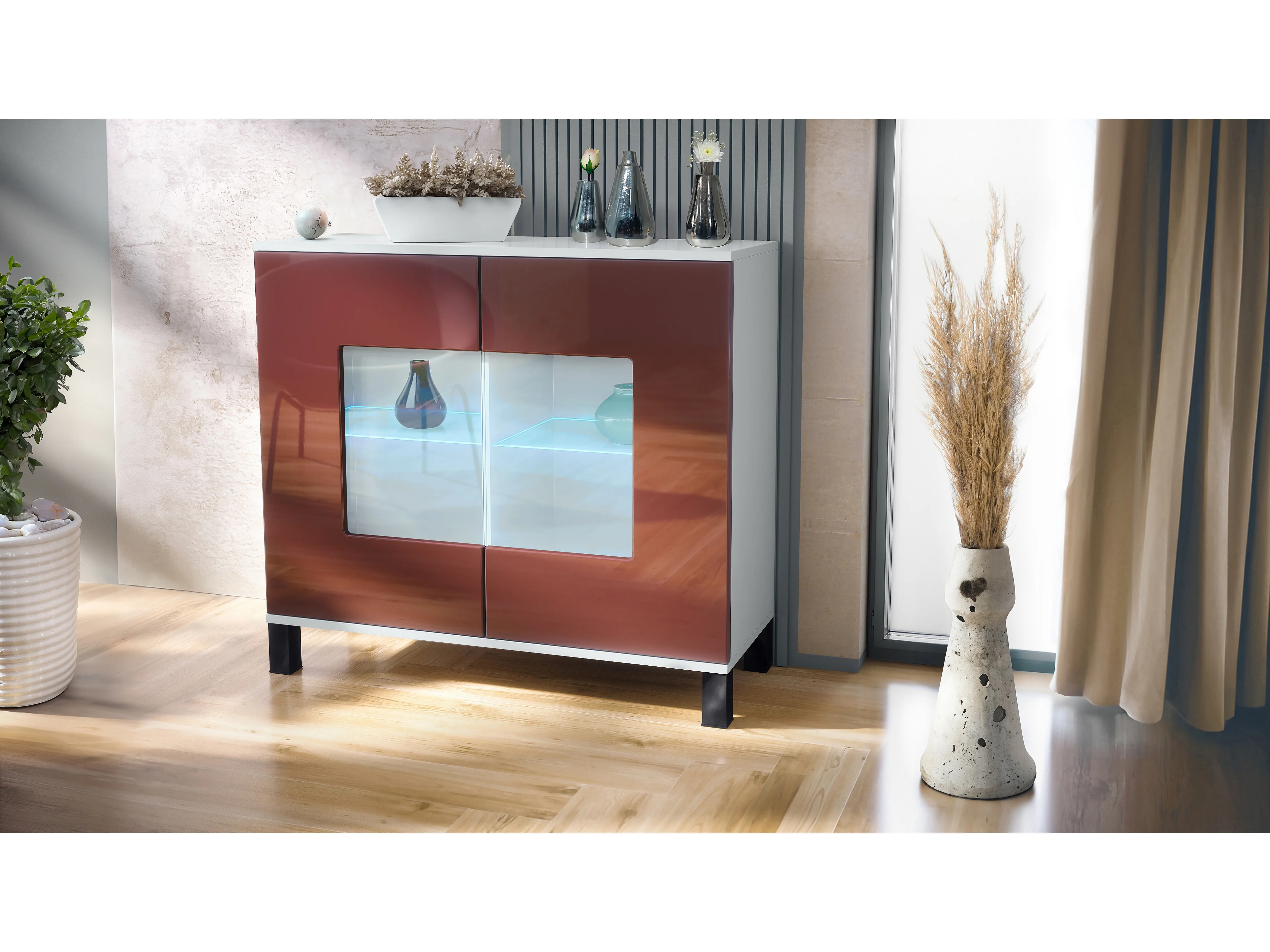 Commode Grömitz V3, Armoire de cuisine moderne avec 2 grandes portes vitrées incl. éclairage RGB blanc mat / bordeaux haute brillance (92,5 x 84.5 x 35)