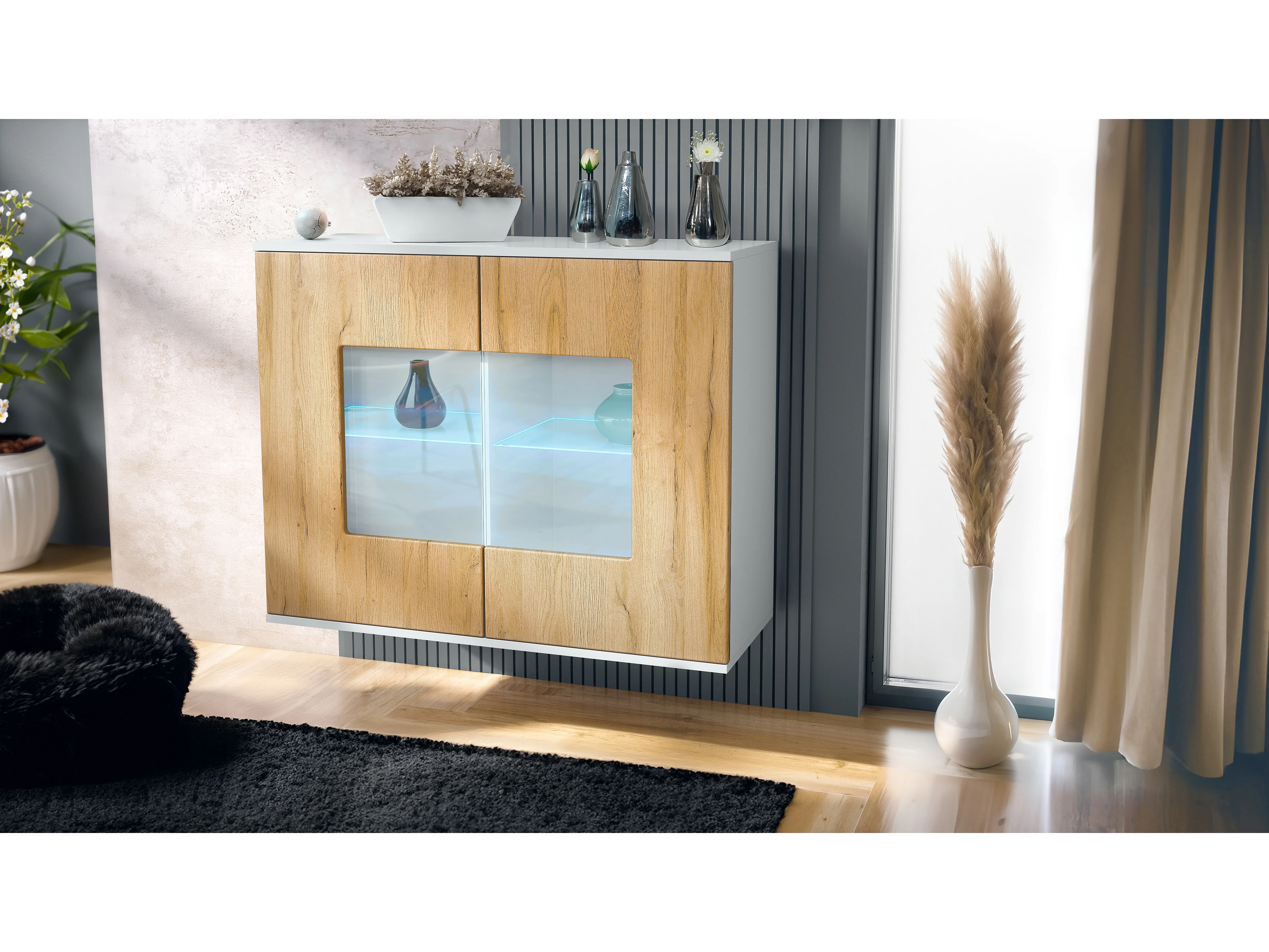 Commode Grömitz V3, Armoire de cuisine moderne avec 2 grandes portes vitrées incl. éclairage RGB blanc mat / chêne nature (92,5 x 73.5 x 35)