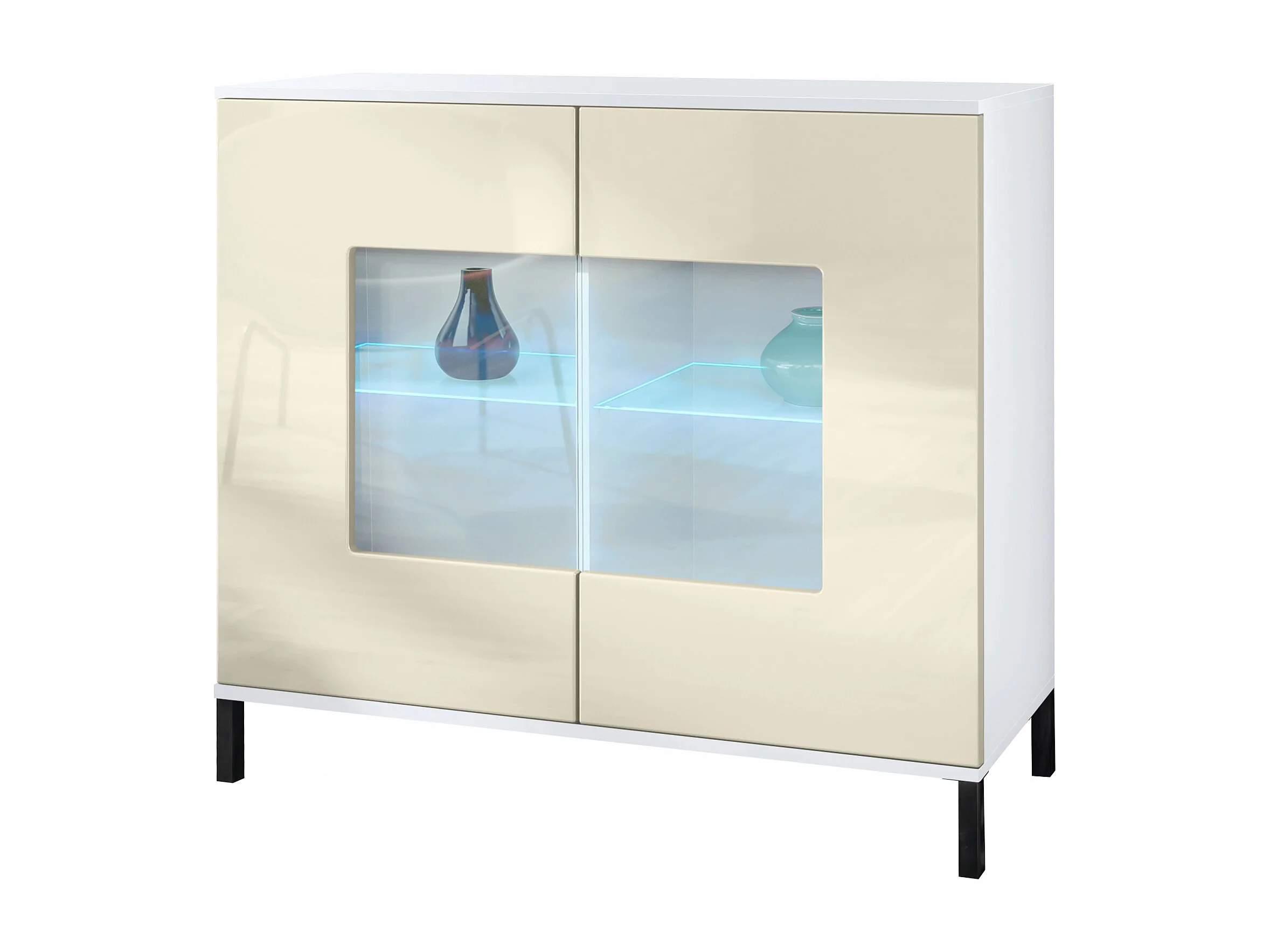 Commode Grömitz V3, Armoire de cuisine moderne avec 2 grandes portes vitrées incl. éclairage RGB blanc mat / crème haute brillance (92,5 x 83.5 x 35)