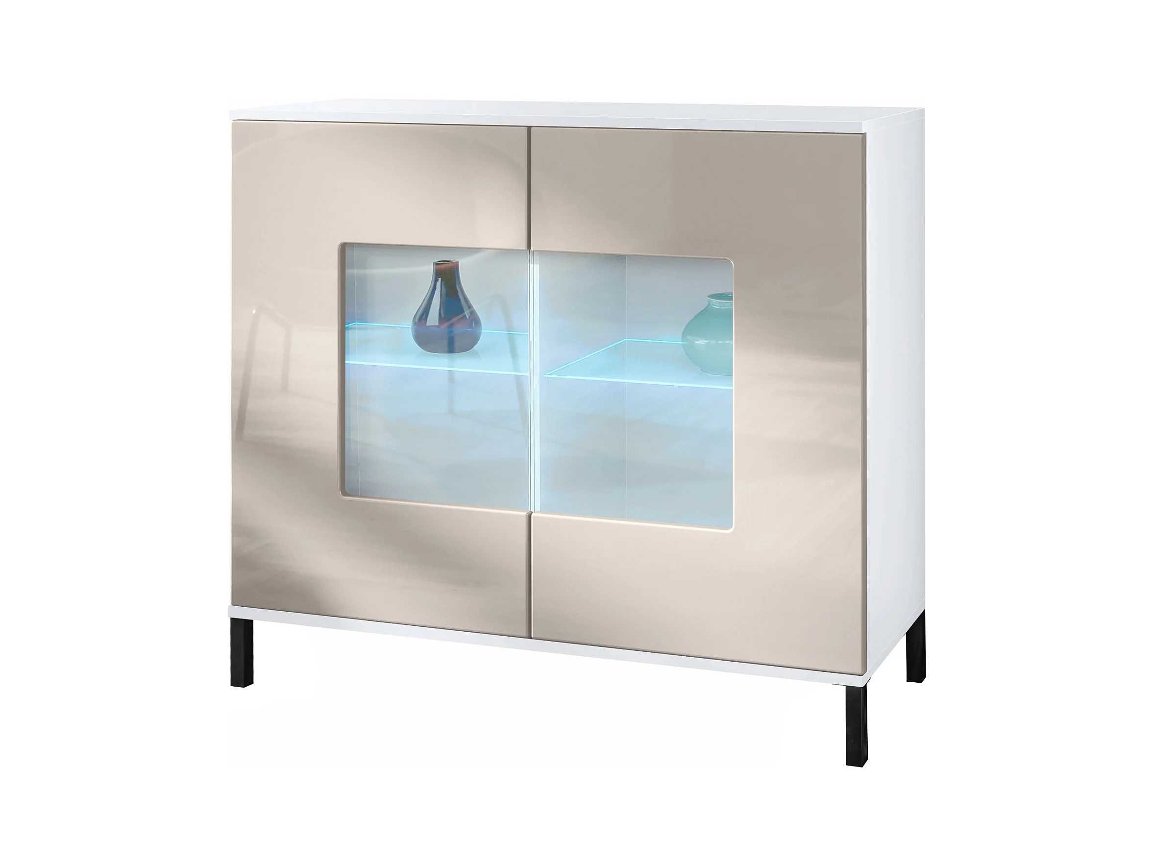 Commode Grömitz V3, Armoire de cuisine moderne avec 2 grandes portes vitrées incl. éclairage RGB blanc mat / gris sable haute brillance (92,5 x 83.5 x 35)