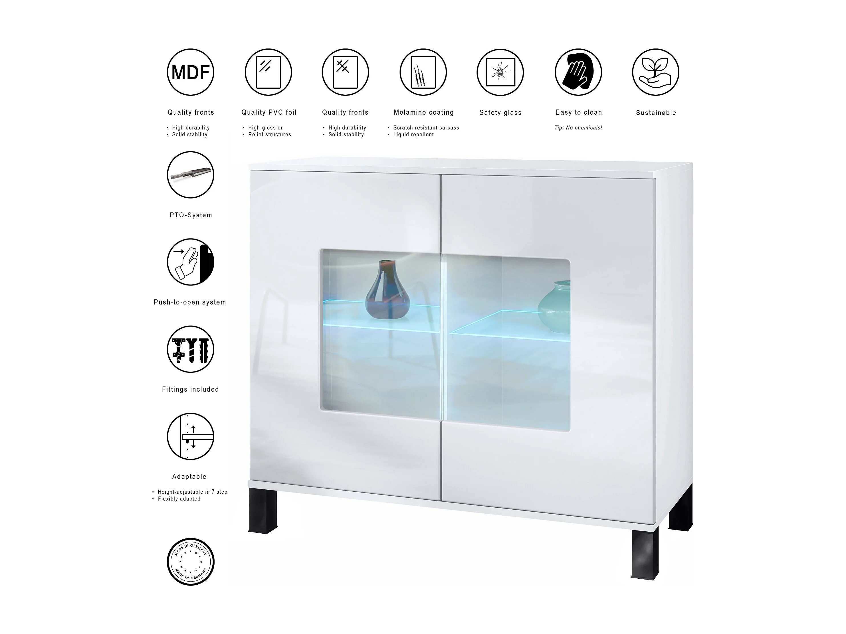 Commode Grömitz V3, Armoire de cuisine moderne avec 2 grandes portes vitrées incl. éclairage RGB blanc mat / gris sable haute brillance (92,5 x 84.5 x 35)