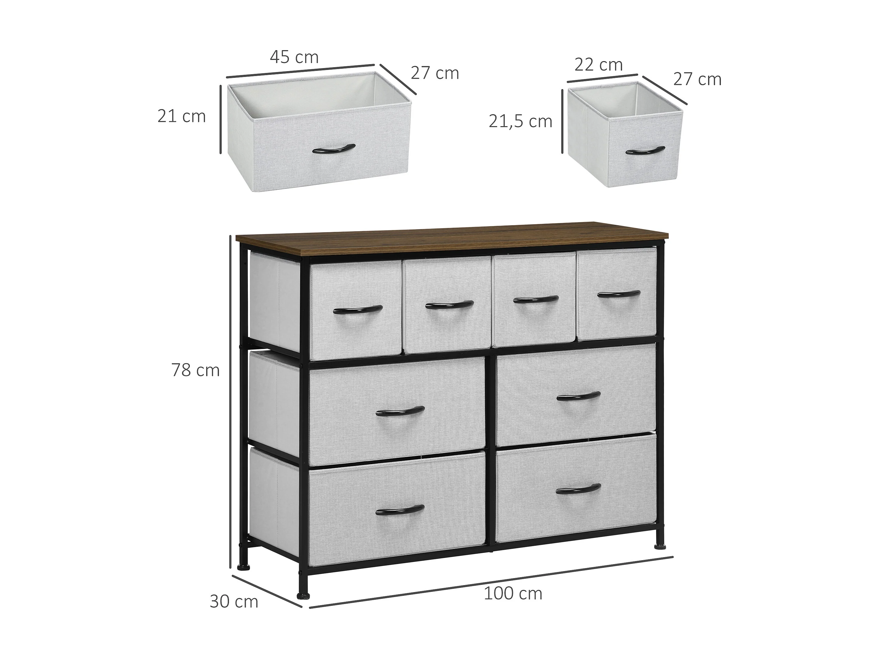 Commode meuble de rangement 8 tiroirs - dim. 100L x 30l x 78H cm - structure acier noir tissu pliant gris